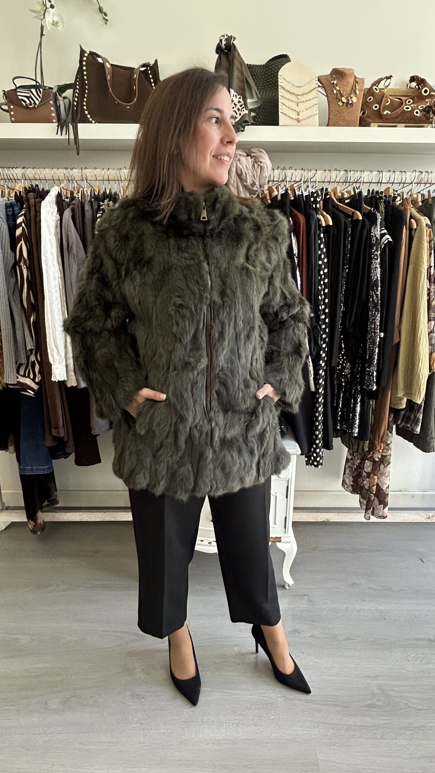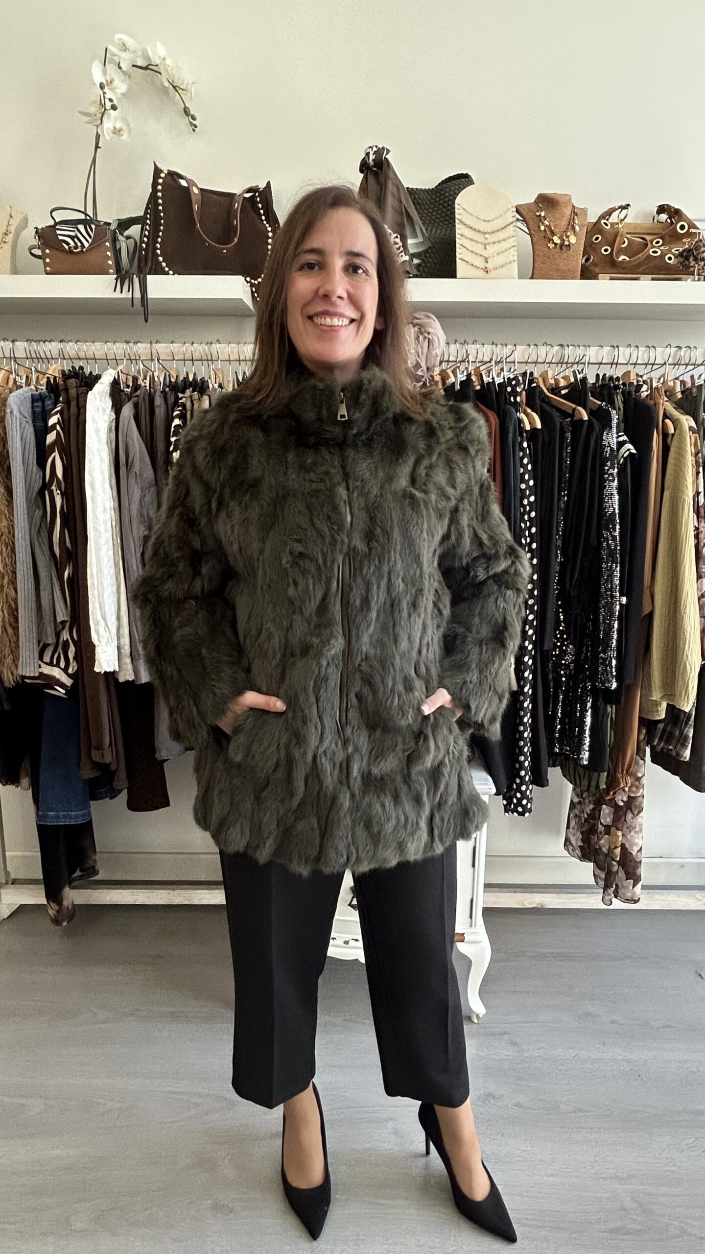 Abrigo de pelo de conejo en color verde. Cierre frontal con cremallera y cuello alto. Forro interior. Bolsillos en los lados.