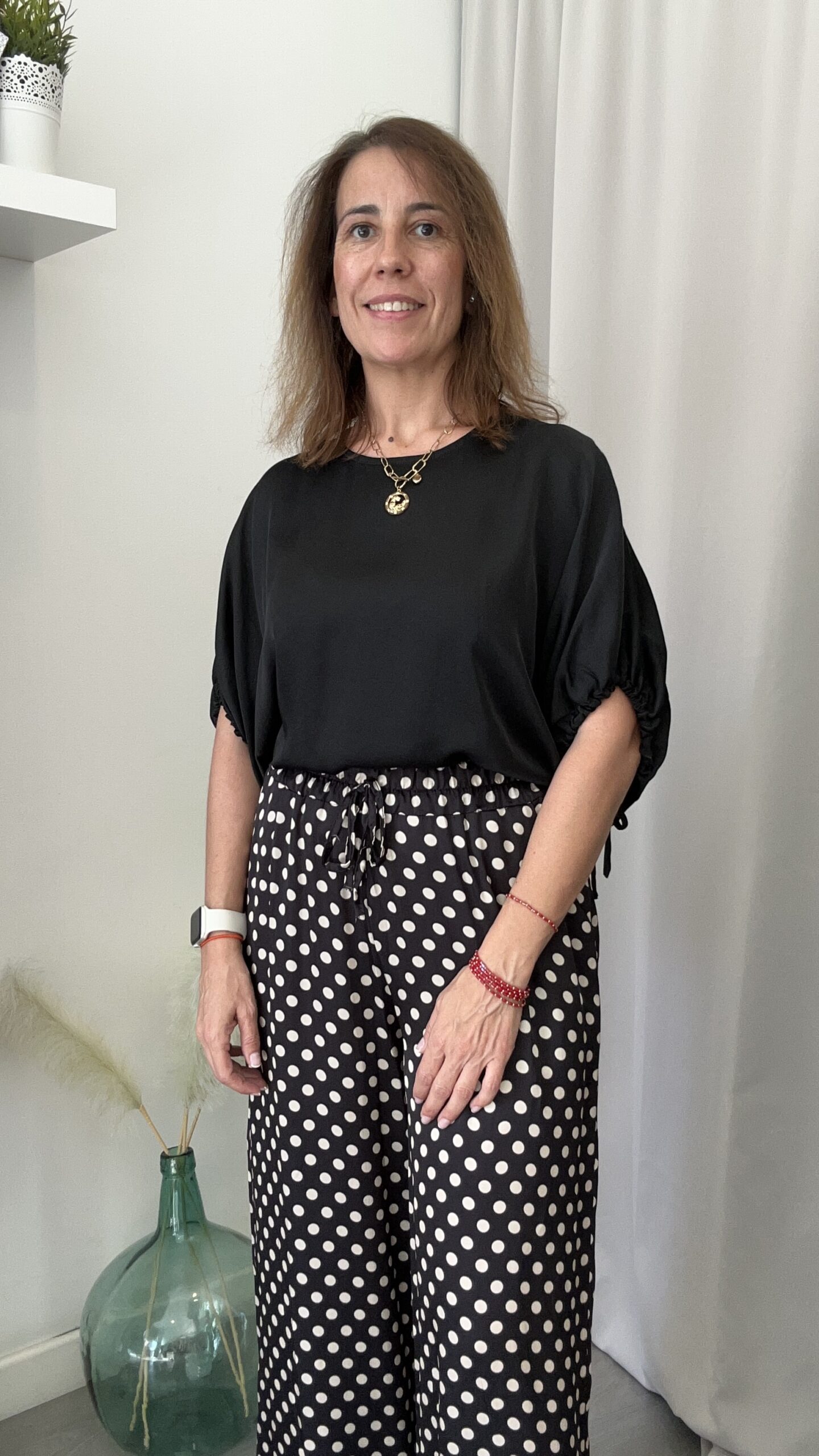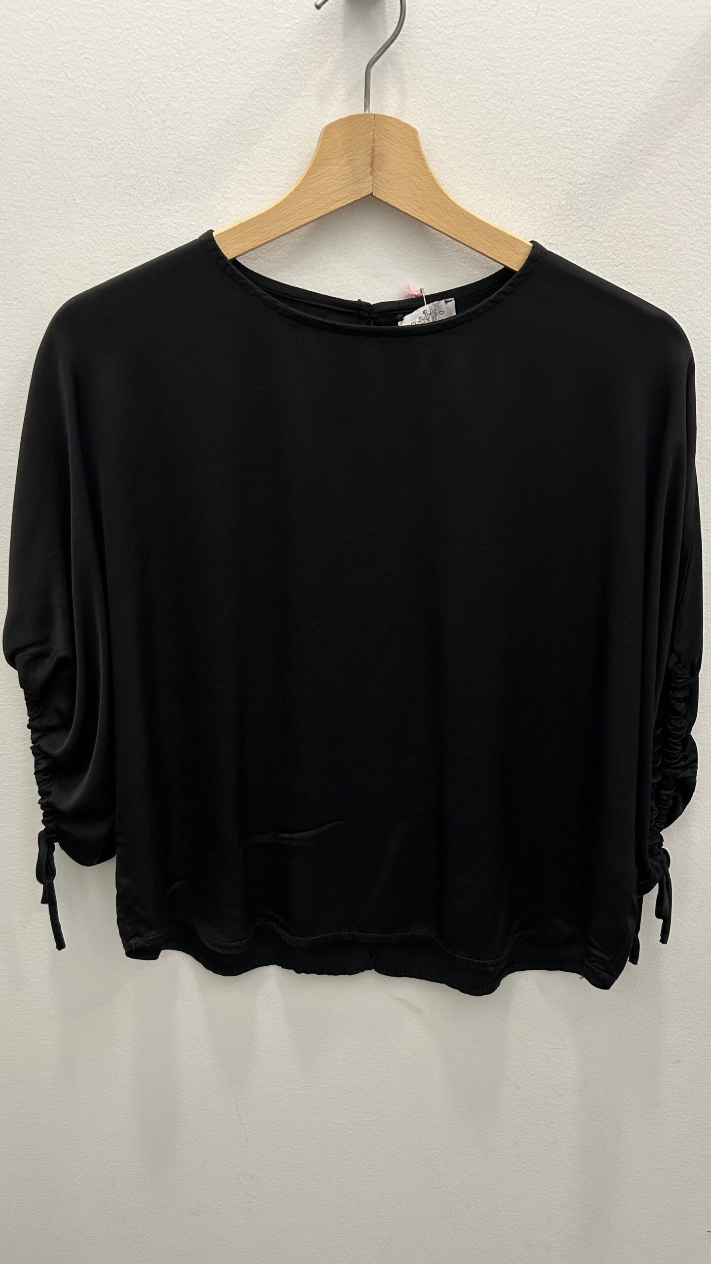 Blusa en tejido efecto raso de manga al codo con lazo ajustable en la manga. Cuello barco.Talla única (desde la 36 hasta la 40). Disponible también en estampado de flores Marrón