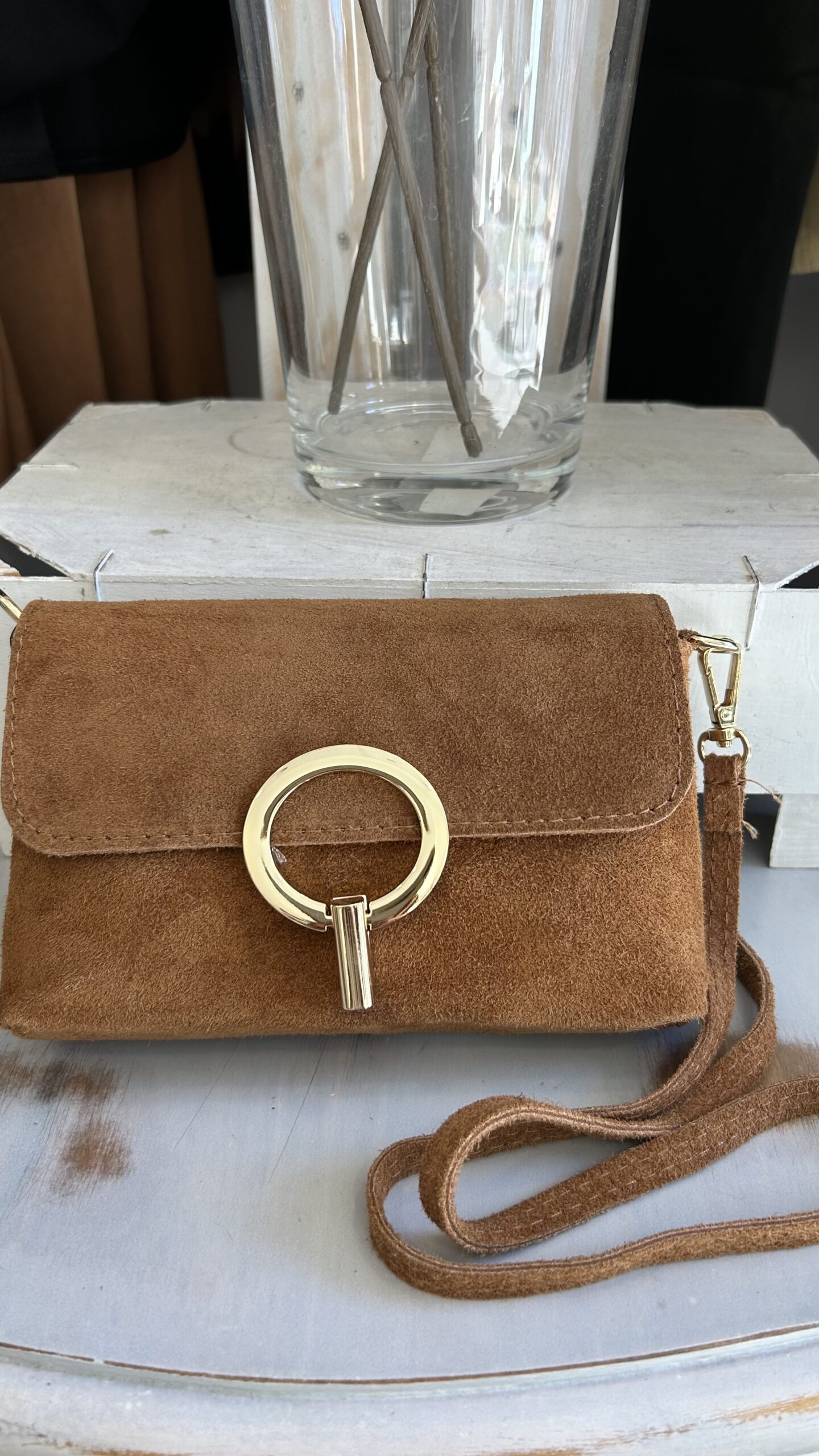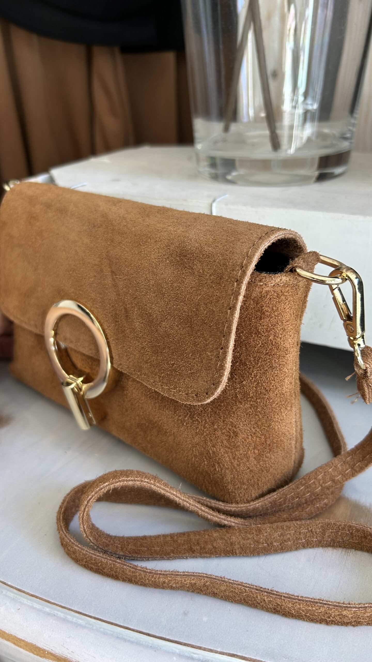 Bolso de serraje con hebilla dorada en la solapa. Asa ajustable para llevarlo más corto o largo. Tamaño pequeño.