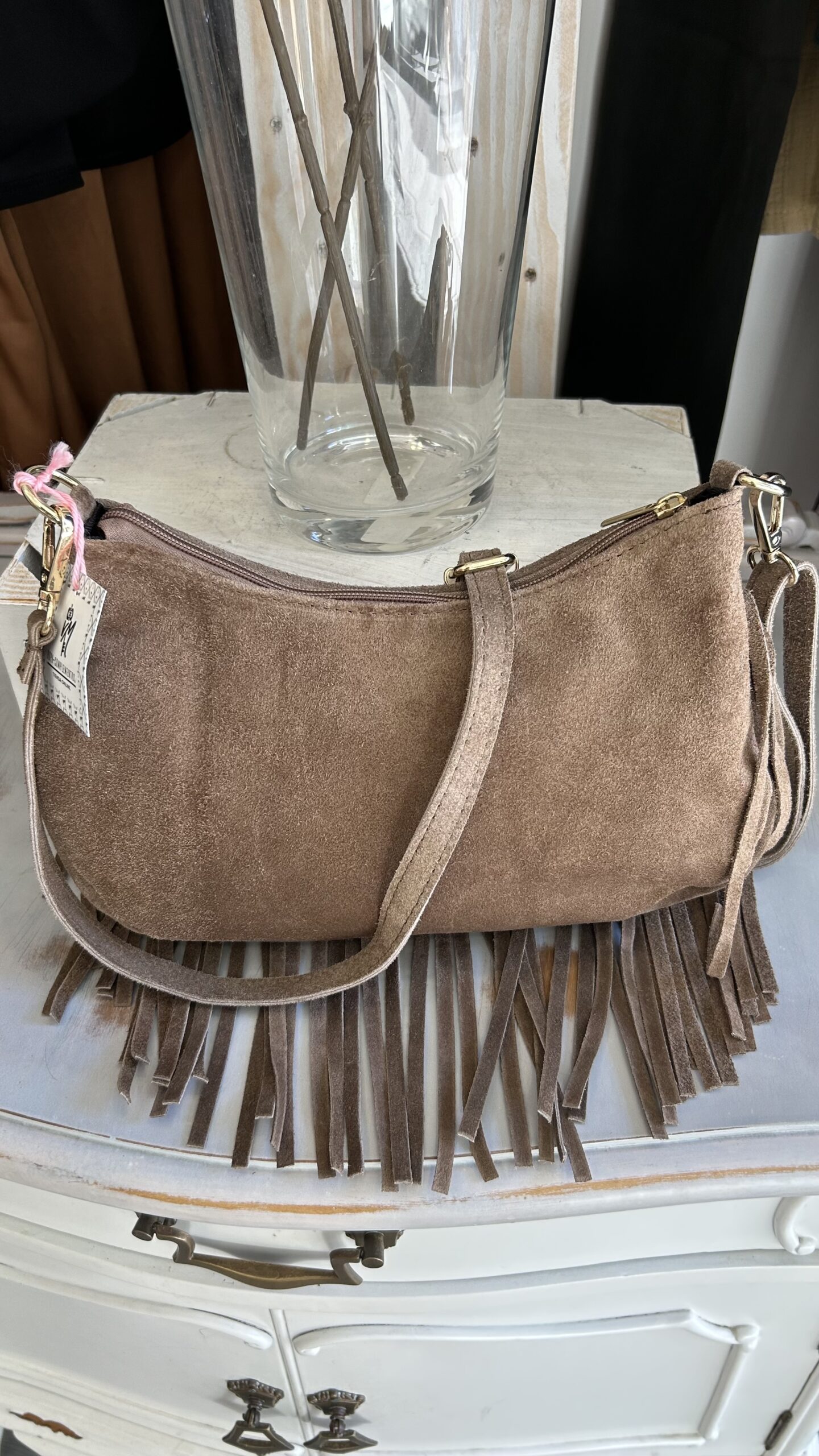 Bolso de serraje con flecos y tachuelas doradas. Asa larga ajustable para llevar cruzado tipo bandolera o colgado del hombro. Forma semi ovalada. También disponible en Chocolate