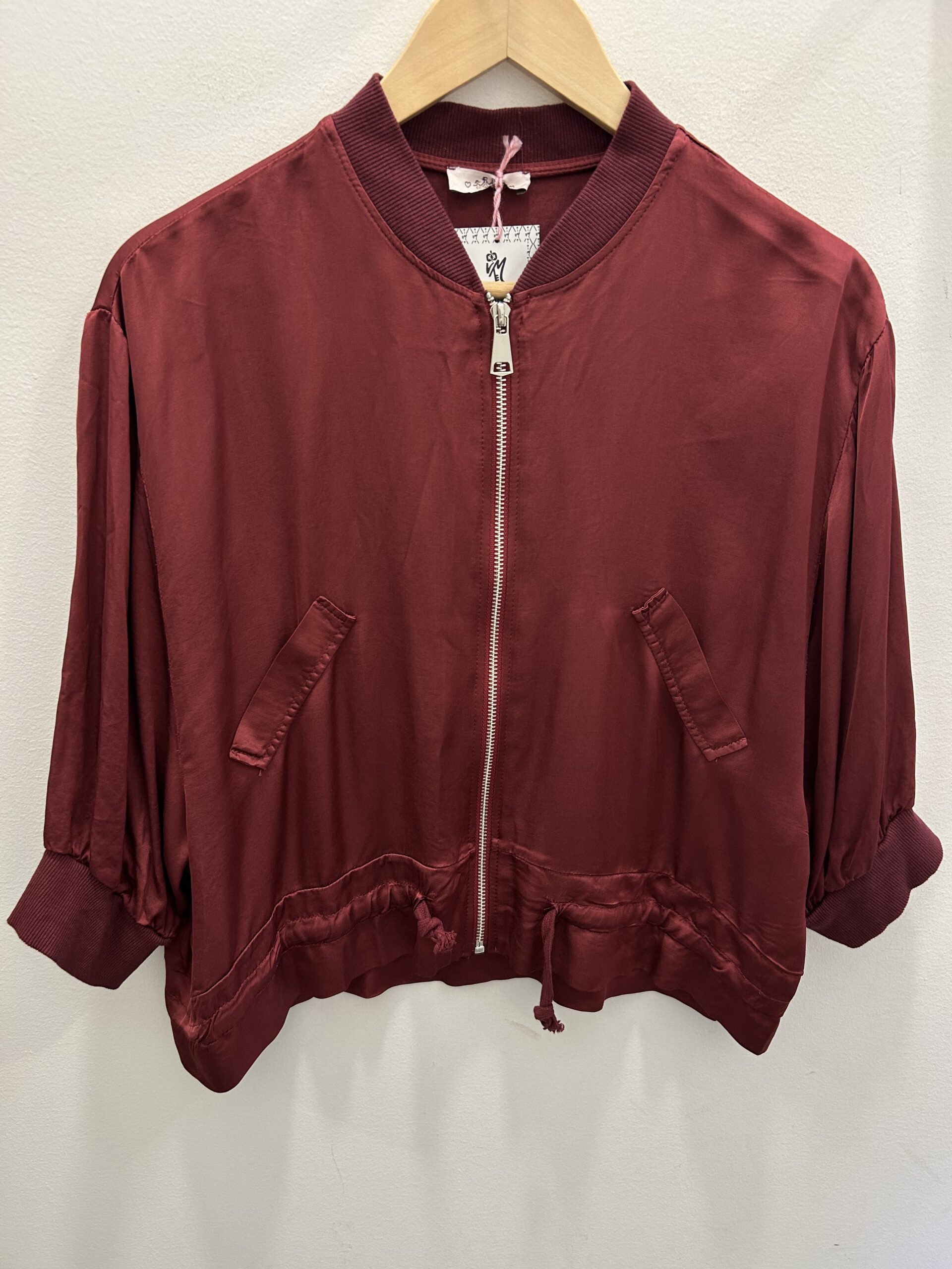 Chaqueta tipo bomber de manga al codo en tejido efecto raso y cierre frontal con cremallera. Terminaciones de cuello y puños en rib. Tira ajustable en la parte inferior para ajustarla. Disponible también en Rosa MaquillajeRosa Antiguo