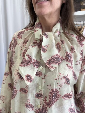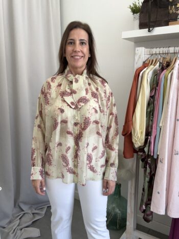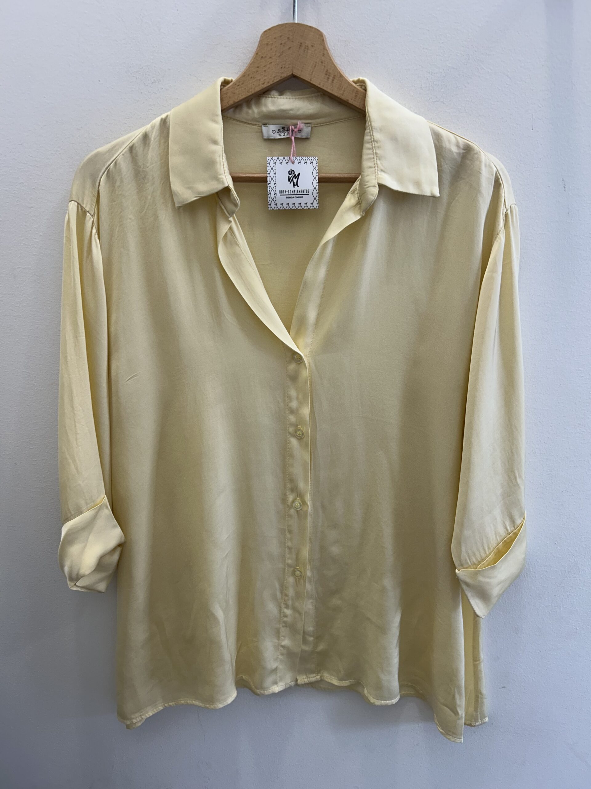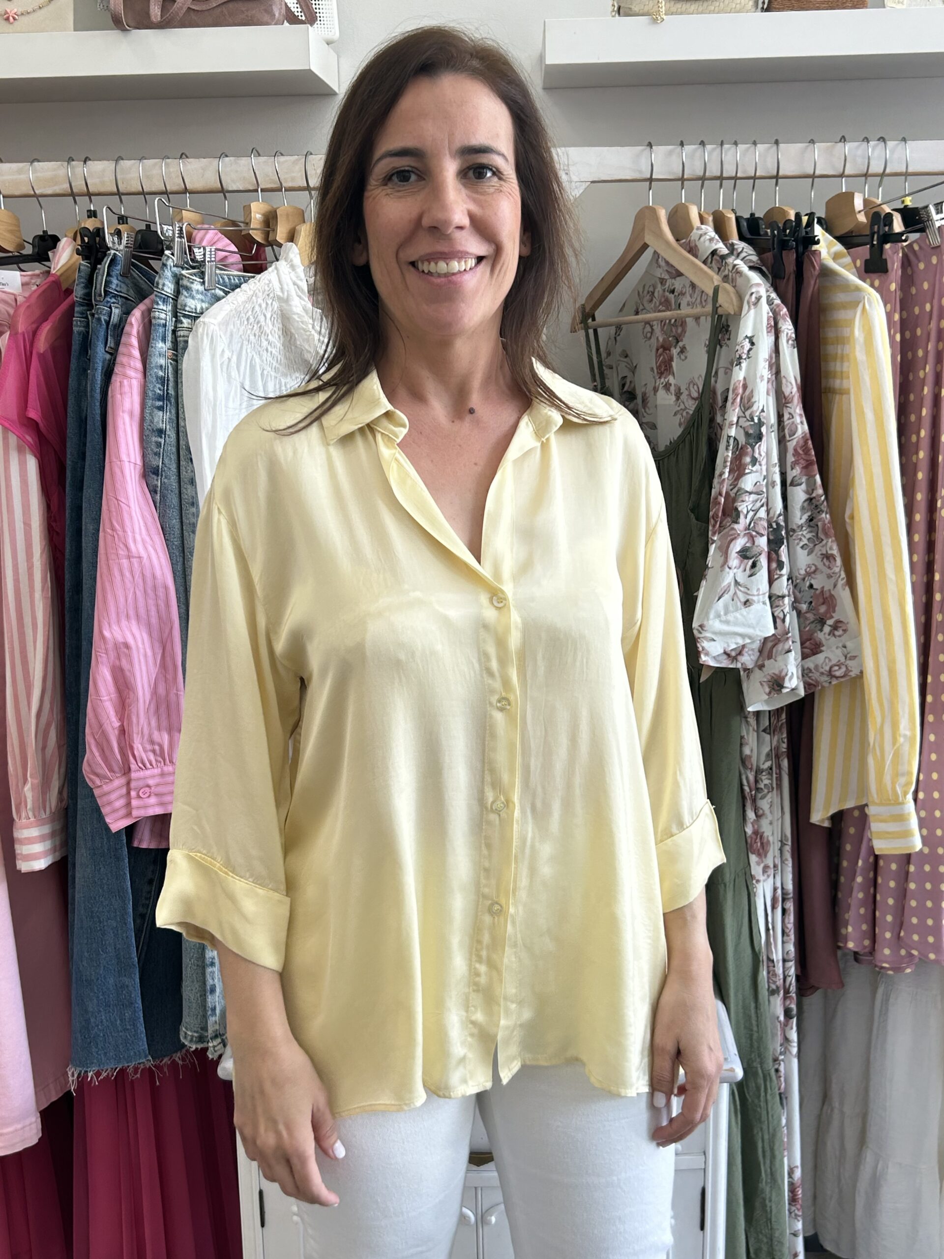 Camisa de manga al codo con vuelta en el puño. Cierre frontal con botones. Corte recto. Es larga y talla única (desde la 36 hasta la 42). Disponible también en Naranja