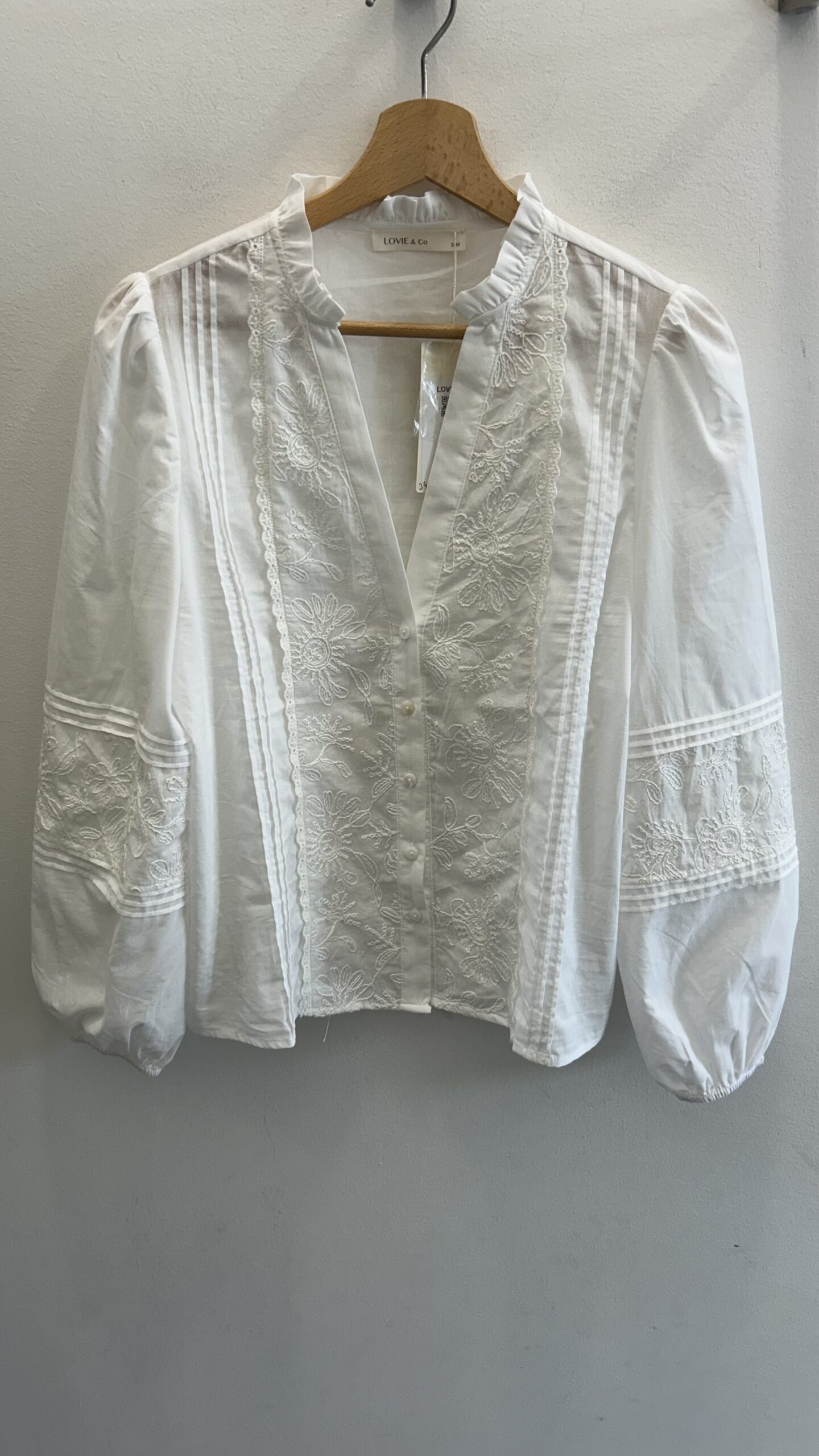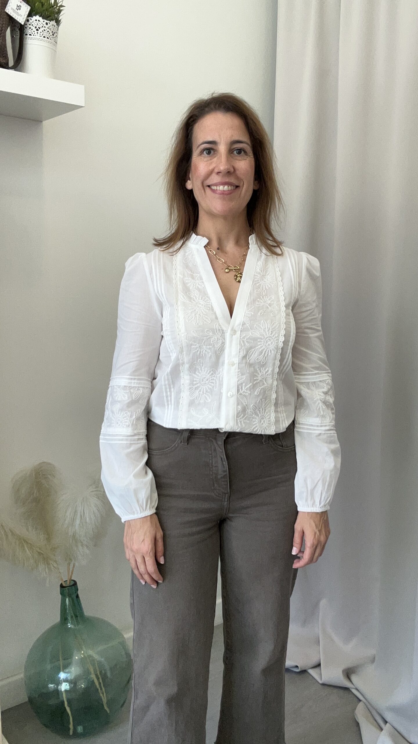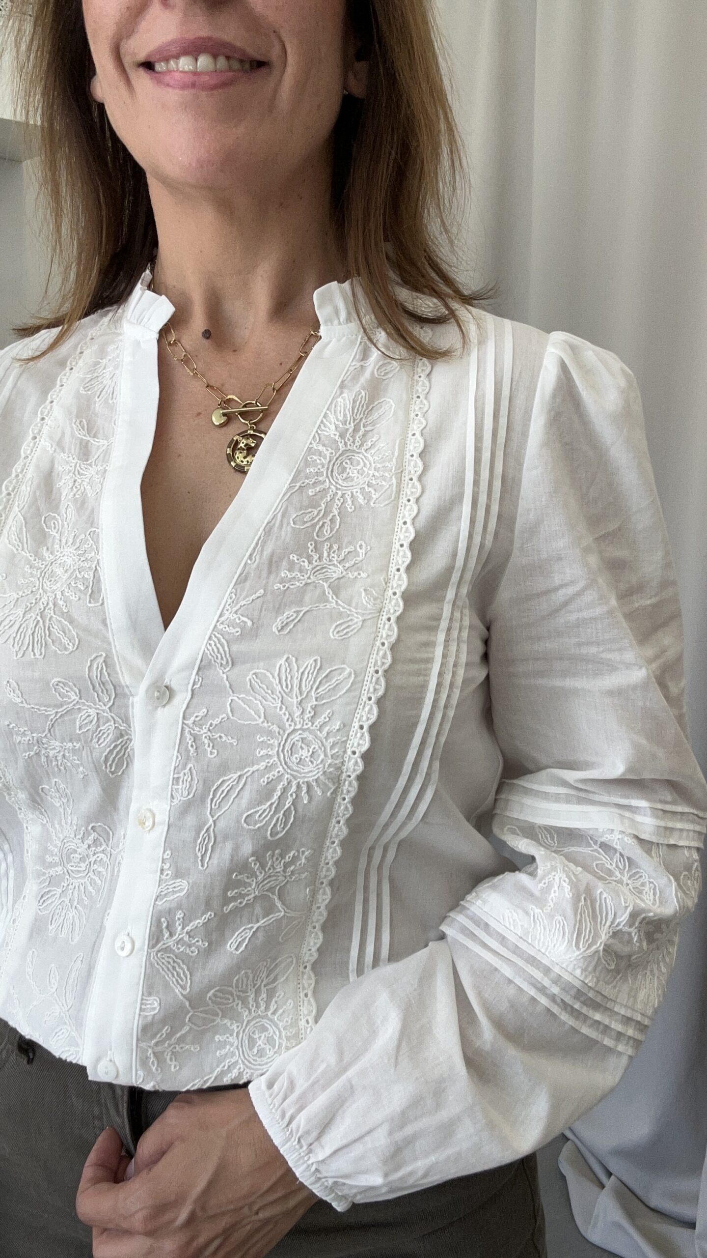 Camisa de manga larga y escote en pico. Mangas abullonadas y puño con goma elástica. Bordados en las mangas y en la parte delantera. Cierre frontal con botones.