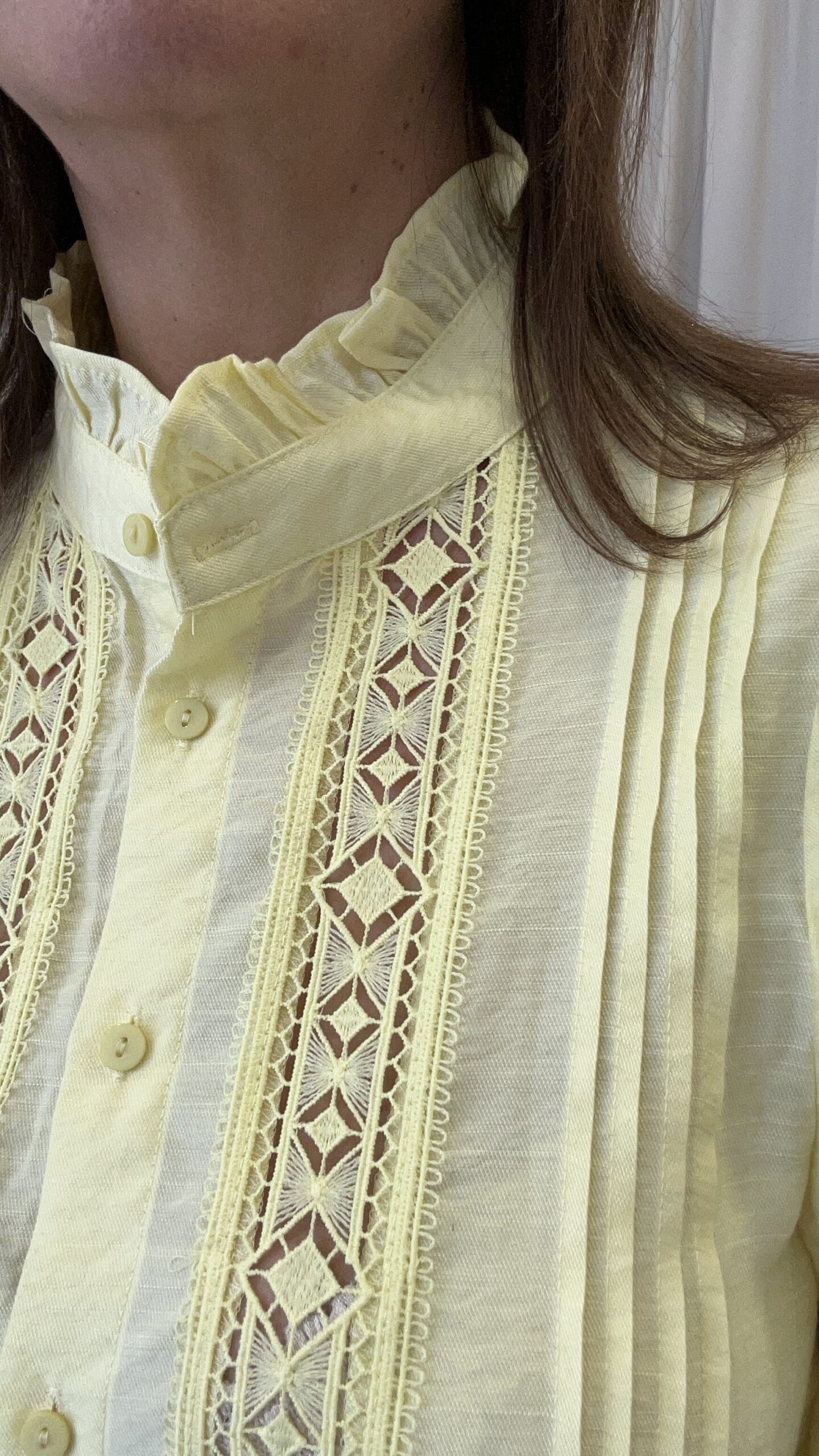 Camisa de manga larga y cuello alto con detalle de puntilla. Puños calados. Cierre frontal con botones y detalles calados en la parte delantera. Detalle fruncido en el hombro. Disponible también en Blanco
