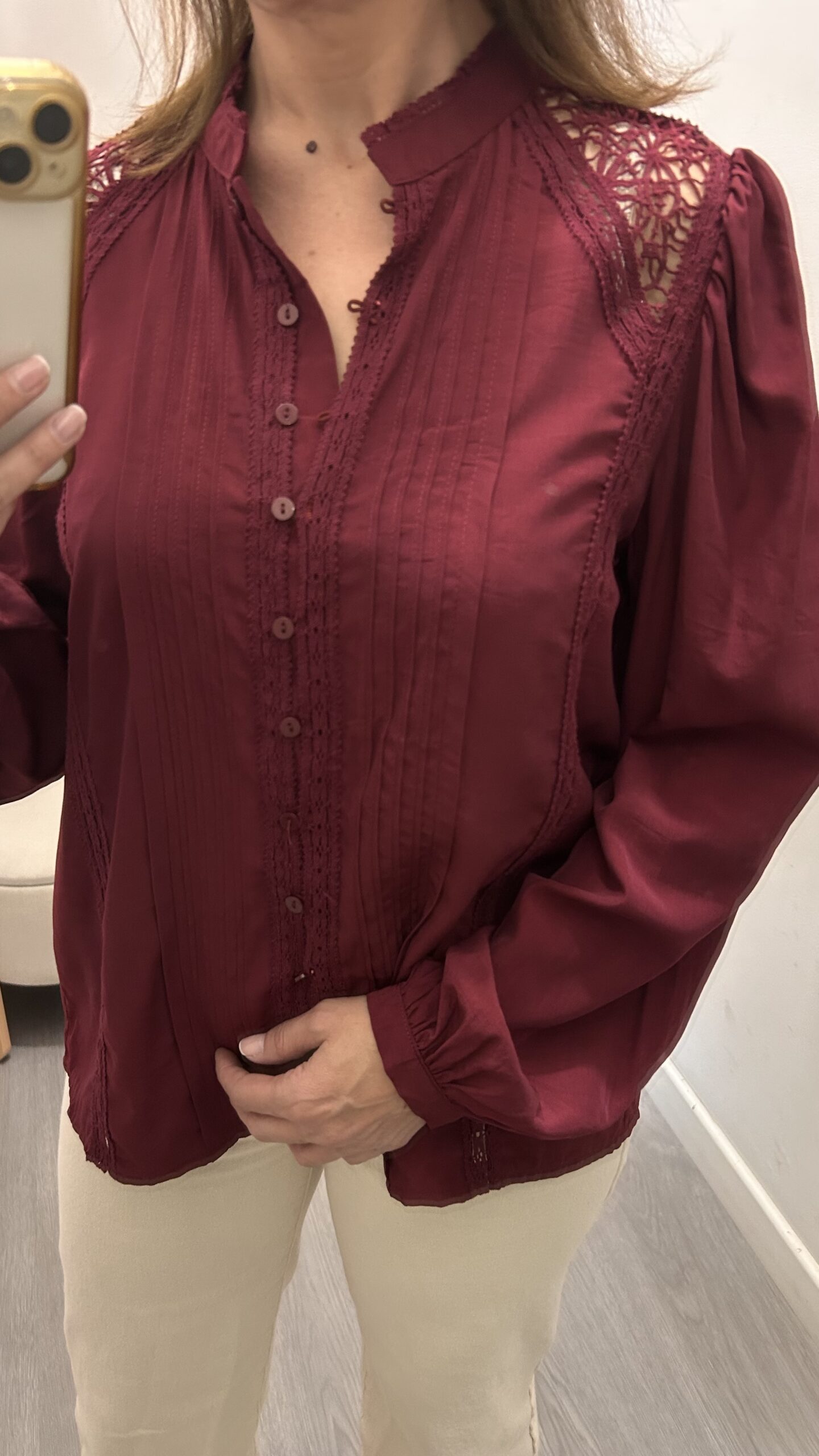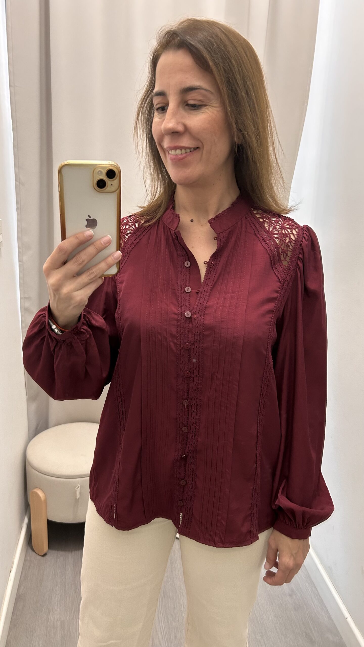 Camisa de manga larga con detalle de hombro calado. Cierre frontal con botones y manga abullonada. Corte recto. Disponible también en Negra