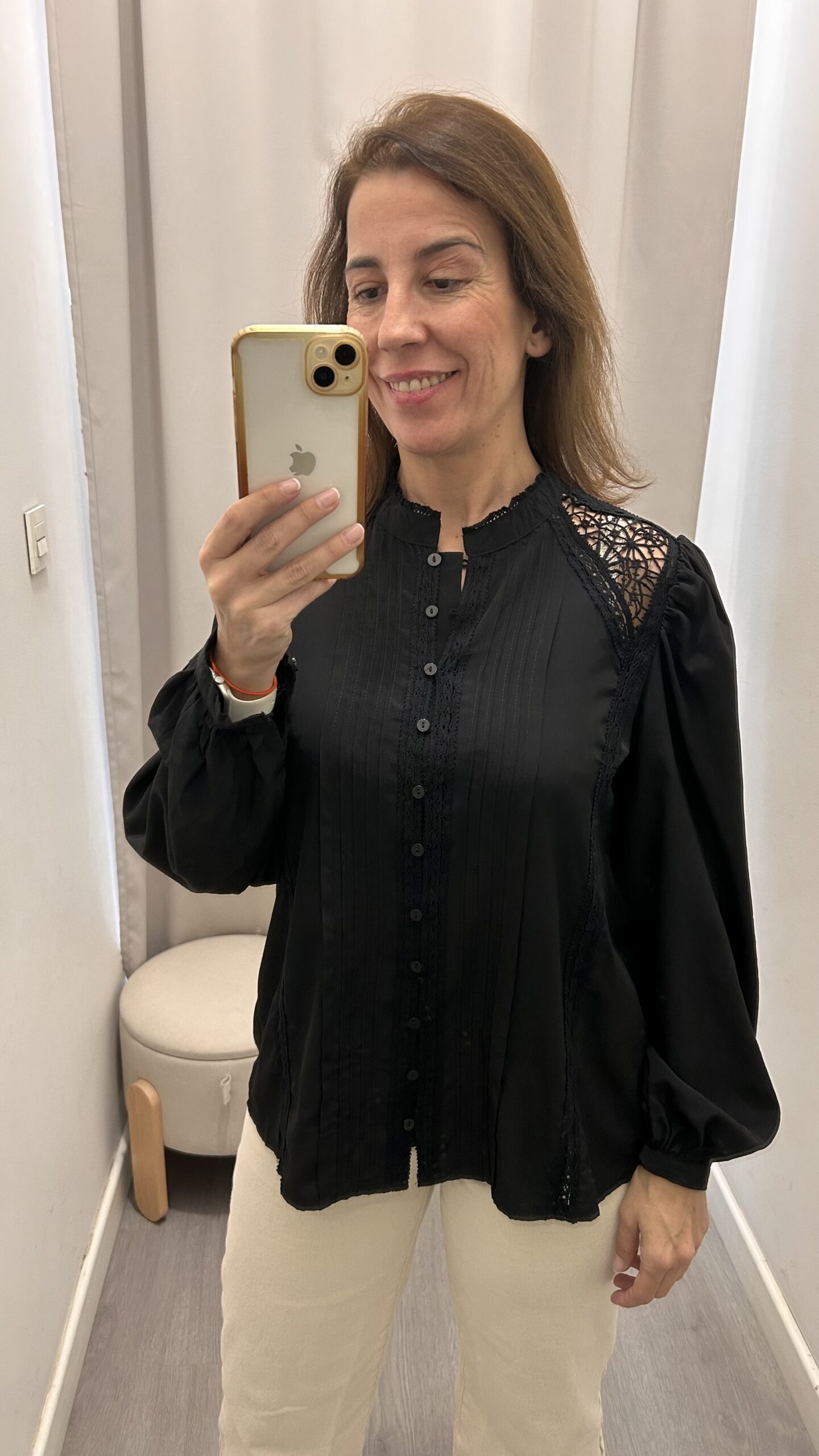 Camisa de manga larga con detalle de hombro calado. Cierre frontal con botones y manga abullonada. Corte recto. Disponible también en Granate