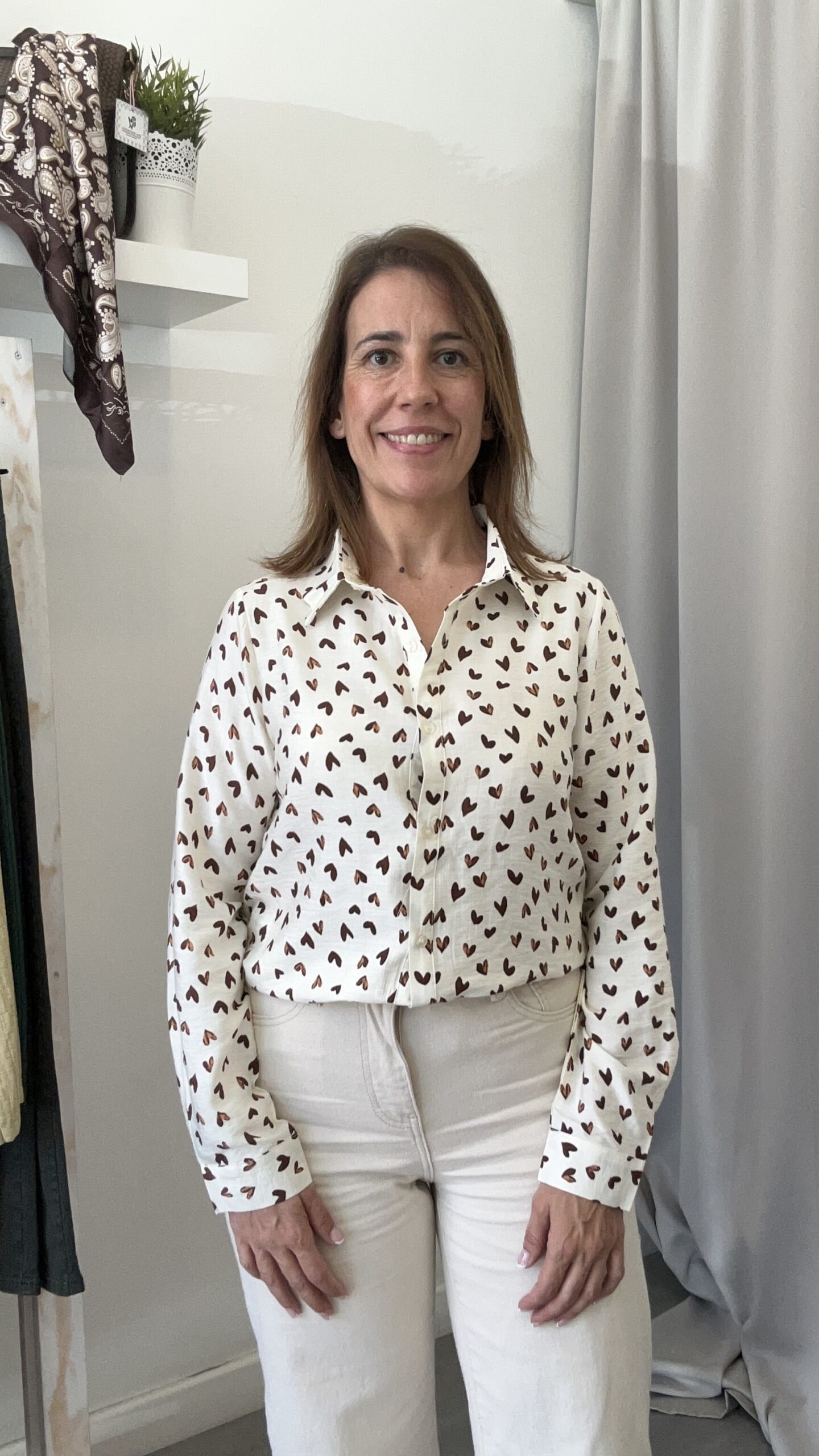 Camisa de manga larga y cierre frontal con botones. Estampado de corazones sobre fondo crudo. Corte recto.