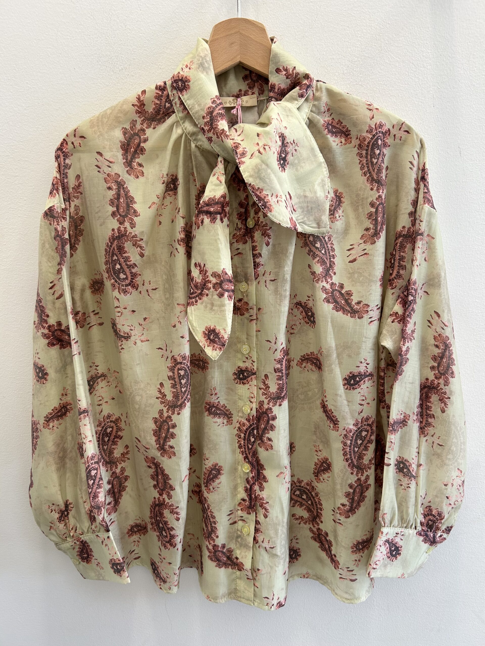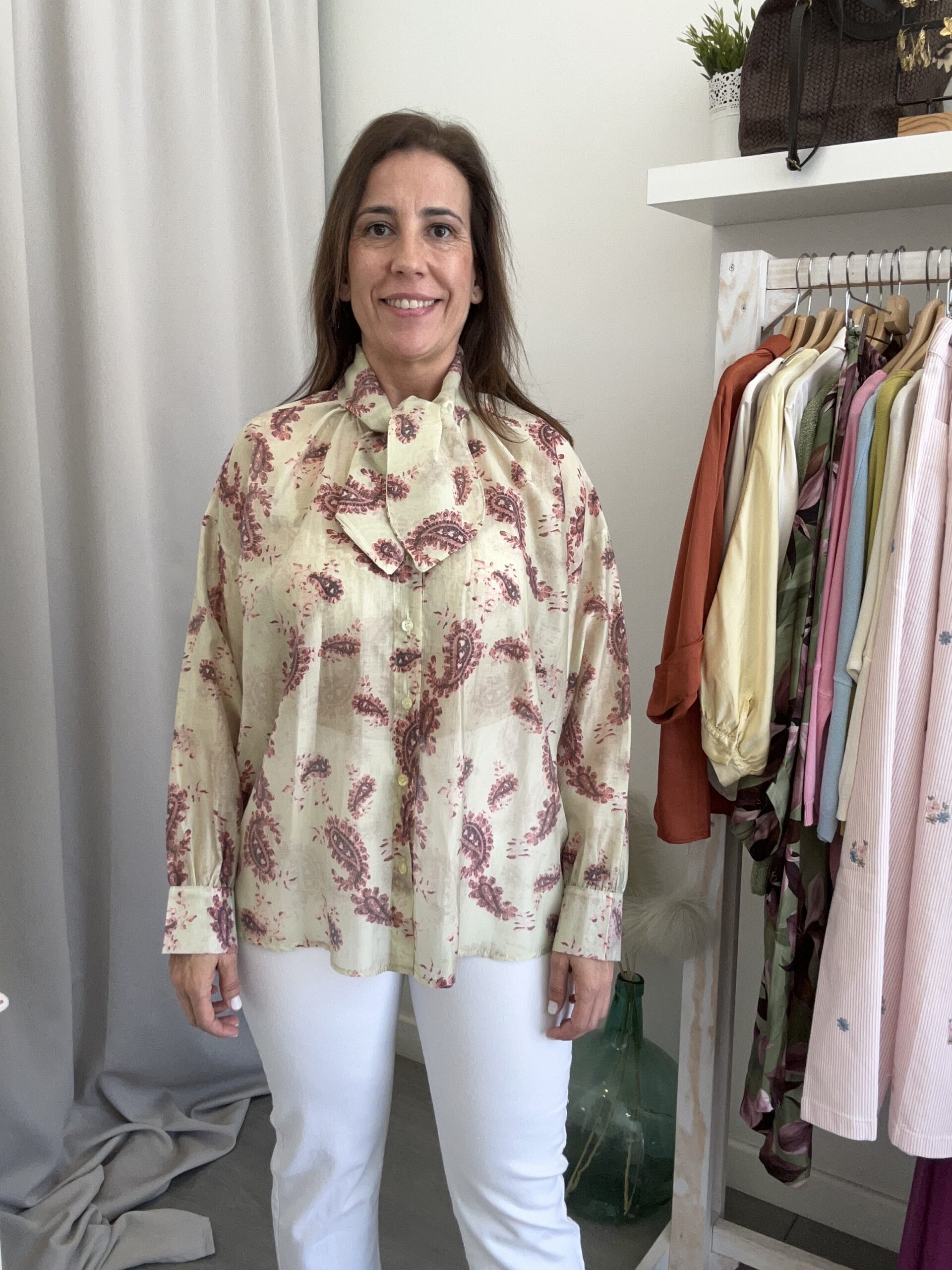Camisa de manga larga en tejido efecto gasa con lazo en el cuello. Cierre frontal con botones. Estampado tipo cashmire en tono coral sobre fondo verde. Talla única (desde la 36 hasta la 44). Disponible también en Crudo