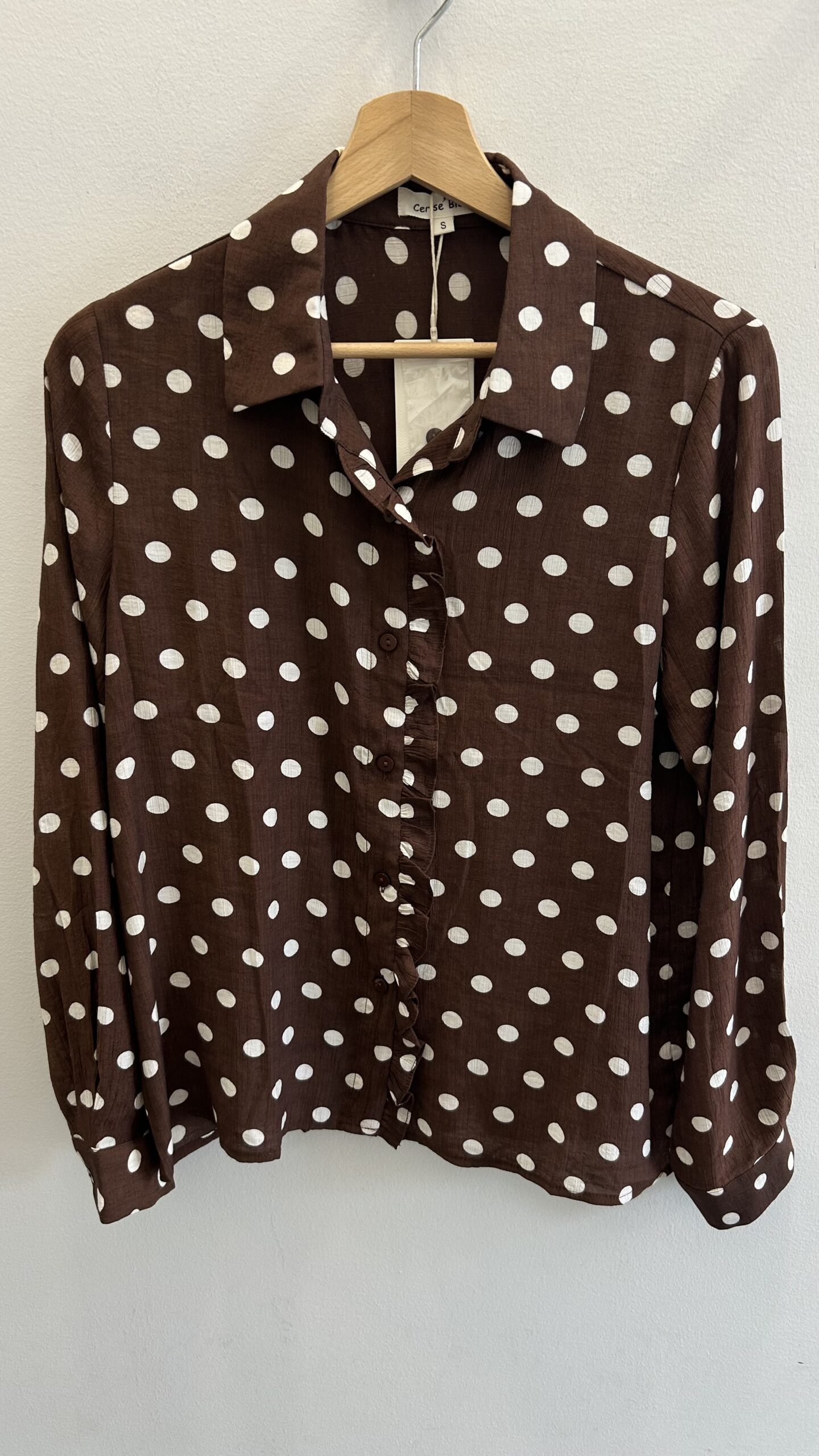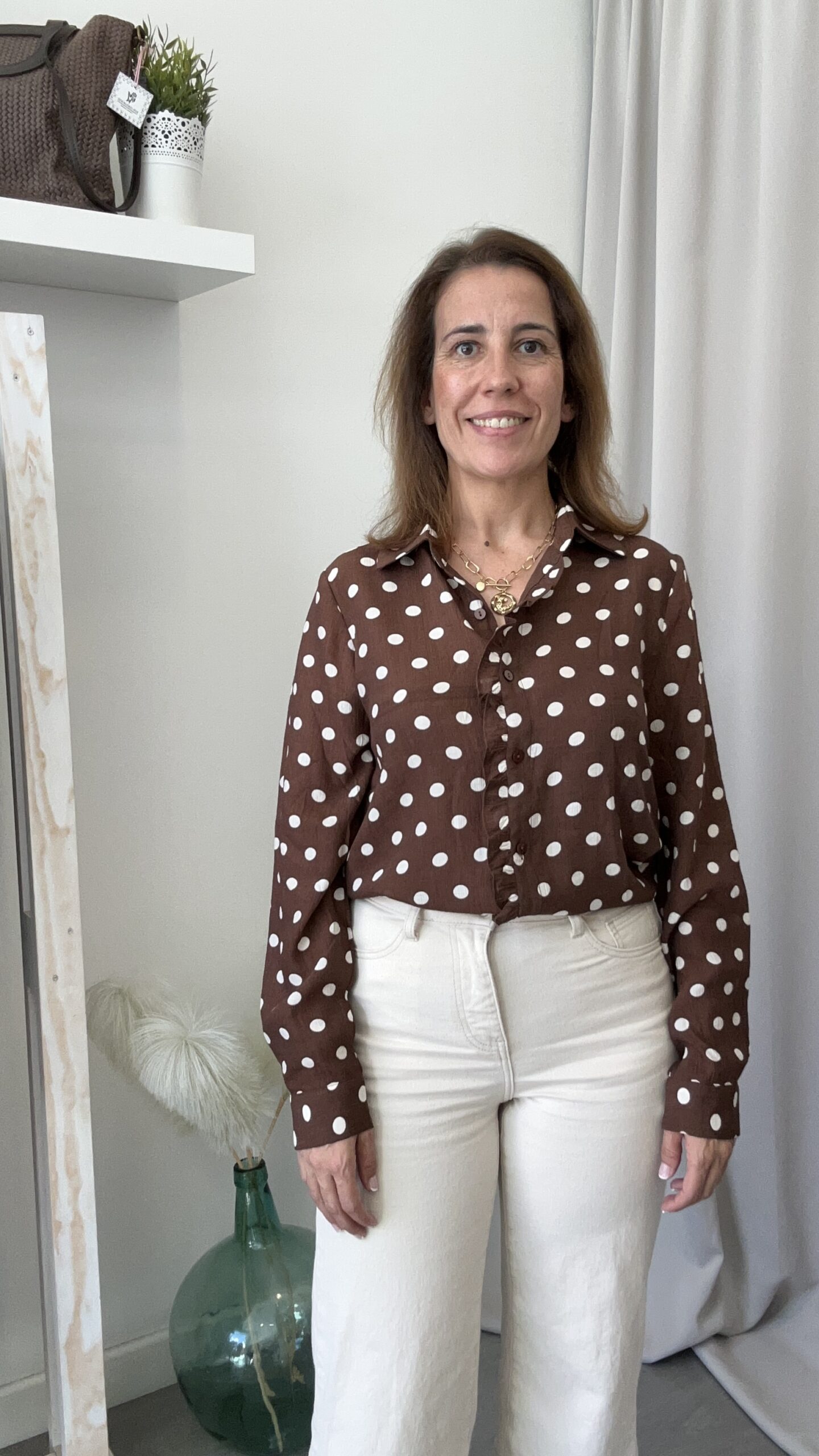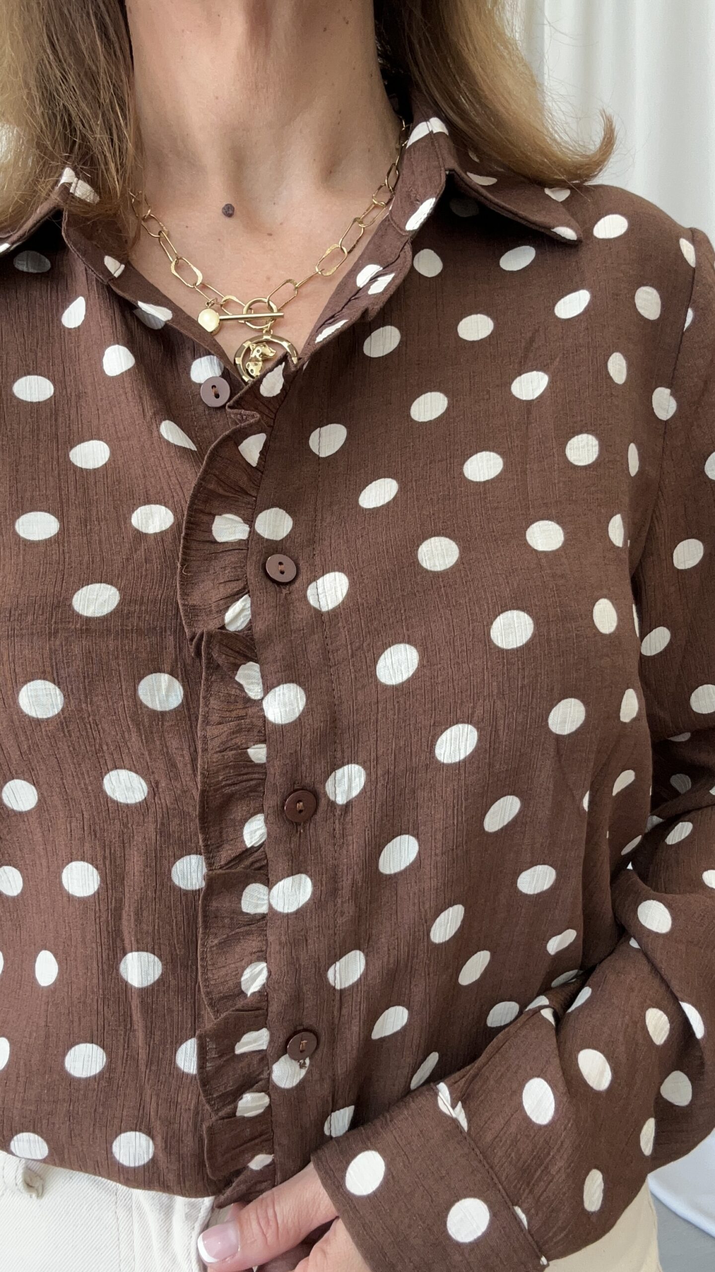 Camisa de manga larga y corte básico en estampado de lunares beige sobre fondo marrón. Cierre frontal con botones y detalle de volante.