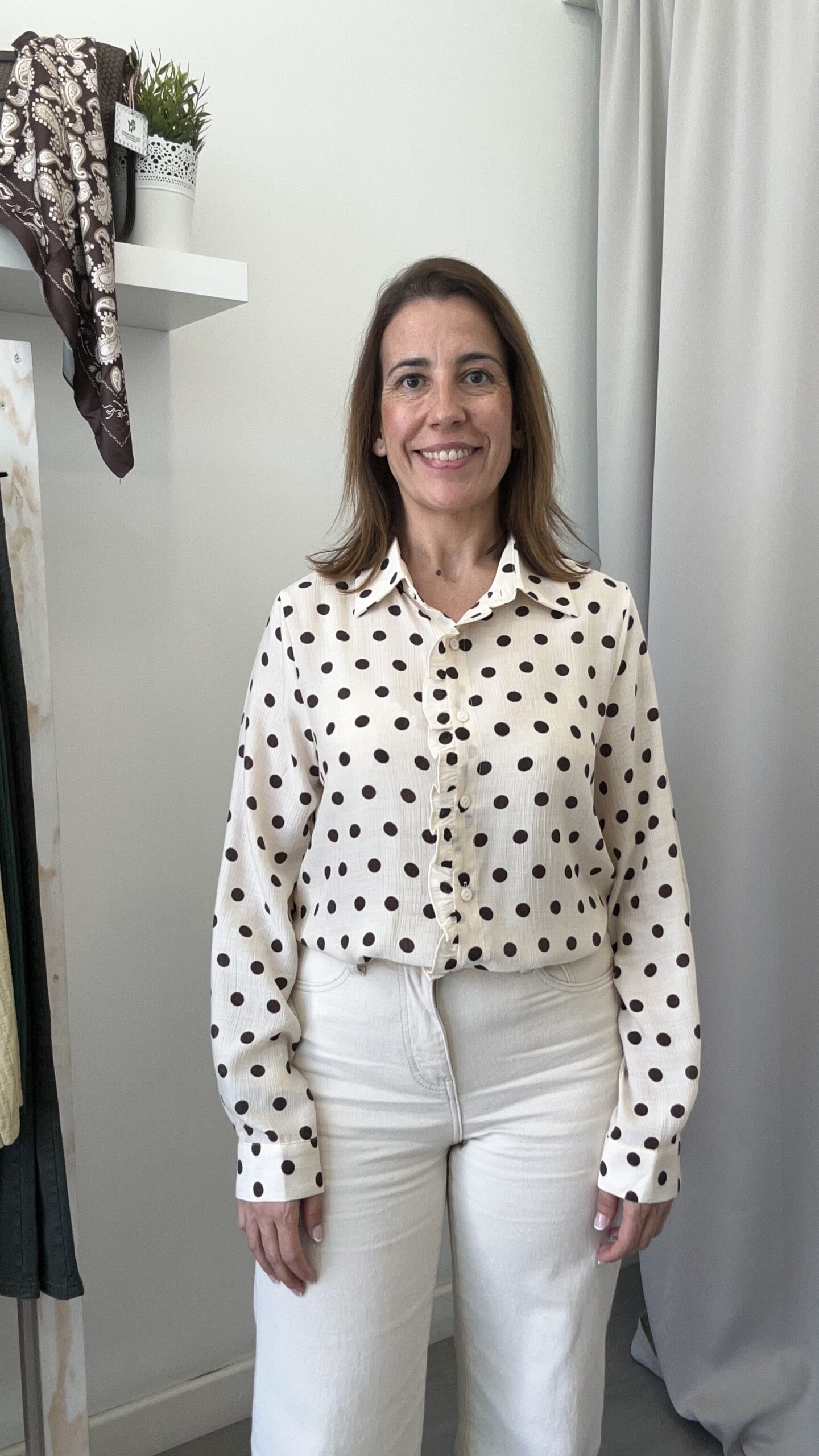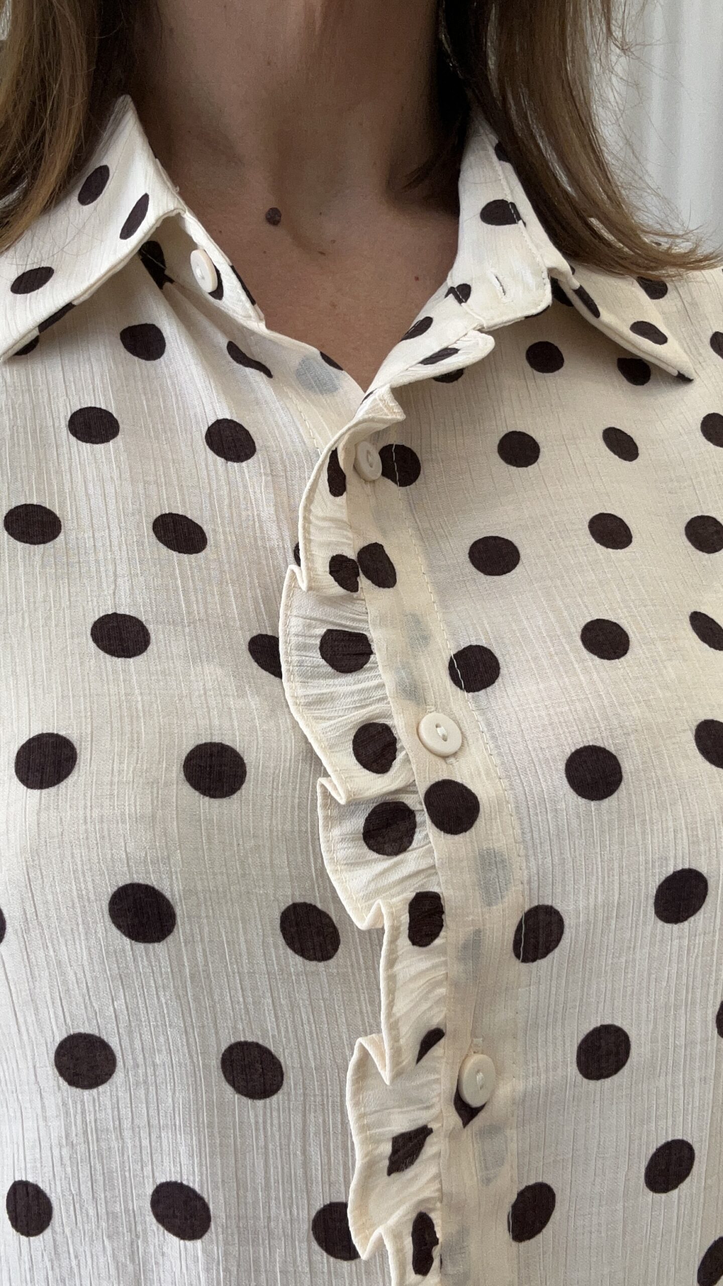 Camisa de manga larga y corte básico en estampado de lunares marrón sobre fondo beige. Cierre frontal con botones y detalle de volante.
