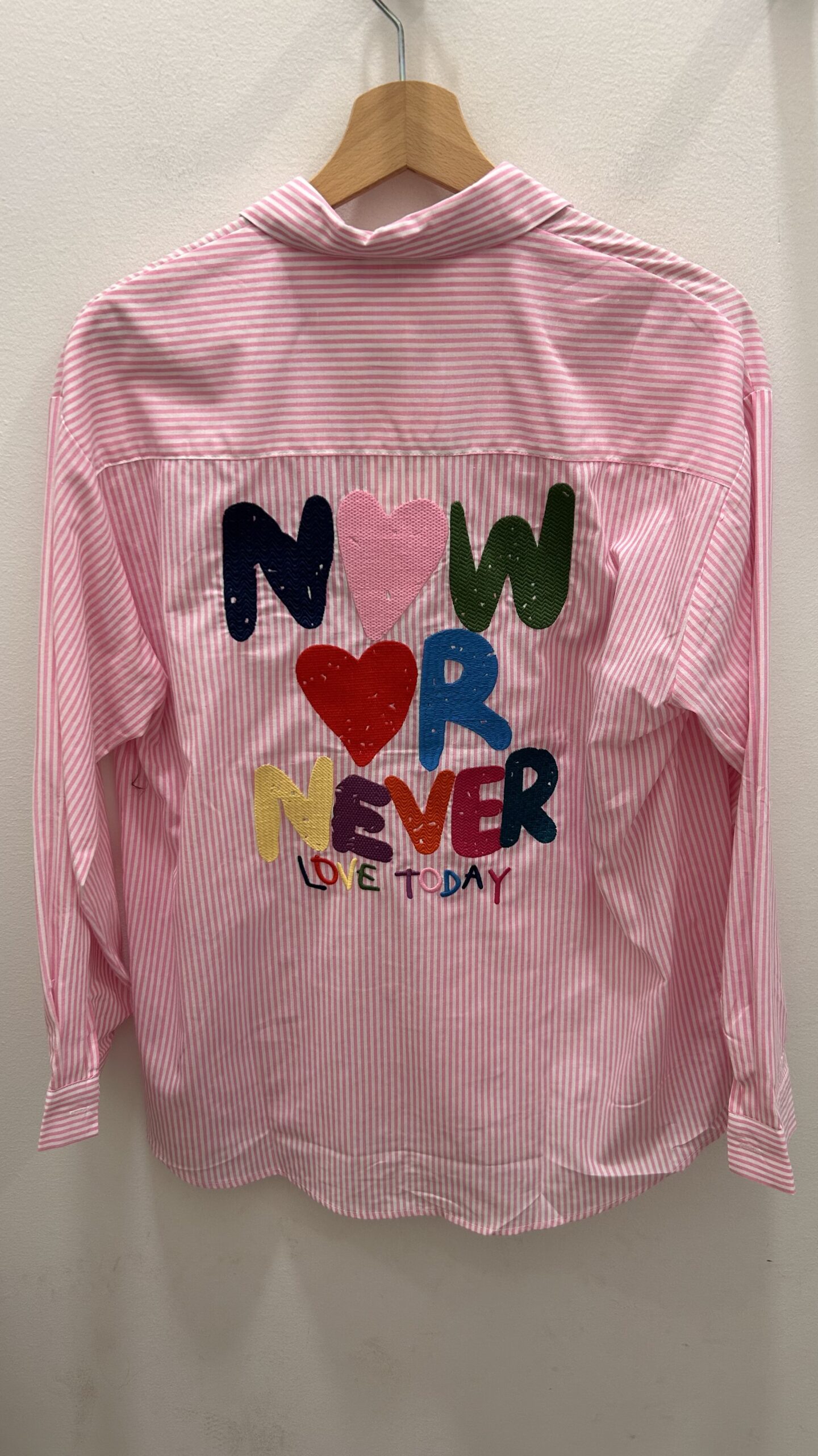 Camisa de manga larga en rayas azules. Es larga. Detalle de corazón en la parte delantera. Letras en la parte de la espalda. Disponible también en Azul