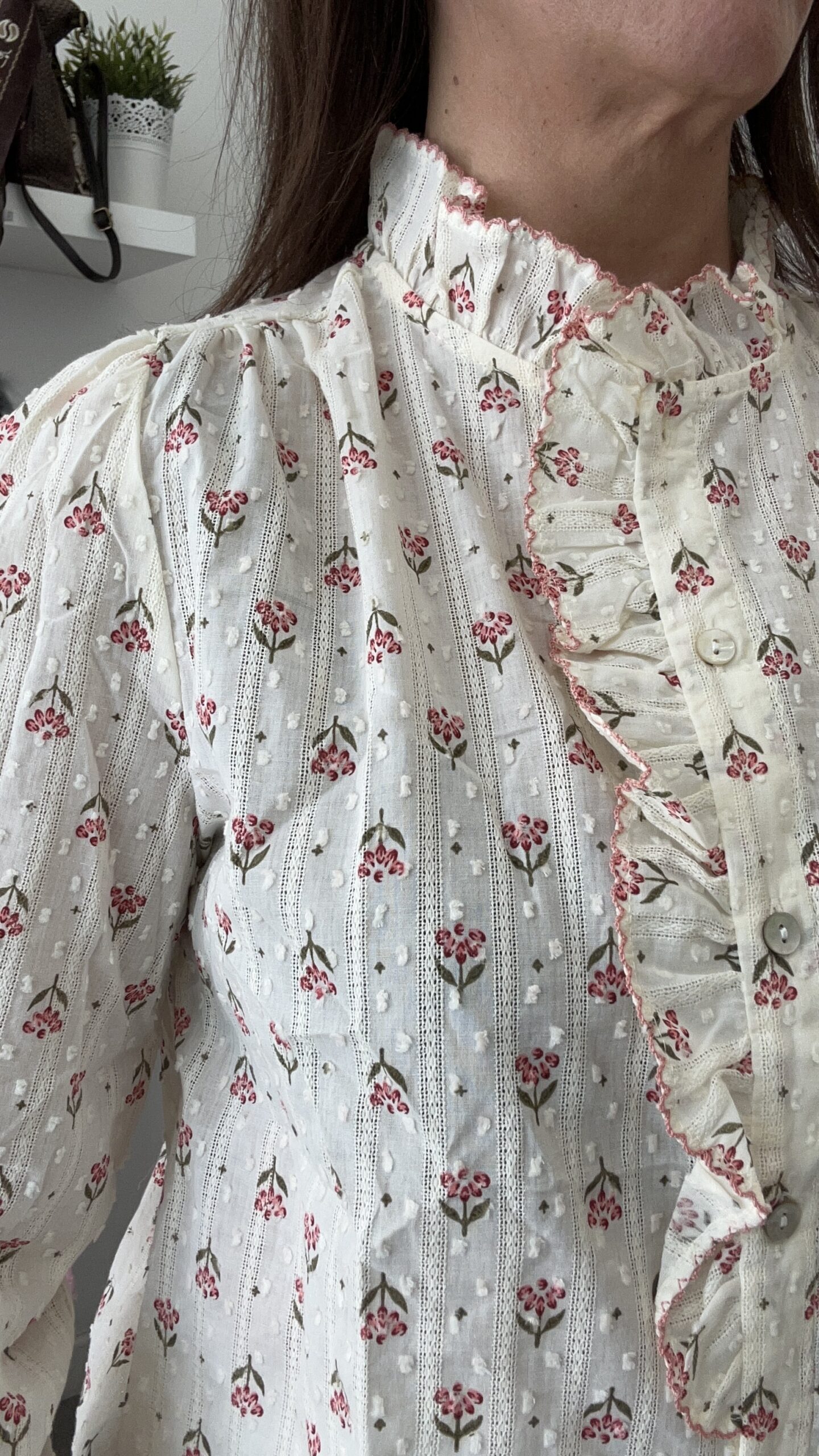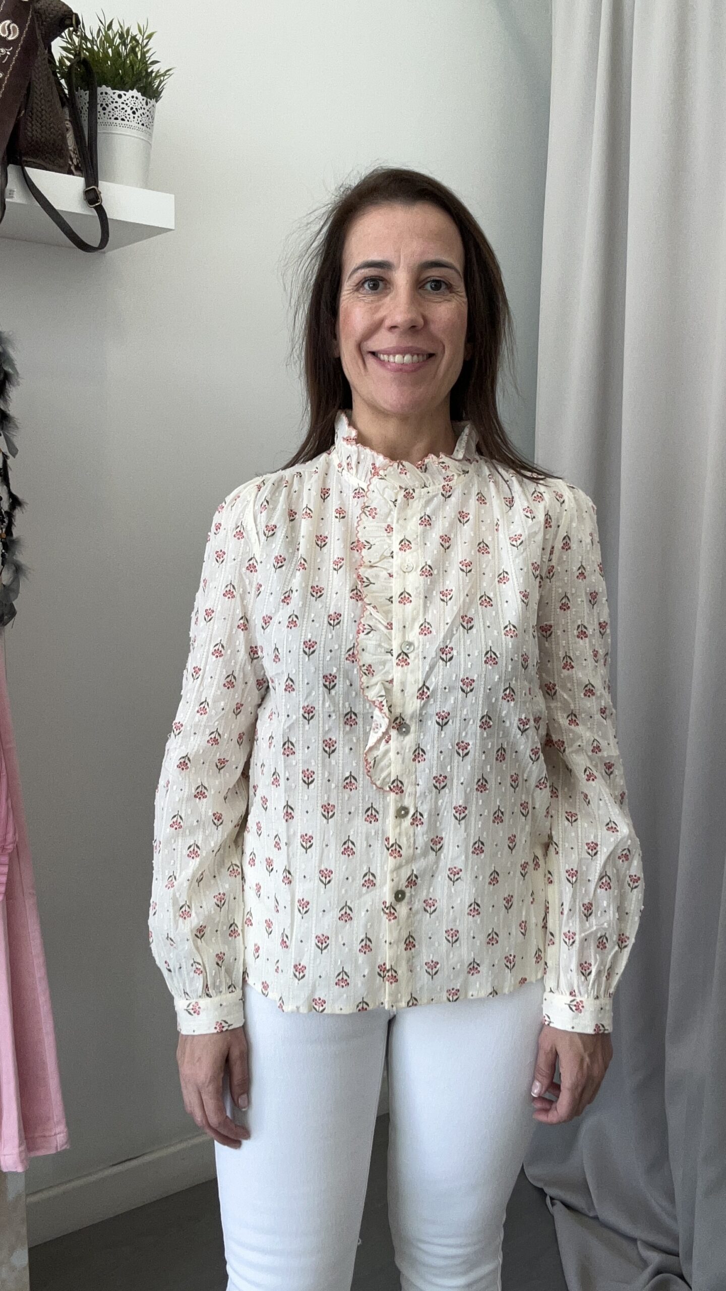 Camisa de plumeti y de manga larga con cierre frontal de botones y volante en el borde. Cuello alto y detalle de volante en el.borde. Estampado de flores. Corte recto.