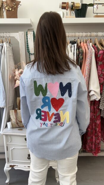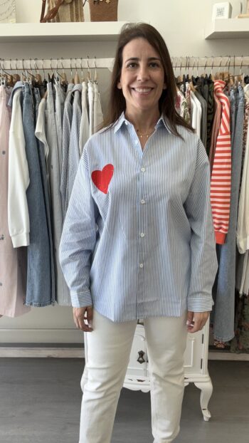 Camisa de manga larga y rayas. Cuello subido con detalle de volante. Puños anchos. Disponible también en Rosa