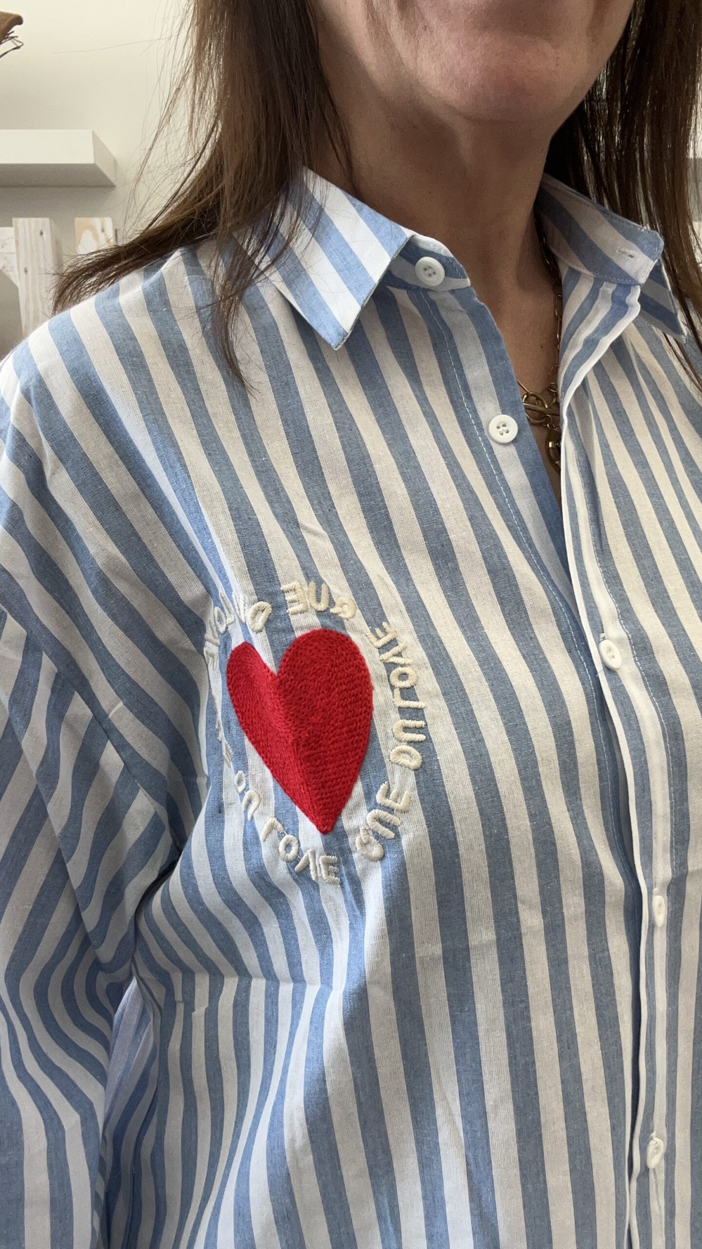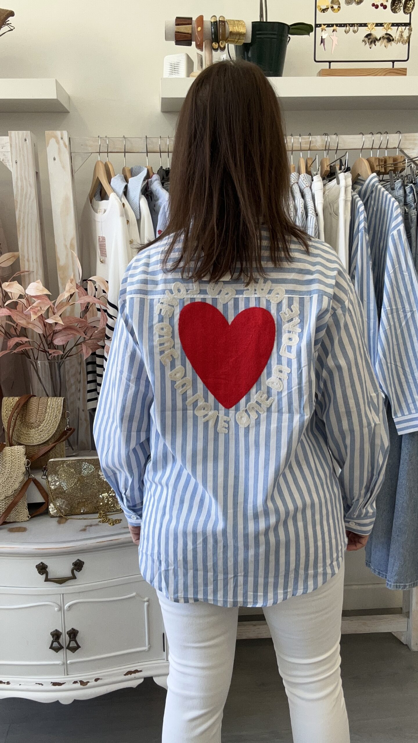 Camisa de rayas y manga larga. Corte básico y estampado de corazón en rojo en la espalda y letras. Disponible también en Rosa