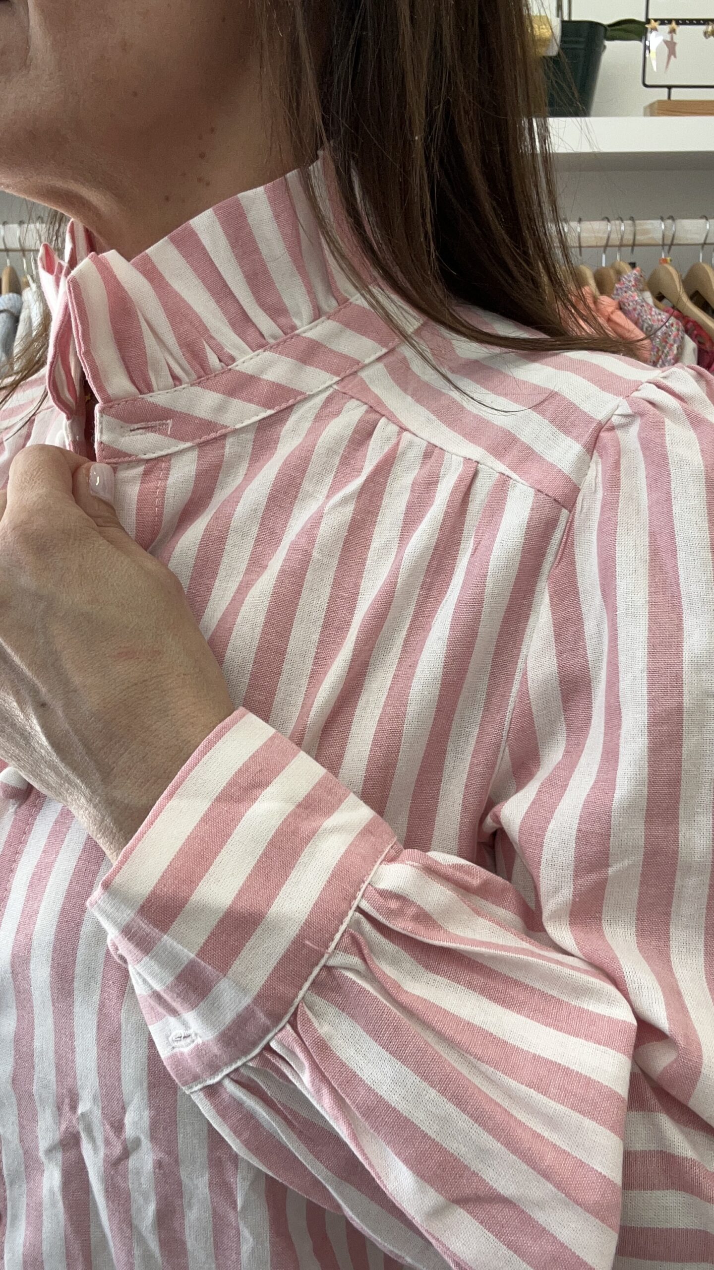 Camisa de manga larga y rayas. Cuello subido con detalle de volante. Puños anchos. Disponible también en Amarilla