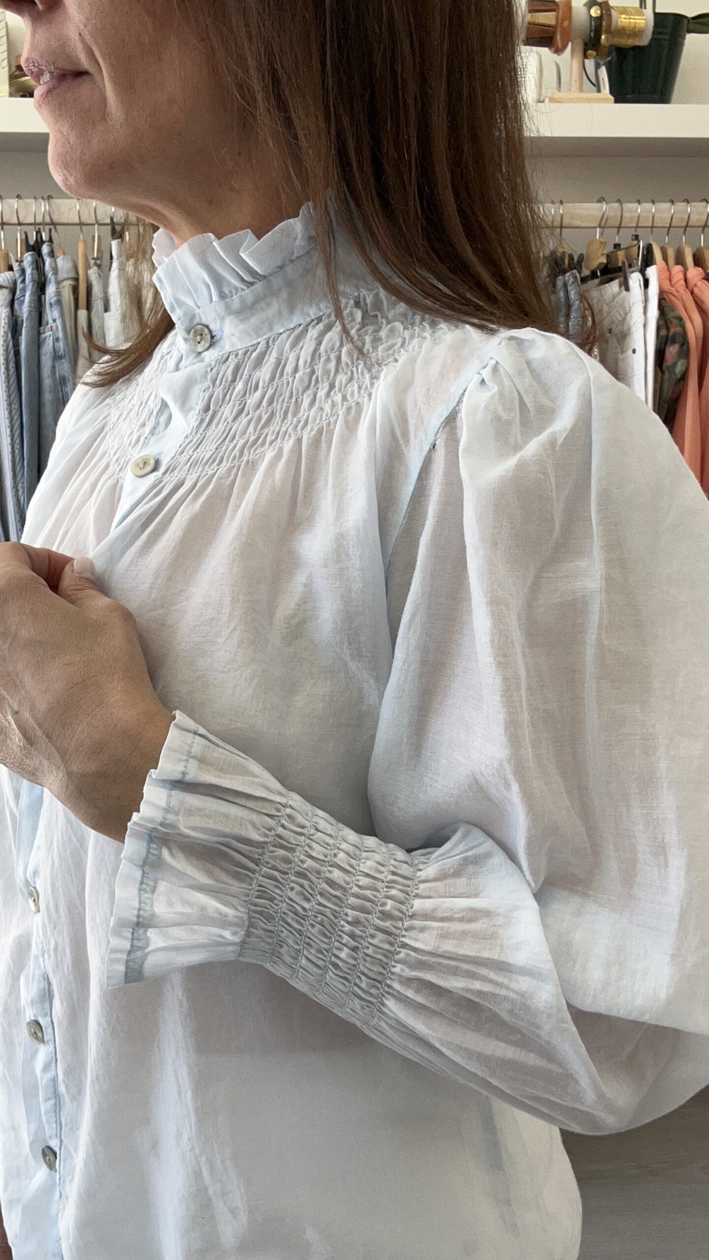 Camisa de manga larga y cierre frontal con botones. Cuello y puños con nido de abeja. Tejido efecto gasa, se transparenta un poco. Corte básico. Talla única (desde la 36 hasta la 40). Disponible también en Blanca