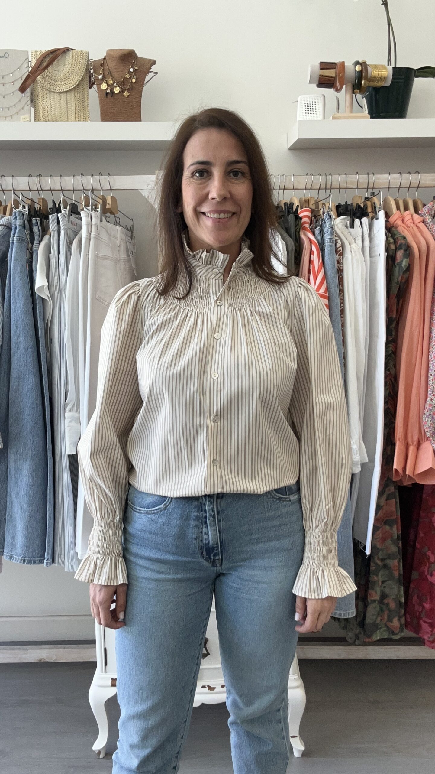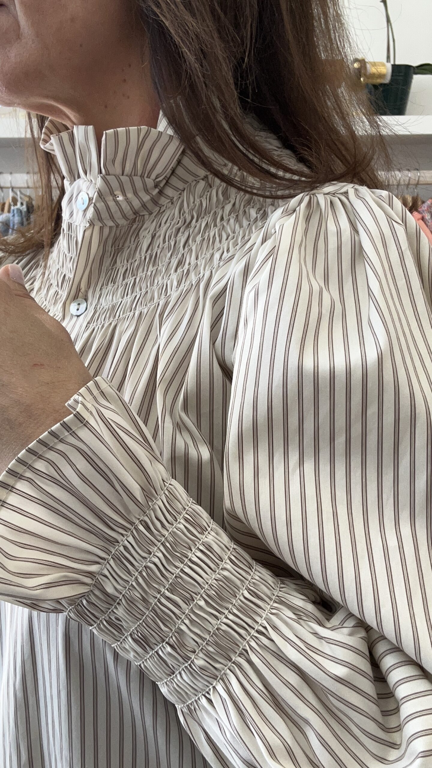 Camisa de manga larga y cierre frontal con botones.Nido de abeja en cuello y puños. Hombro bombacho. Rayas en tonos marrones sobre fondo beige. En la foto sale la talla S. Disponible también en crudo