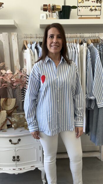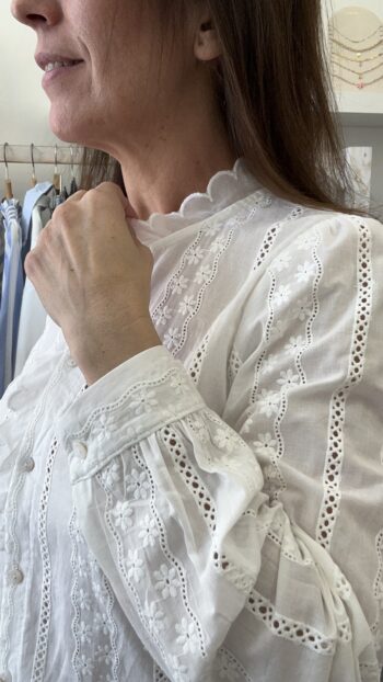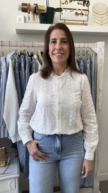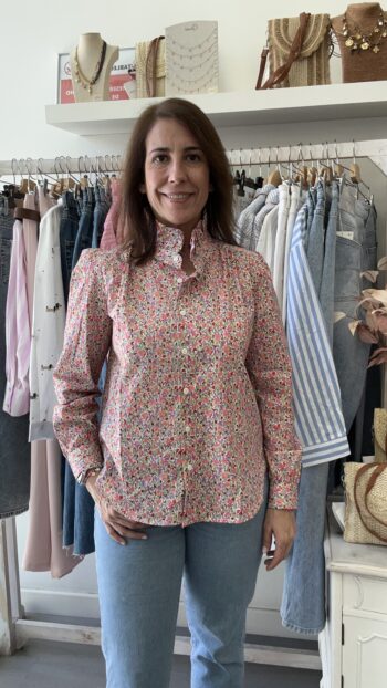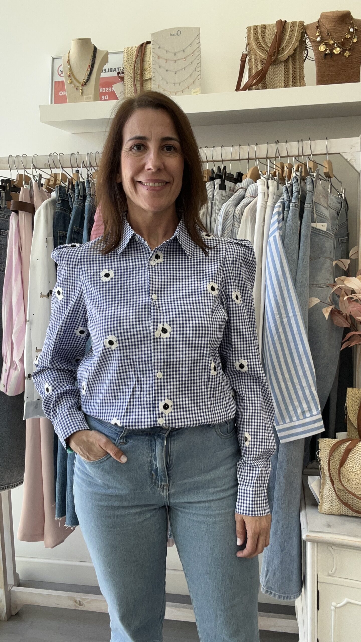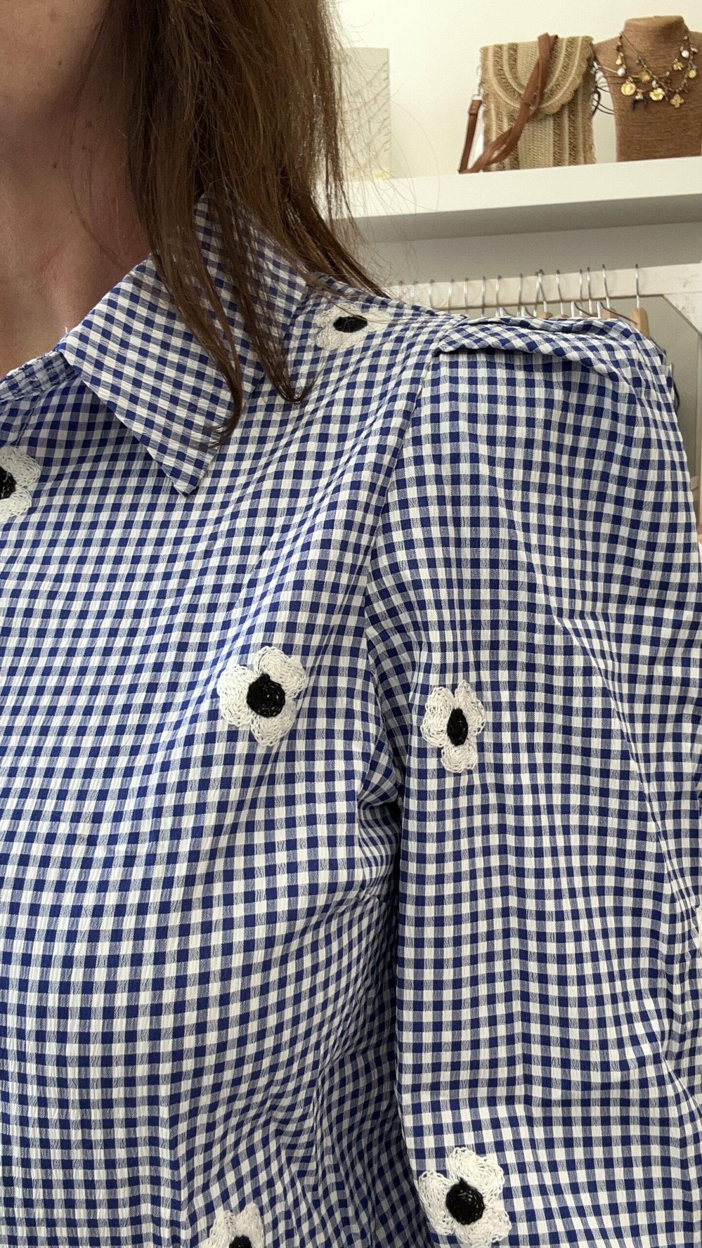 Camisa de manga larga y hombro abullonado. Estampado de cuadros vichy y detalle de flores bordadas. Cierre frontal con botones. Corte básico.