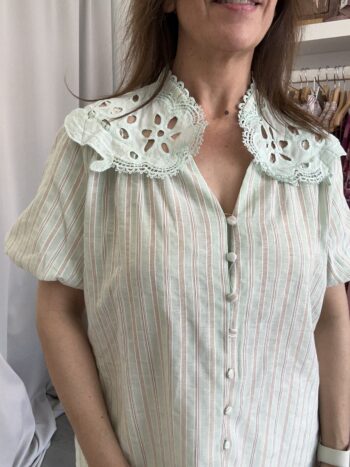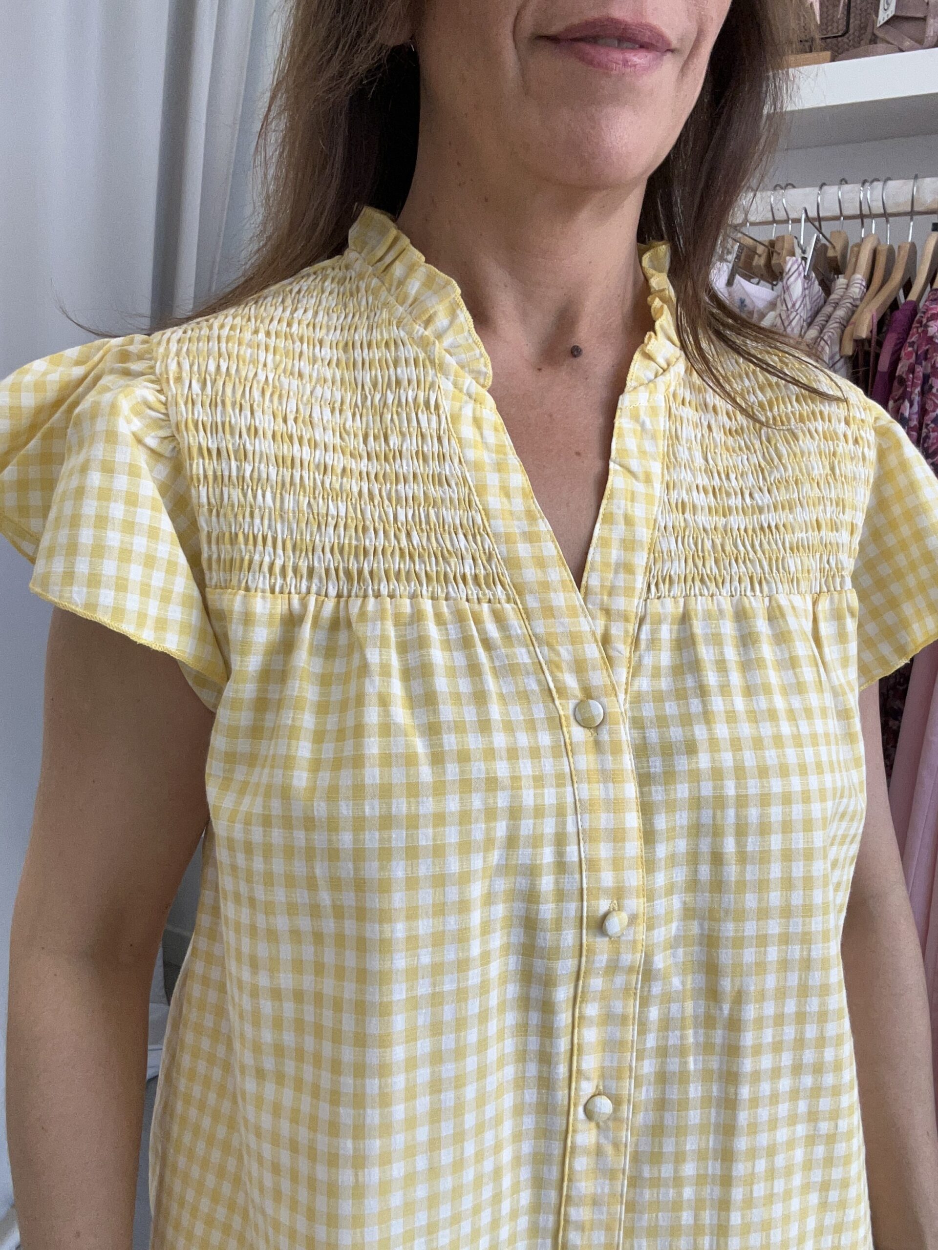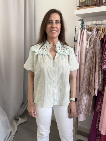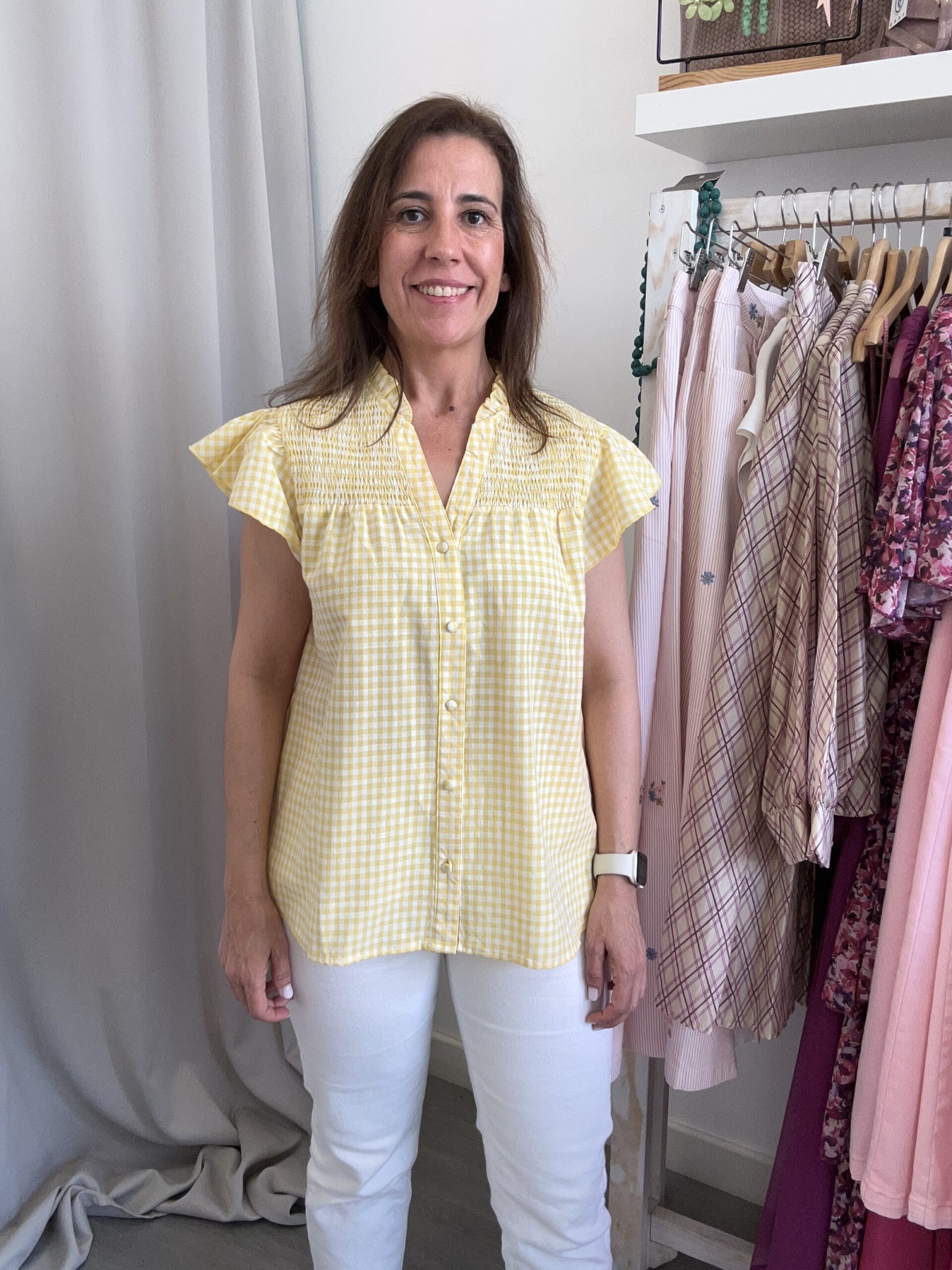 Camisa de manga sisa con volante y cuello pico. Cierre frontal con botones. Nido de abeja en la parte superior delantera. Es larga y de corte recto. Aberturas en la parte inferior de los lados. Talla única (desde la 36 hasta la 42). Disponible también en Rosa