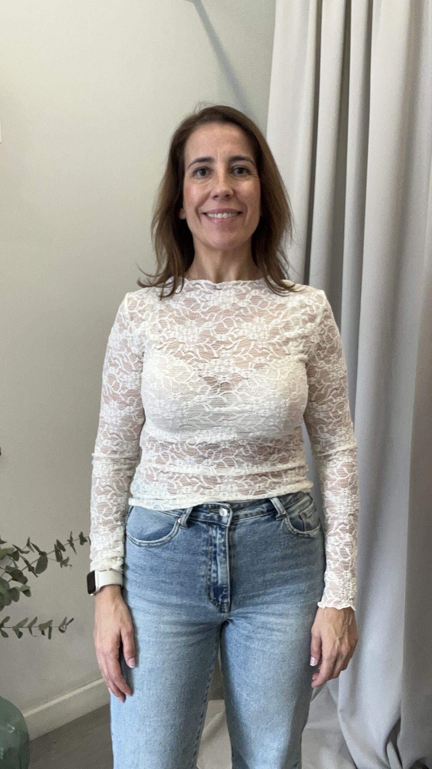 Camiseta de manga larga y cuello redondo de encaje. Se transparenta y queda ajustada.Disponible en Negra y Marrón