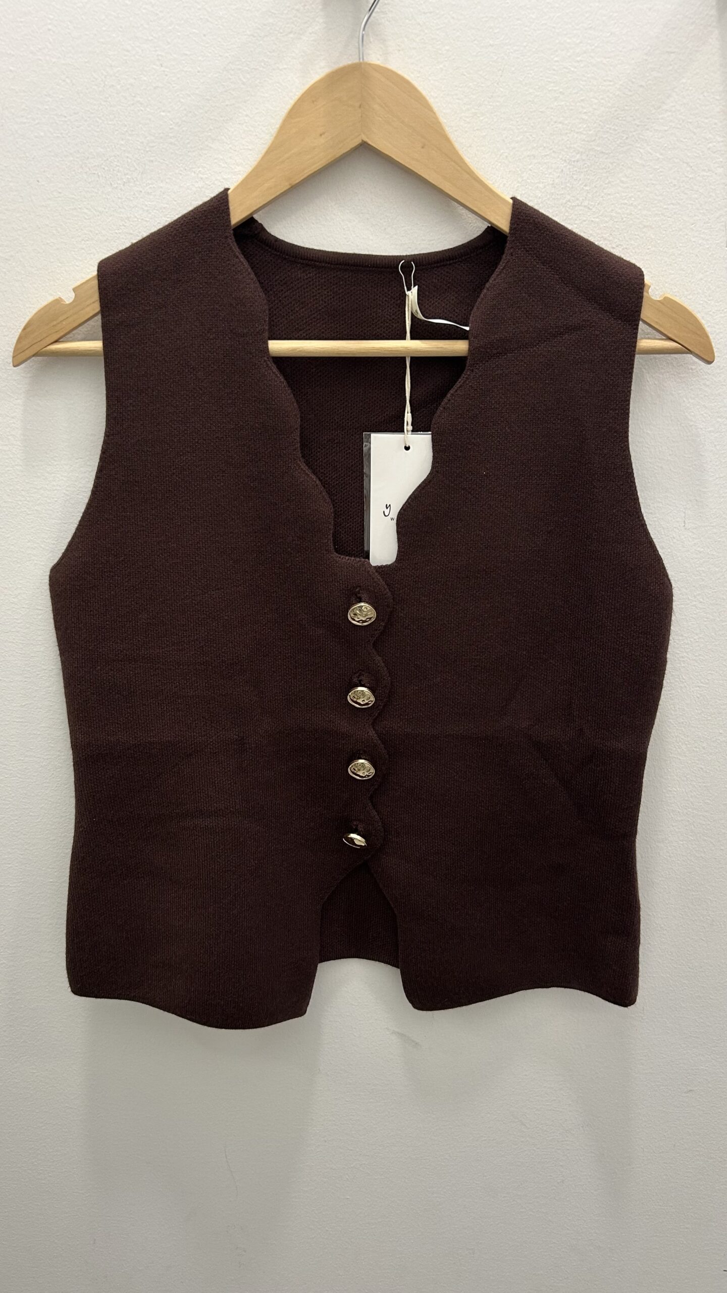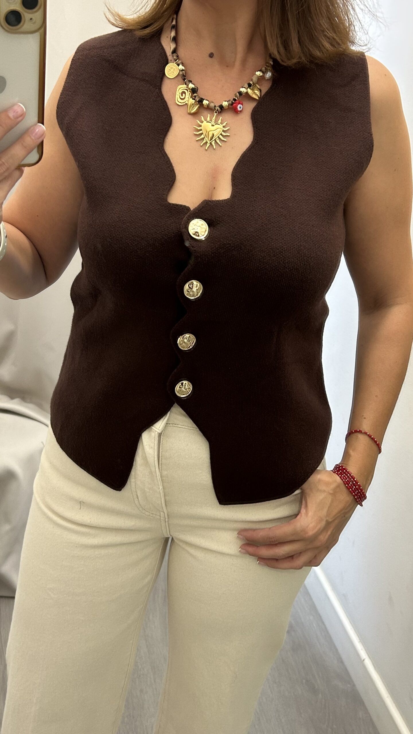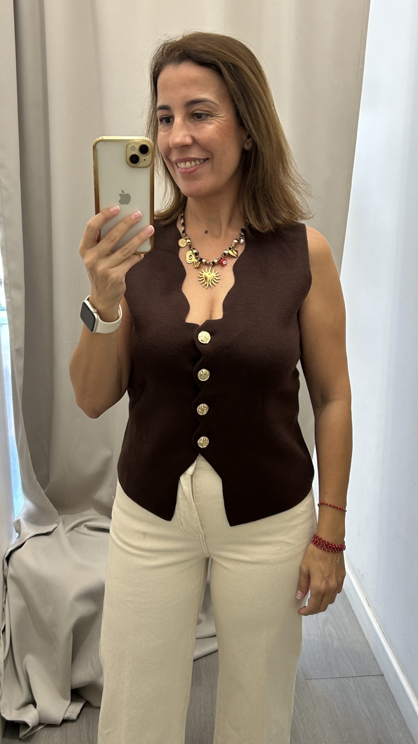 Chaleco de punto con botones dorados delante. Escote cuadrado y abertura en la parte inferior delantera. Disponible también en Crudo