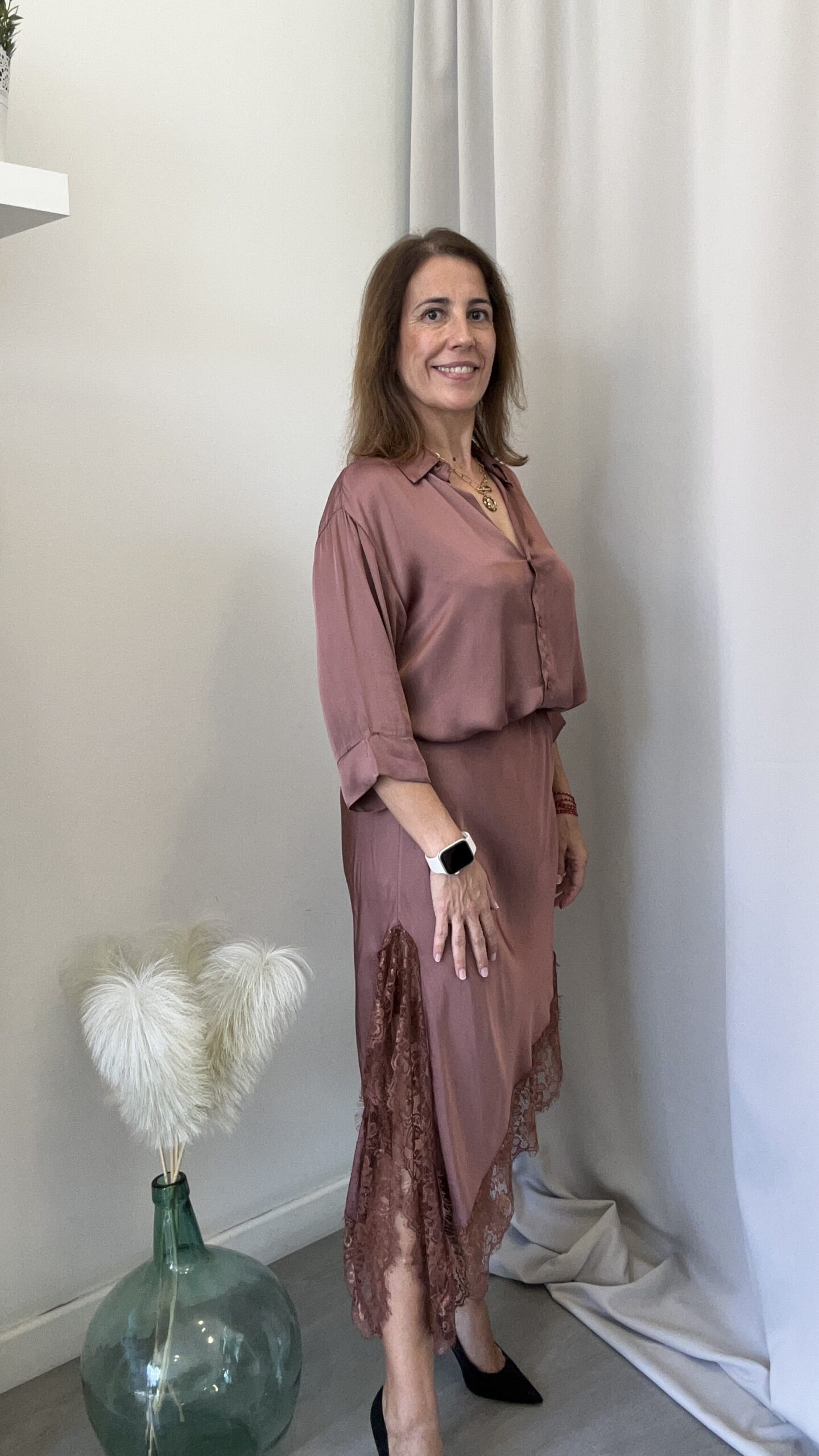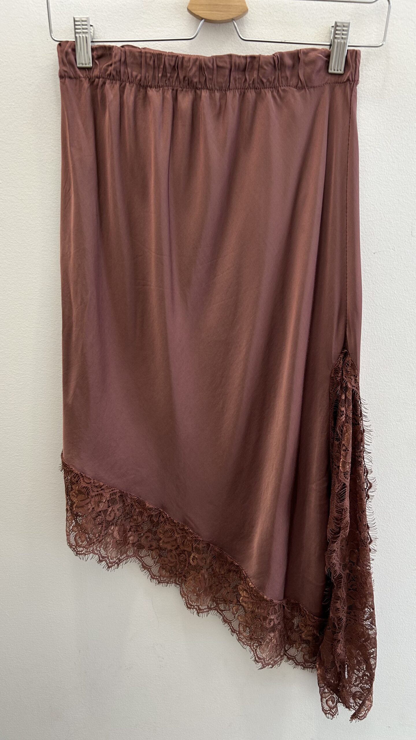Falda asimétrica con goma elástica en la cintura. Puntilla alrededor de la parte inferior. Aberturas en los lados. Talla única (desde la 34 hasta la 42). Disponible también en Negra