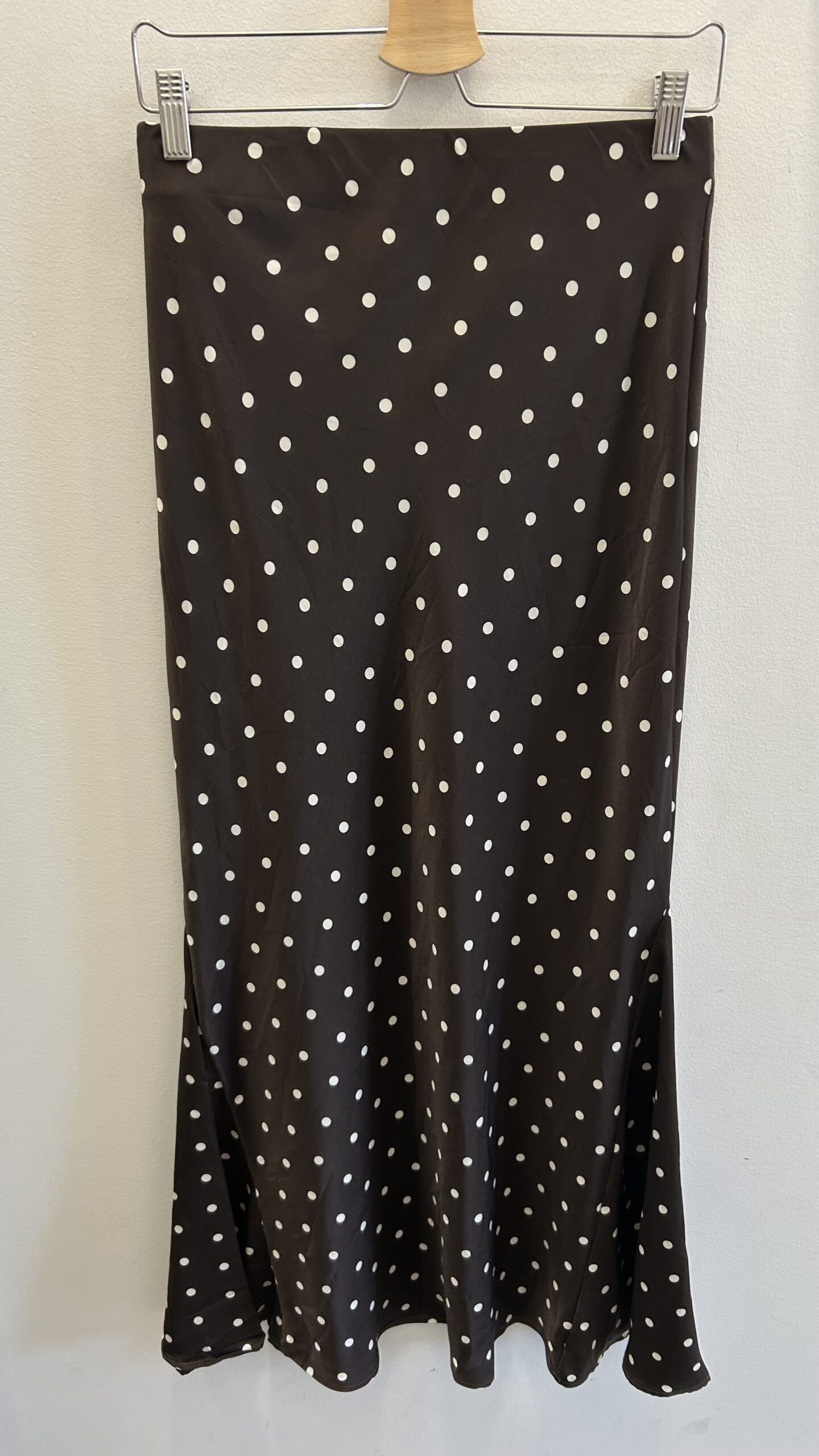 Falda larga en tejido efecto raso con estampado de lunares. Corte evasé con vuelo al final. Goma elástica en la cintura.
