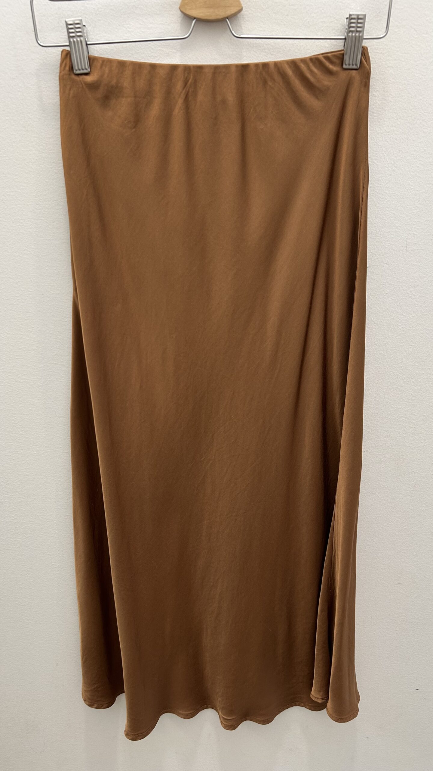 Falda midi en tejido efecto raso. Goma elástica en la cintura. Corte evasé. Talla única (desde la 34 hasta la 44). Disponible también en Negra Rosa Antiguo Verde Oscuro Verde y Marrón