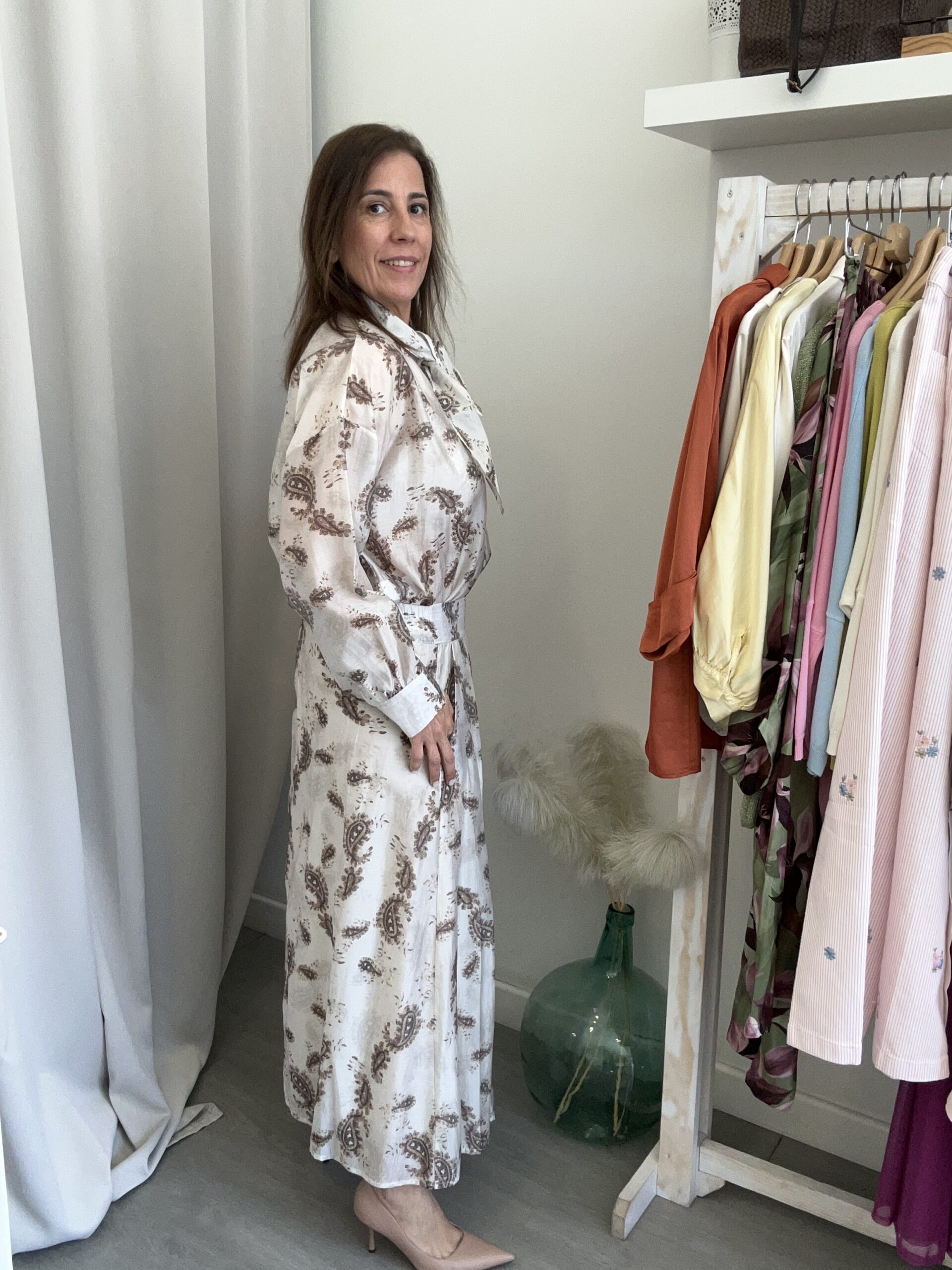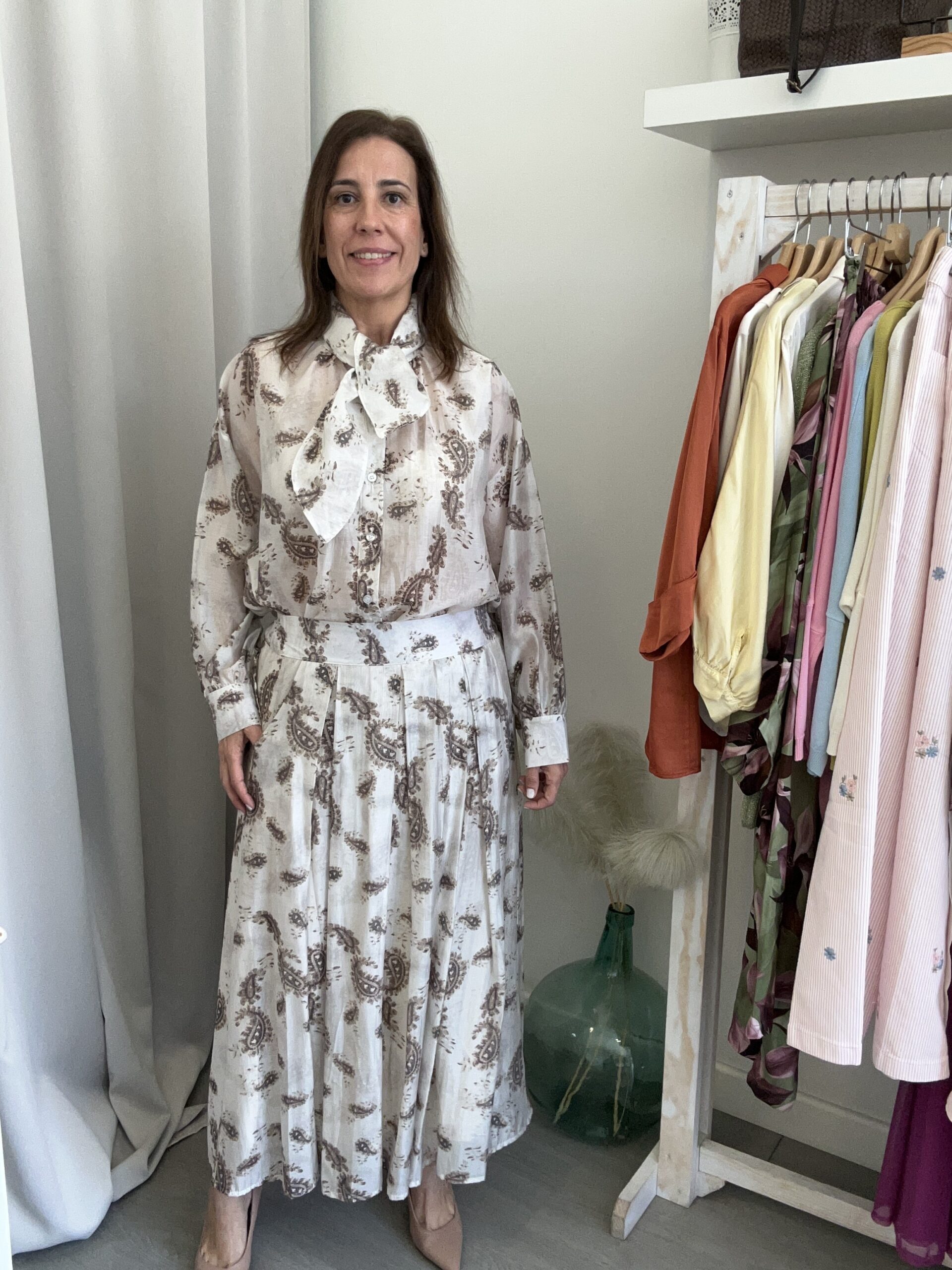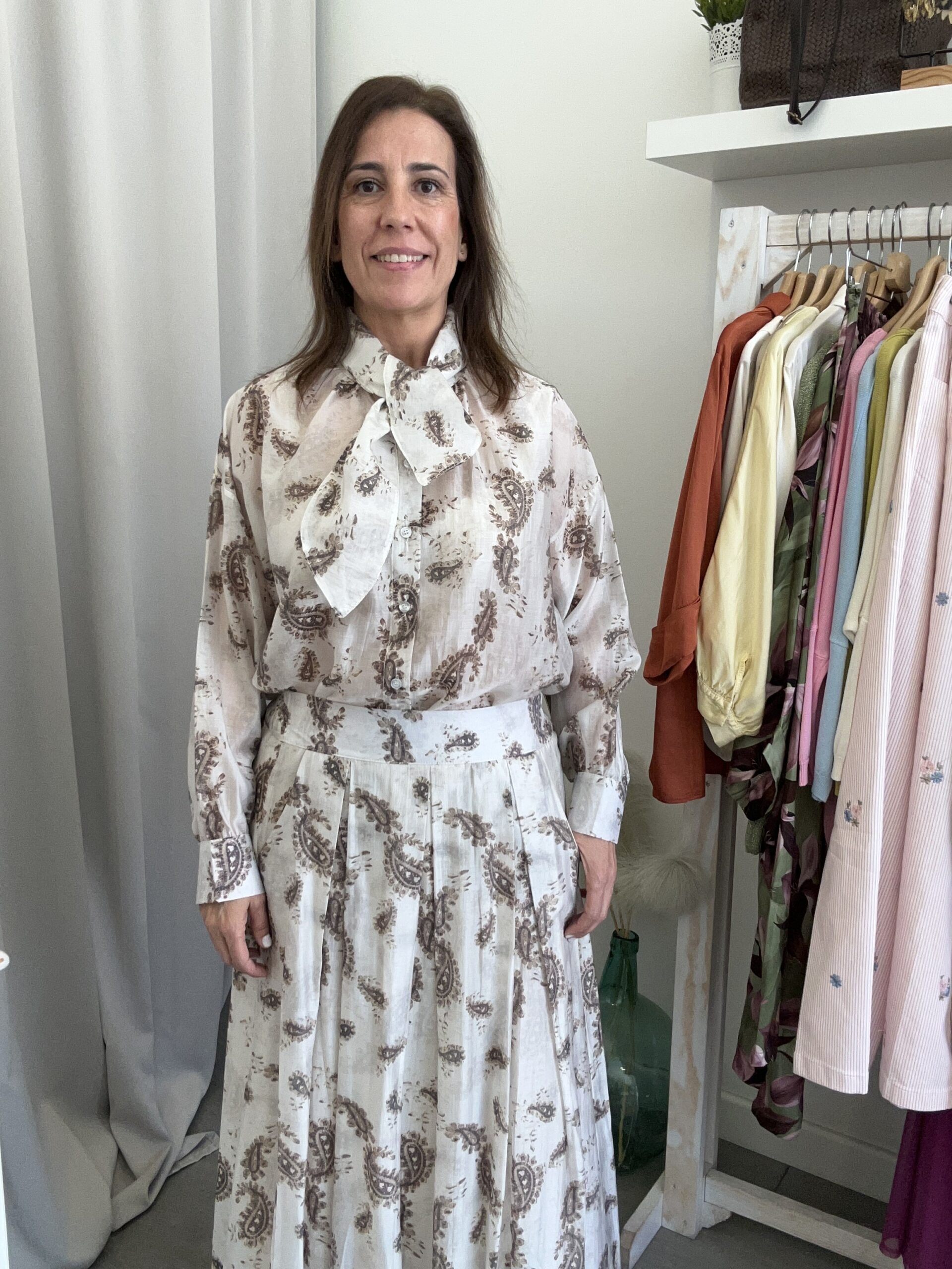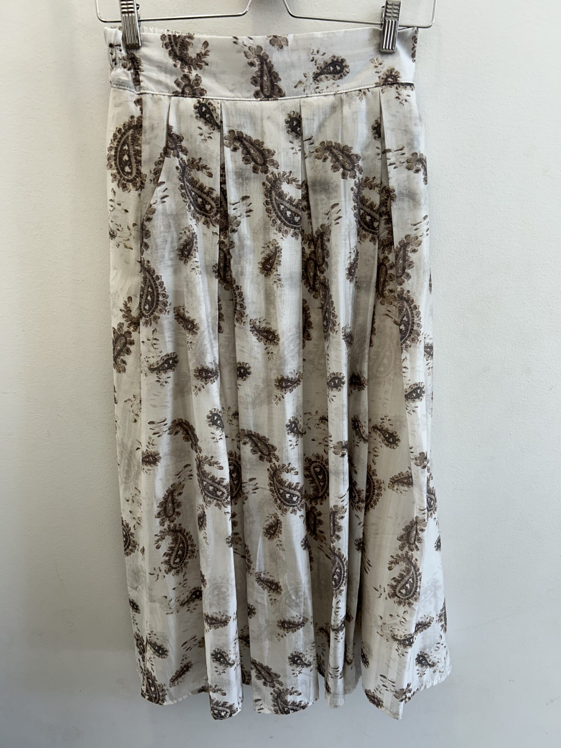 Falda midi de tablas con bolsillos en los lados. Tejido efecto gasa. Estampado tipo cashmire en marrón sobre fondo crudo. Goma elástica en la parte de de detrás de la cintura. Talla única (desde la 36 hasta la 42). Disponible también en Verde
