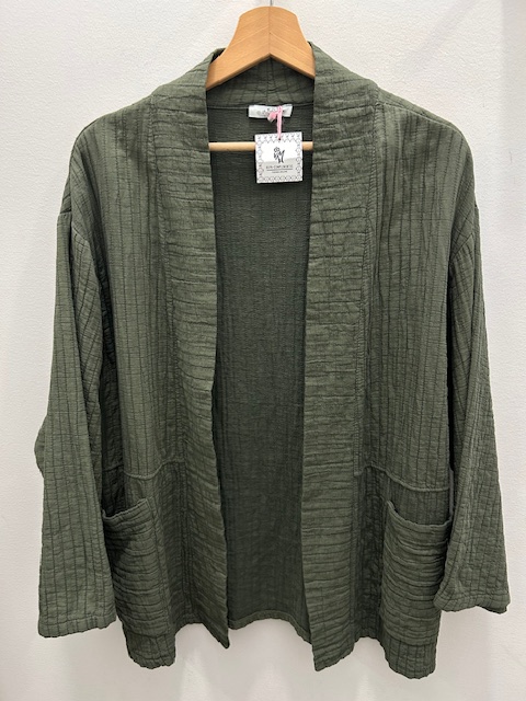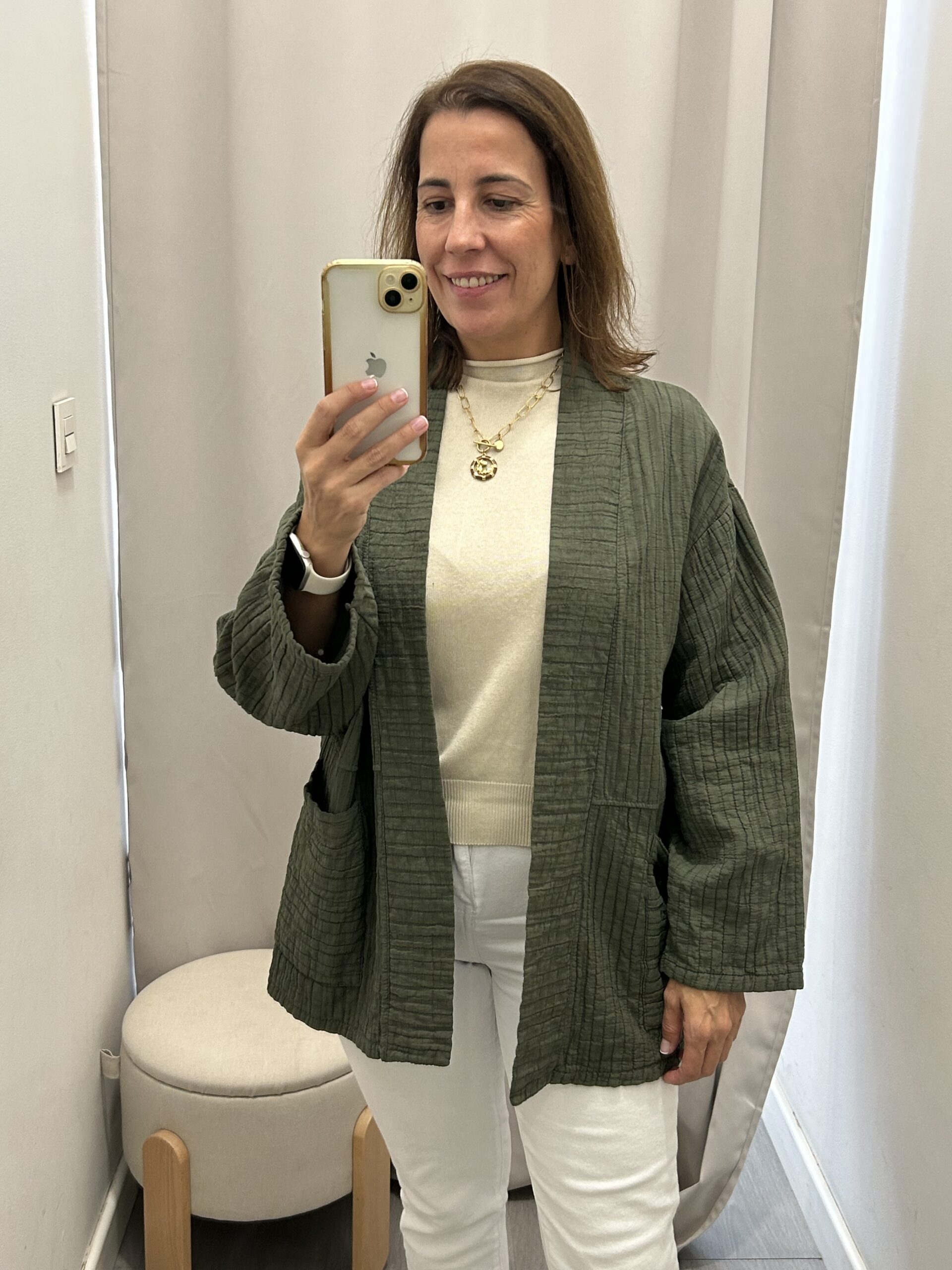 Kimono de manga larga sin botones y bolsillos en la parte delantera. Corte recto, queda ancho. Disponible también en Rosa Trigo y Marrón