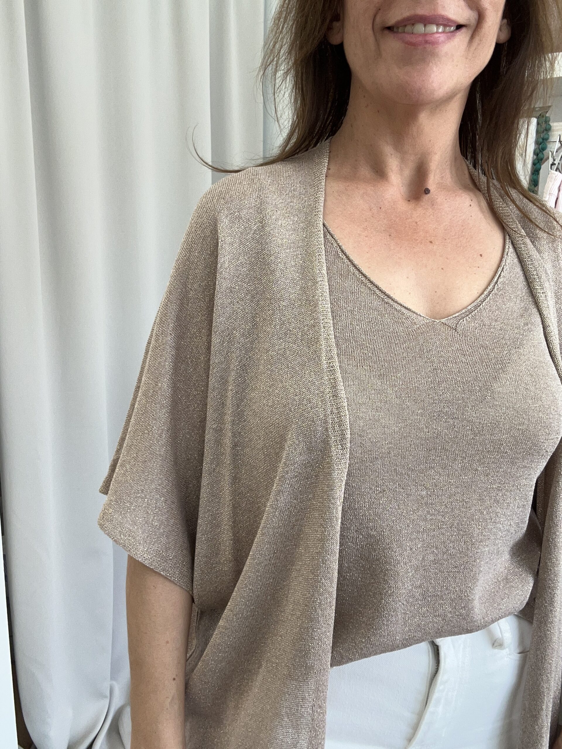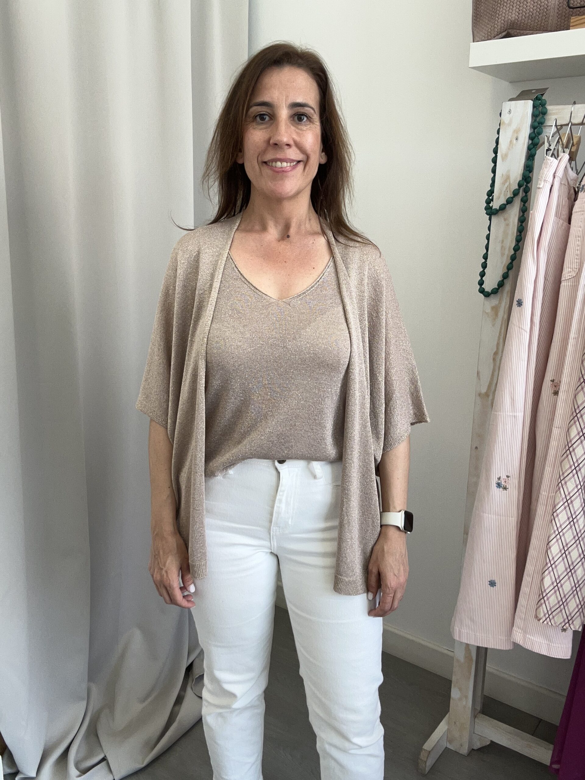 Kimono en tejido efecto lurex de manga al codo. El brillo que tiene es en tono dorado. Es largo y queda abierto, no lleva botones. Talla única (desde la 36 hasta la 44). Disponible también en verde Dorado y Rosa