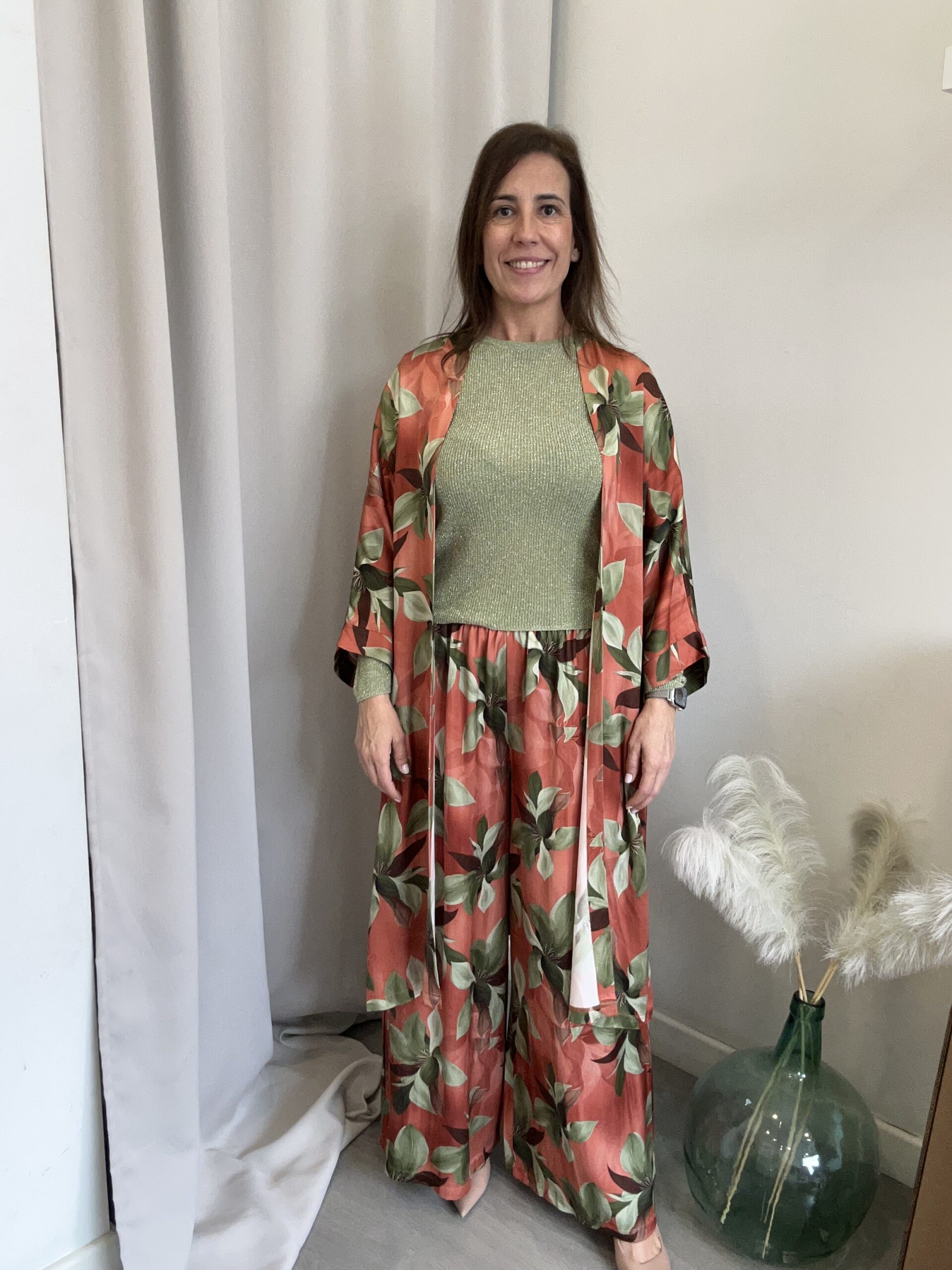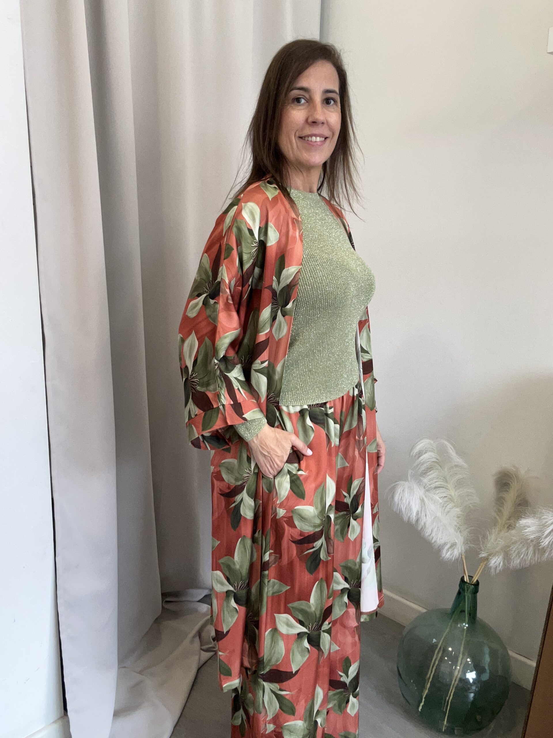 Kimono largo y de manga larga en tejido efecto raso y estampado de flores sobre fondo naranja. No tiene bolsillos ni botones. Talla única (desde la 36 hasta la 46).
