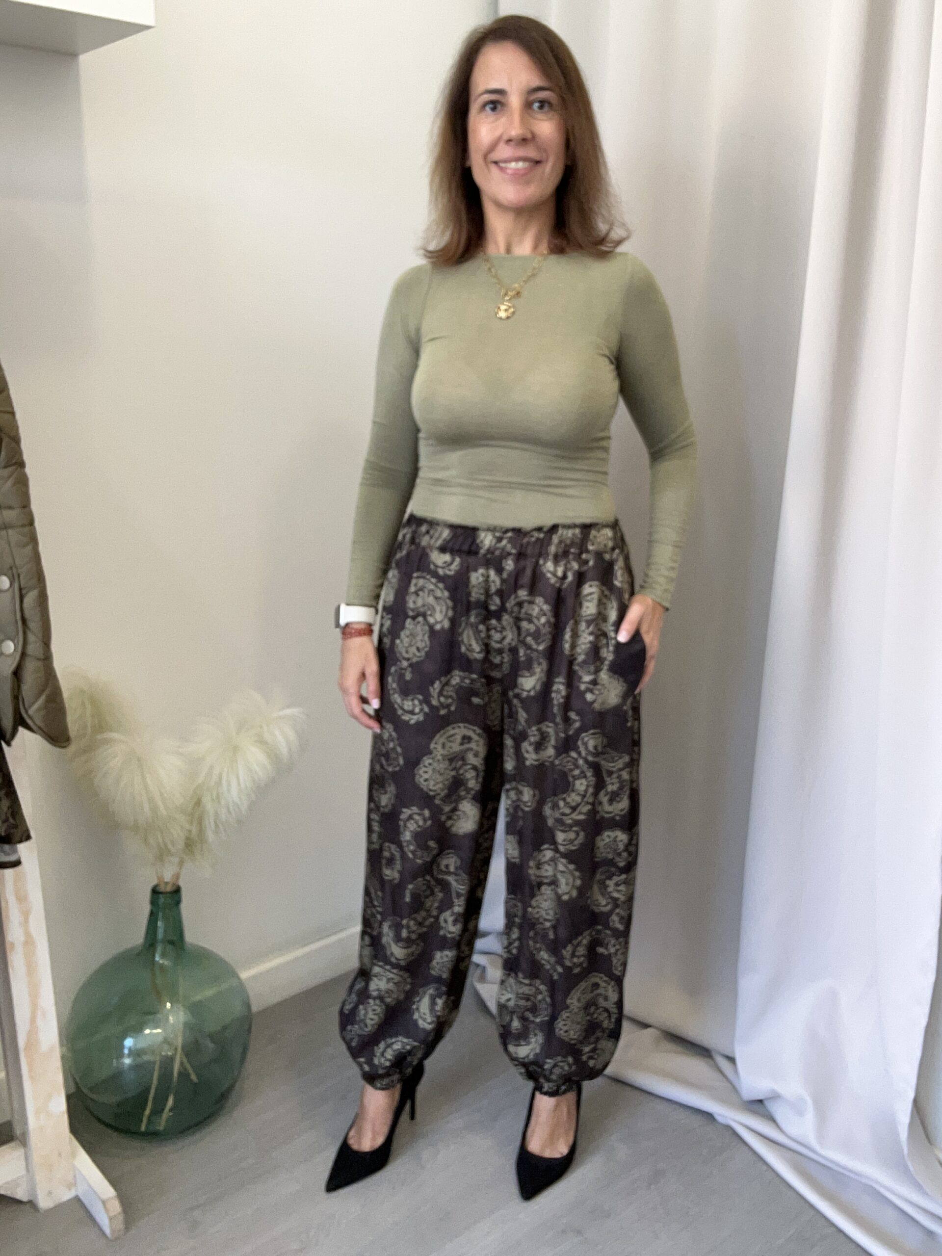 Pantalón bombacho en tejido efecto raso y estampado tipo cashmire. Goma elástica en la cintura y en la parte inferior de la pierna. Bolsillos a los lados. Talla única (desde la 34 hasta la 42).