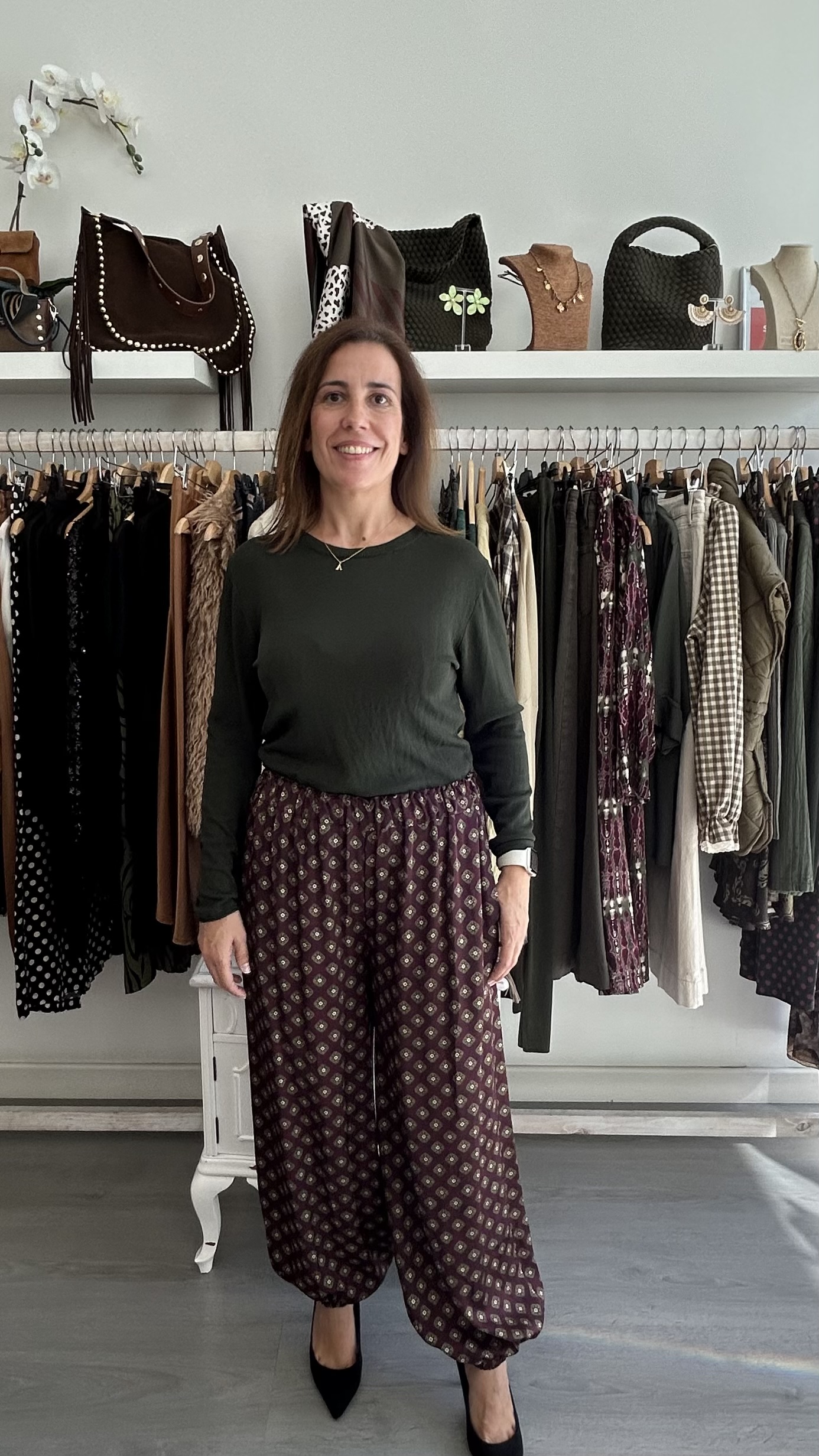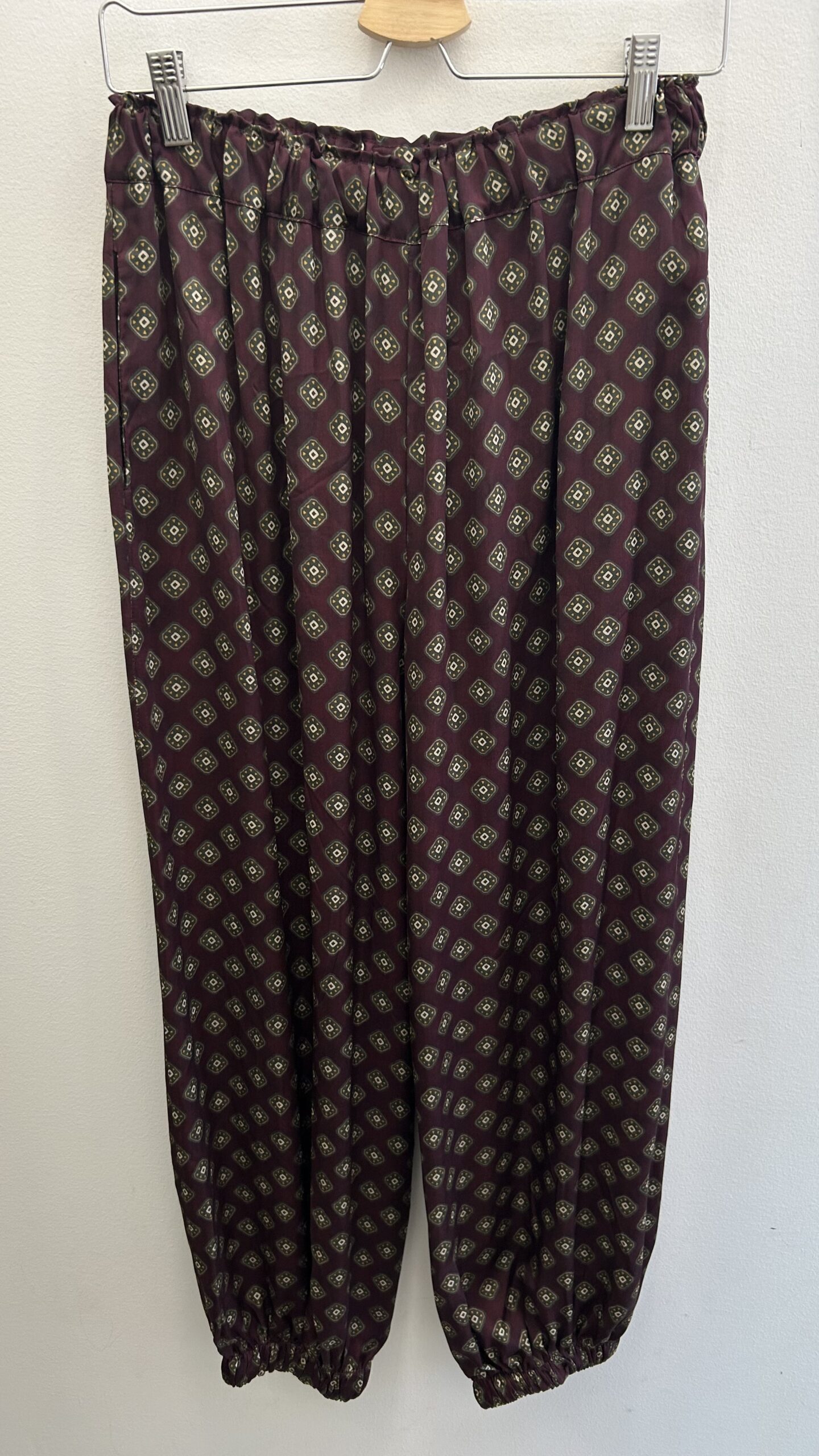 Pantalón bombacho en tejido efecto raso estampado sobre fondo granate. Goma elástica en la cintura y bolsillos en los lados. Talla única (desde la 36 hasta la 44). Disponible también en Negro