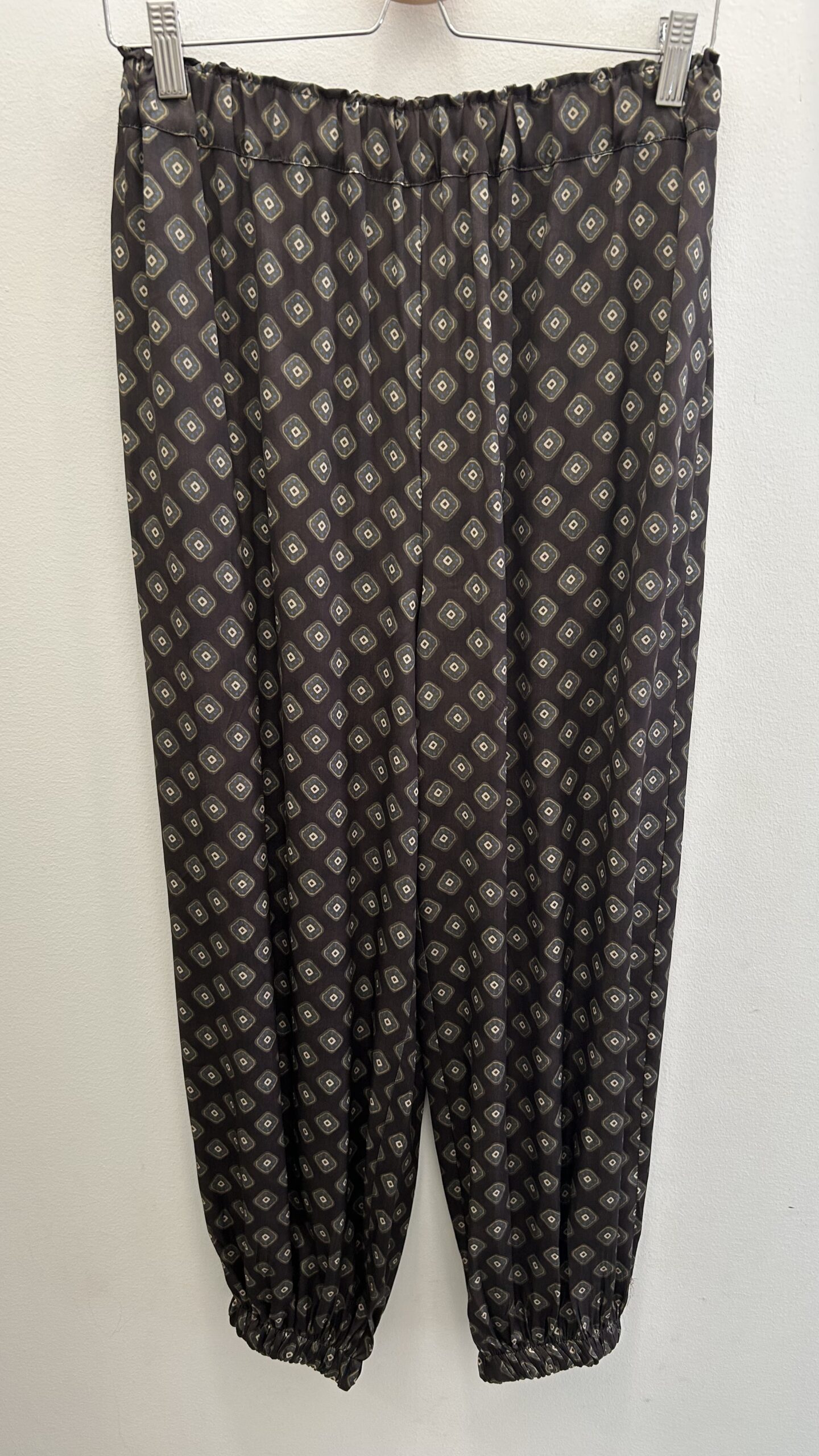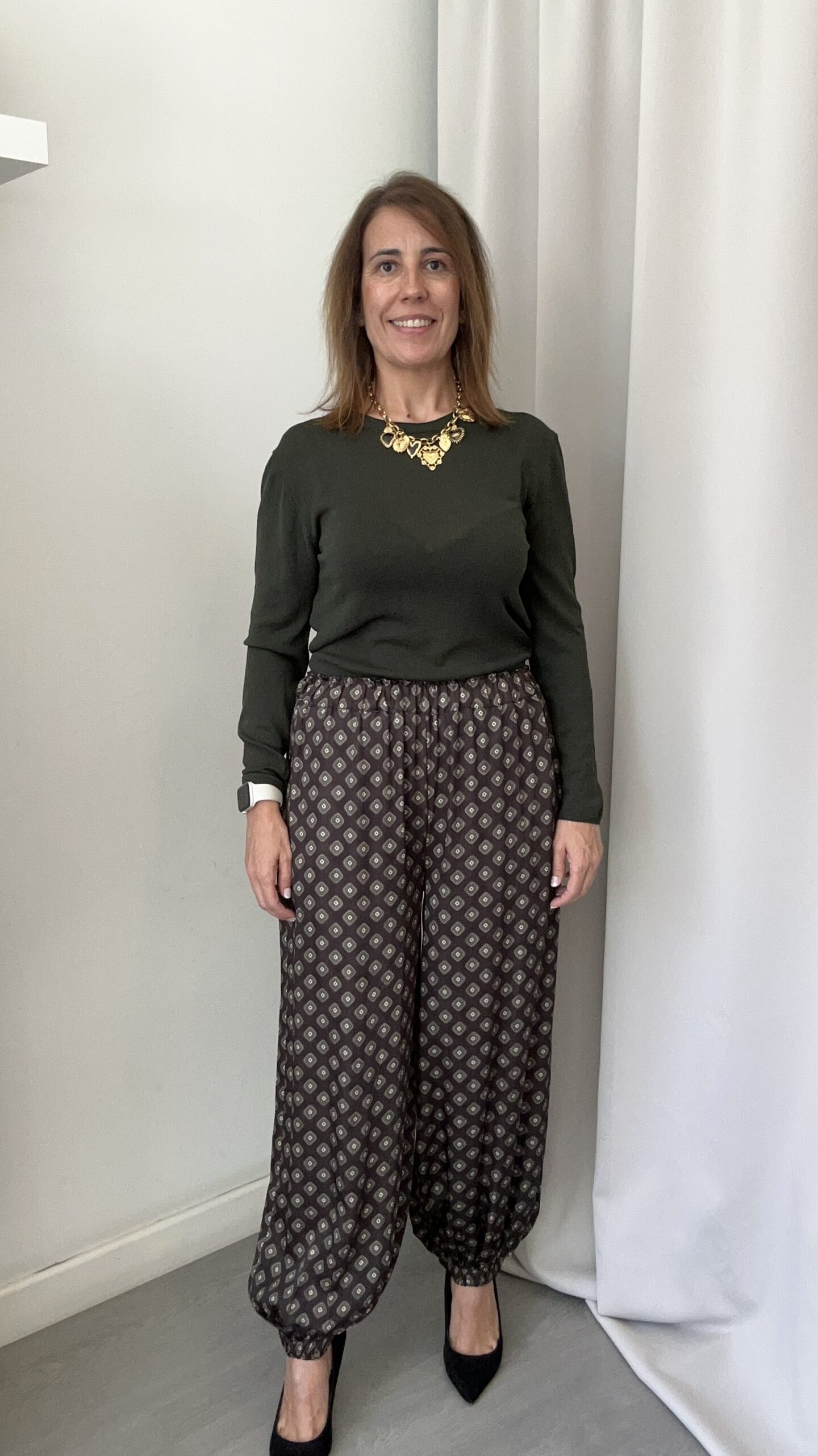 Pantalón bombacho en tejido efecto raso estampado sobre fondo marrón. Goma elástica en la cintura y bolsillos en los lados. Talla única (desde la 36 hasta la 44). Disponible también en Negro