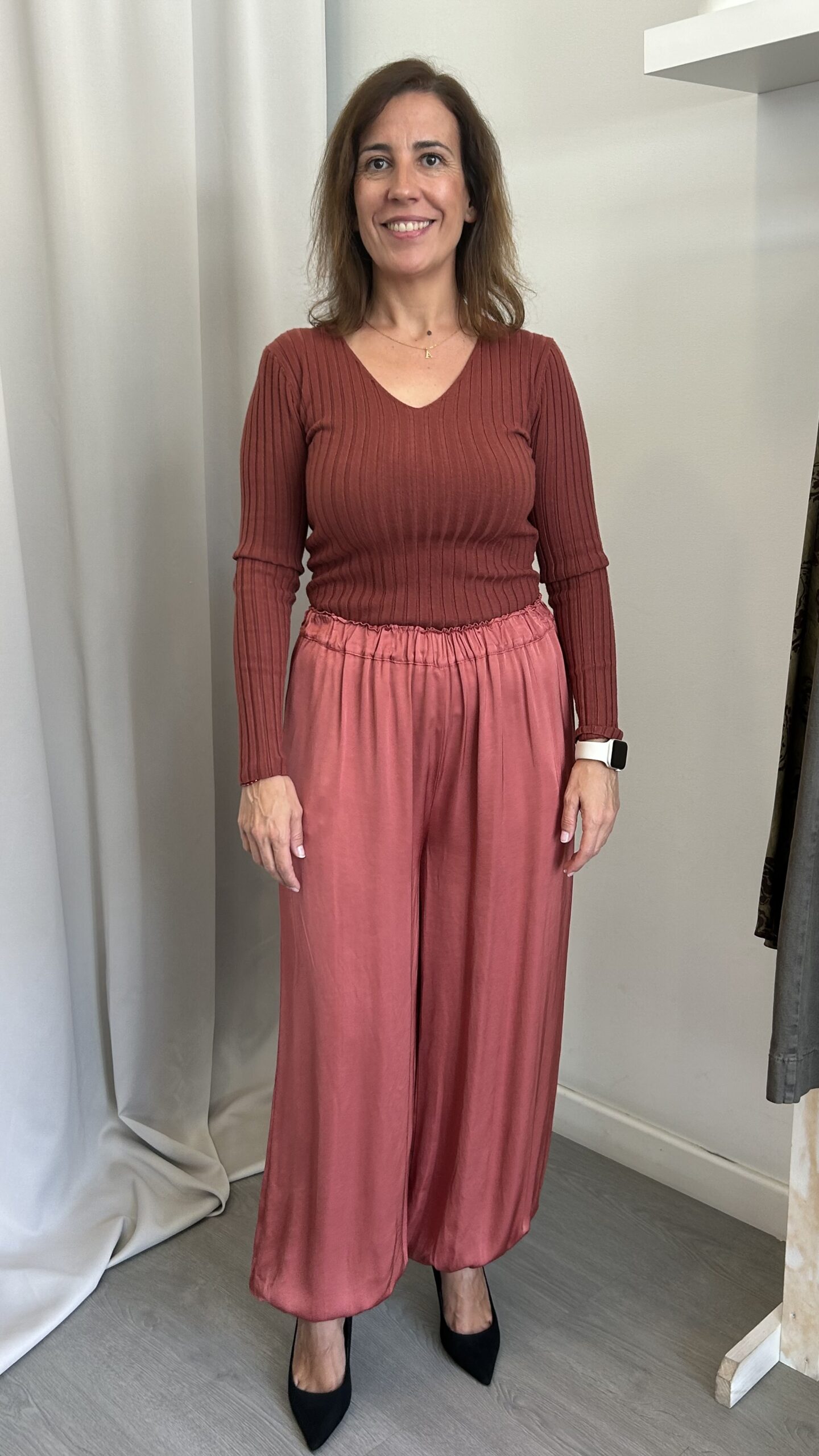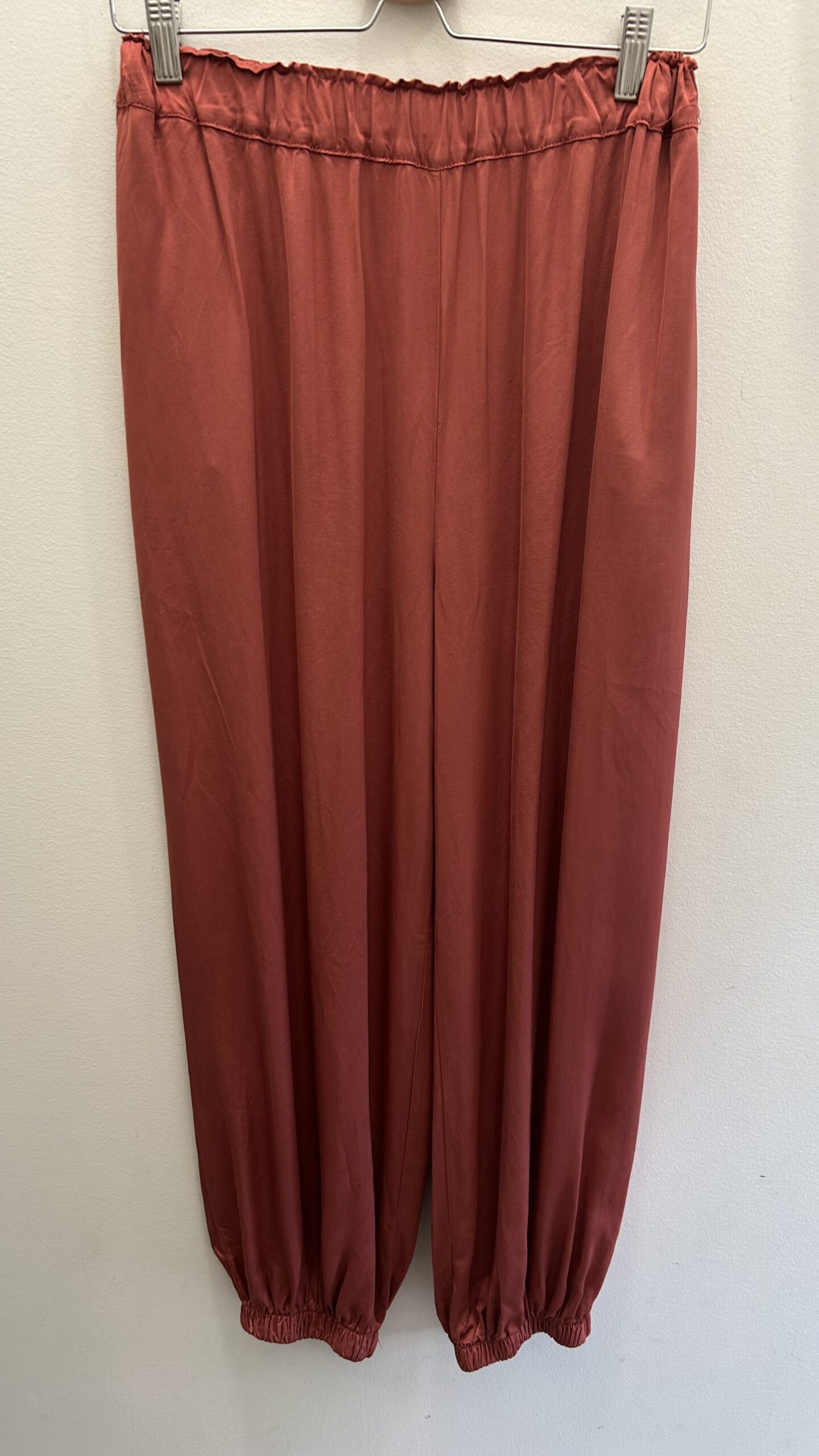 Pantalón bombacho en tejido efecto raso y goma elástica en la cintura. Bolsillos a los lados y goma elástica ajustable al final de la pierna. Talla única (desde la 36 hasta la 42). Disponible también en Rosa Antiguo camel y Gris