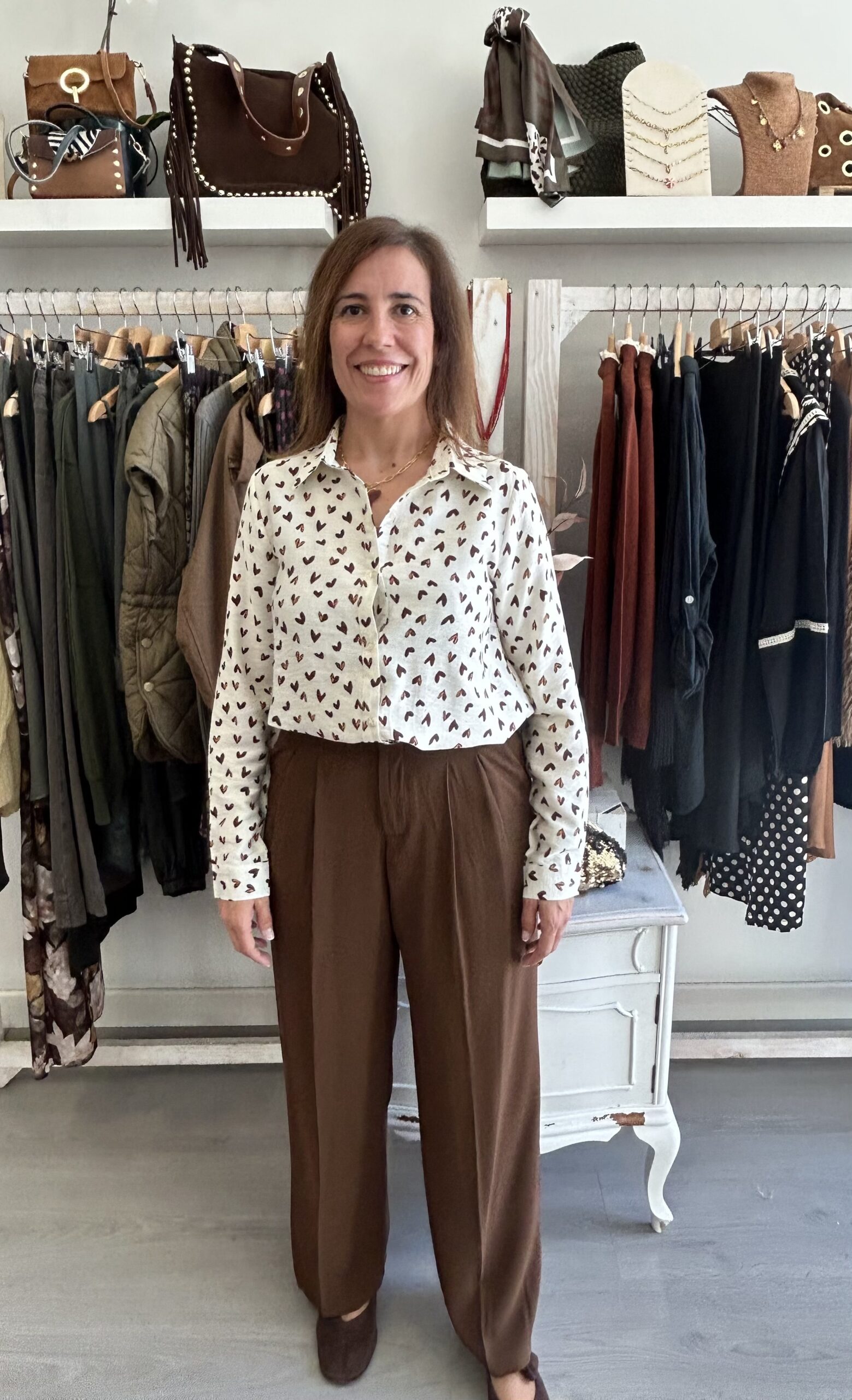Pantalón de pata ancha y talle alto. Cinturón y cierre con cremallera. Detalle de pinzas en la pata. Bolsillos en los lados.