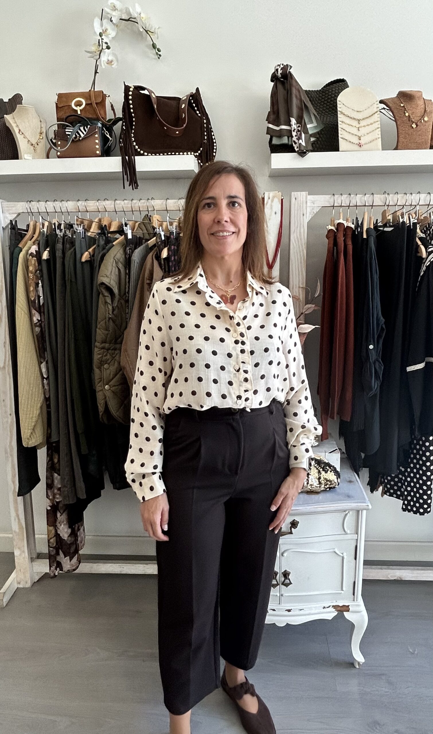 Pantalón de tiro alto y bolsillos en los lados. Pinza de vestir en la parte delantera. Trabillas en la cintura para ponerle un cinturón. Pata recta y goma elástica en la parte de detrás.