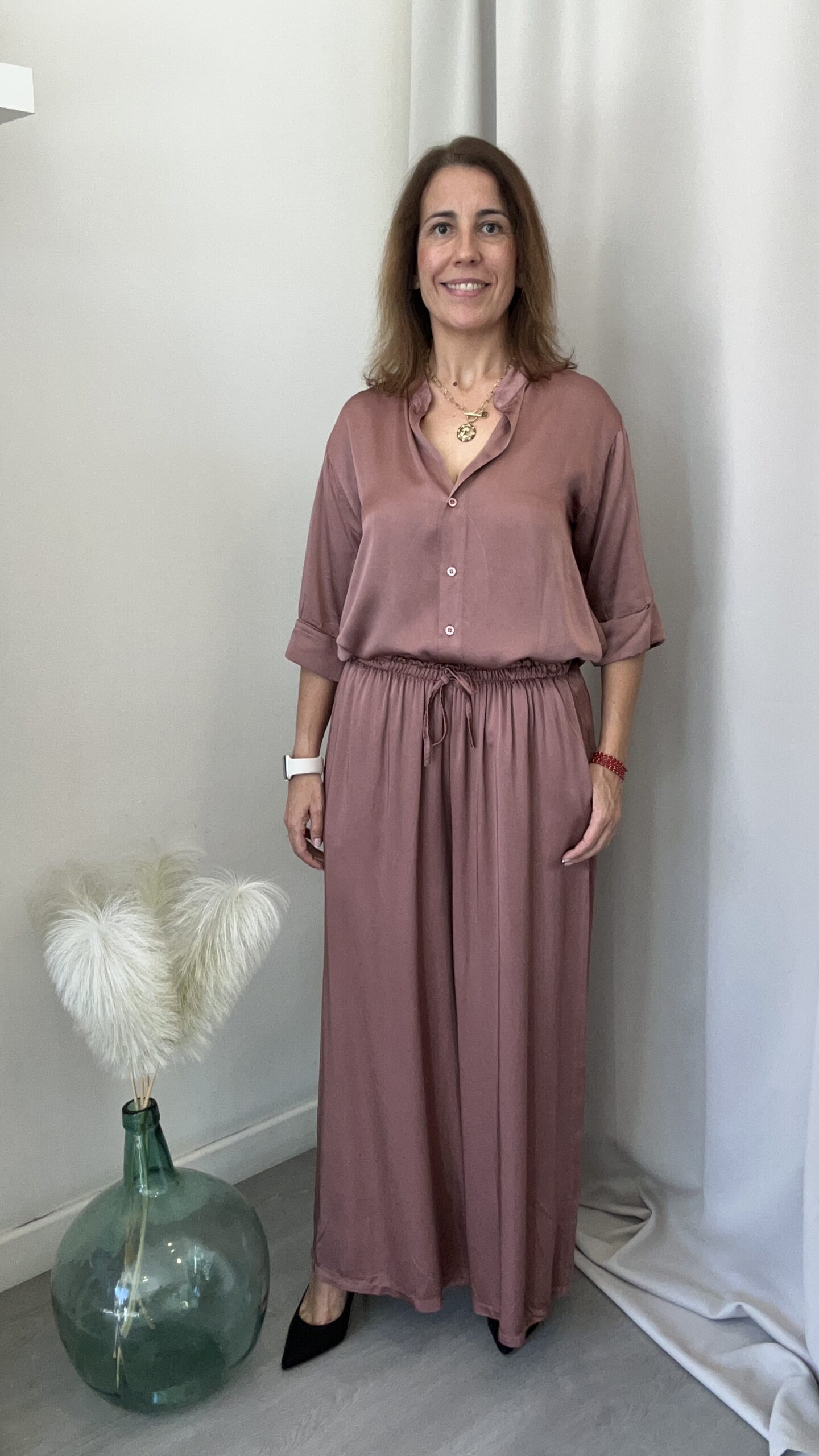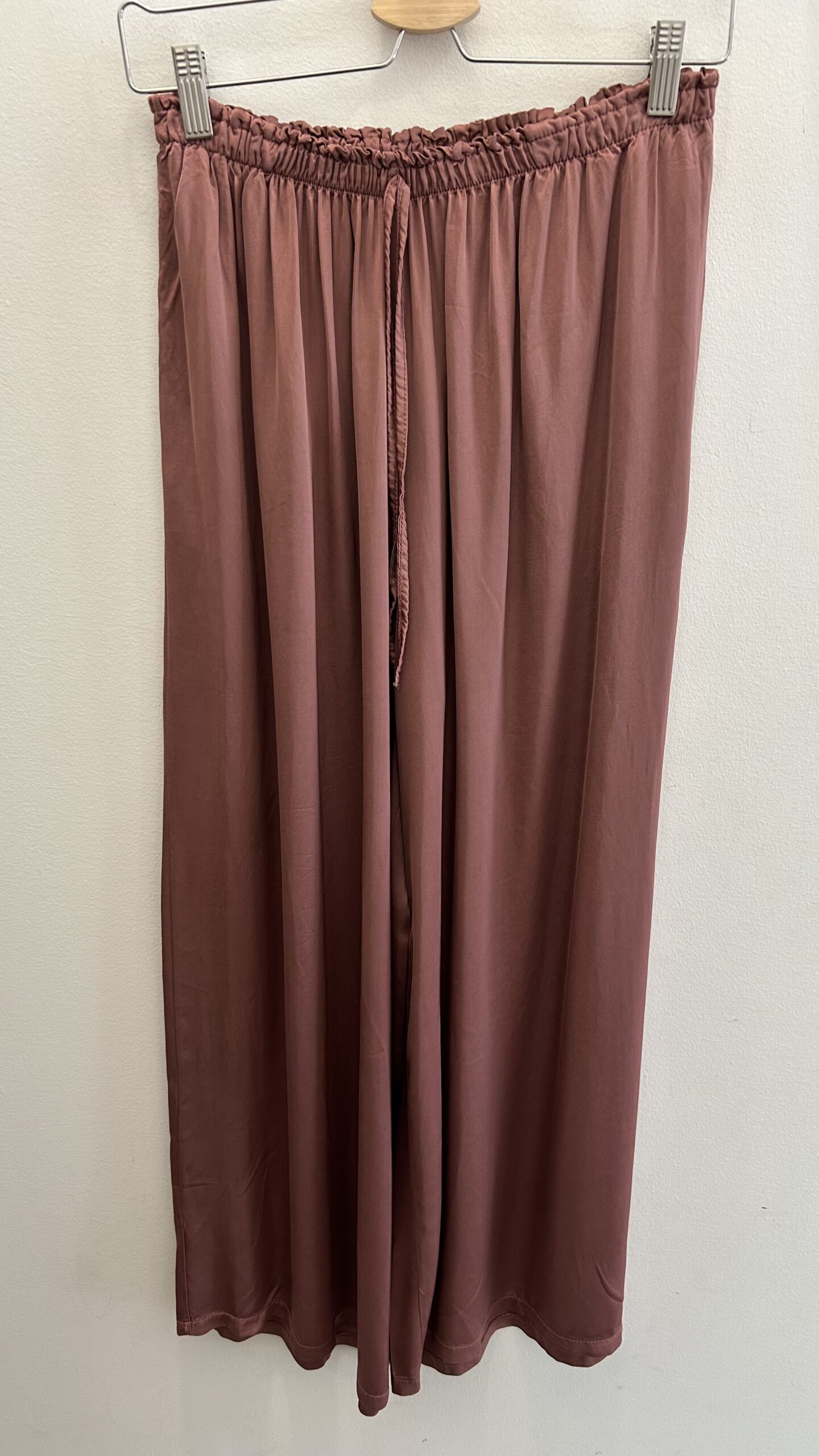Pantalón en tejido efecto raso de pata ancha y goma elástica en la cintura. Lazo en la parte delantera y bolsillos en los lados. Talla única (desde la 36 hasta la 44). Disponible también en Granate