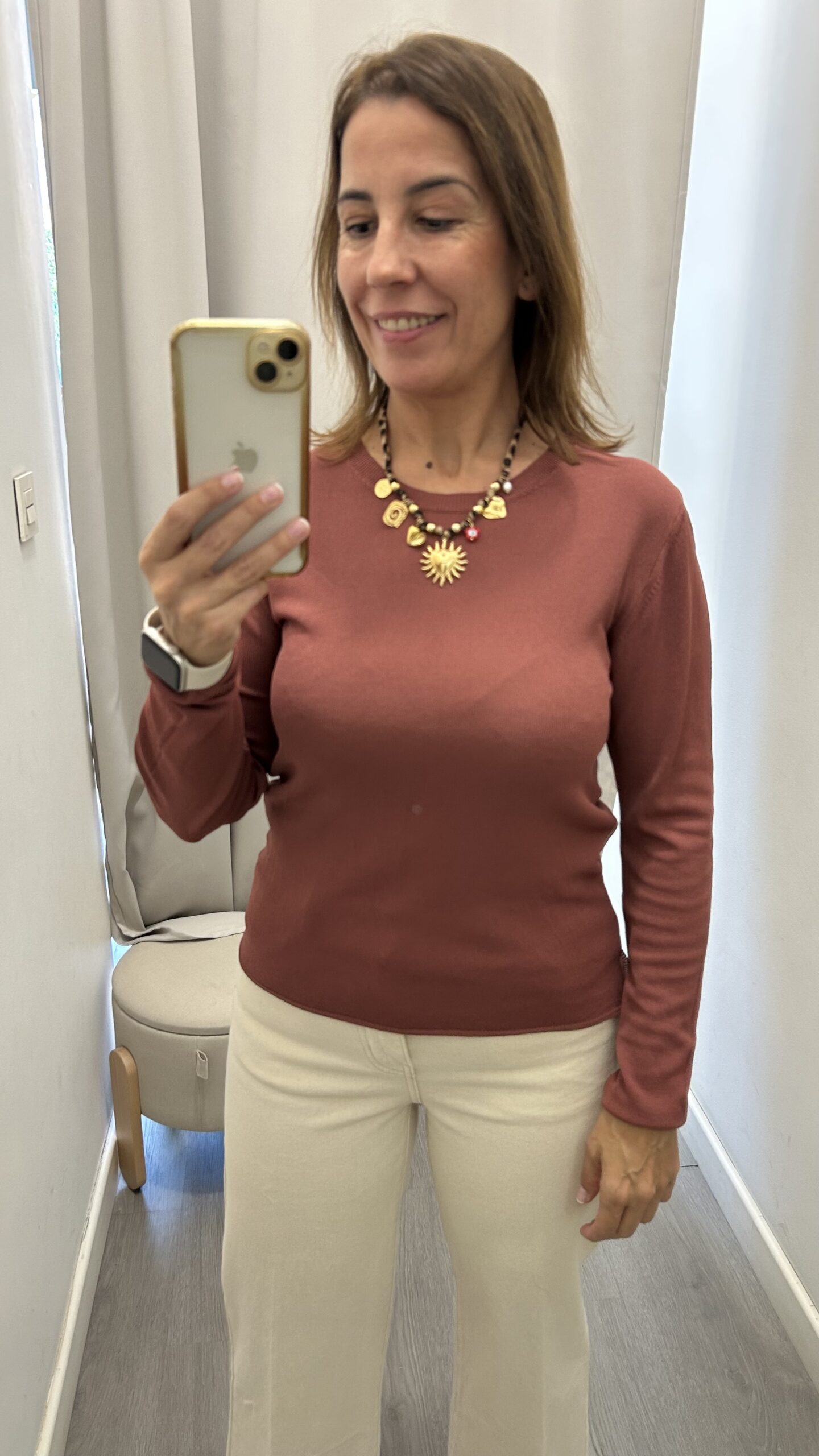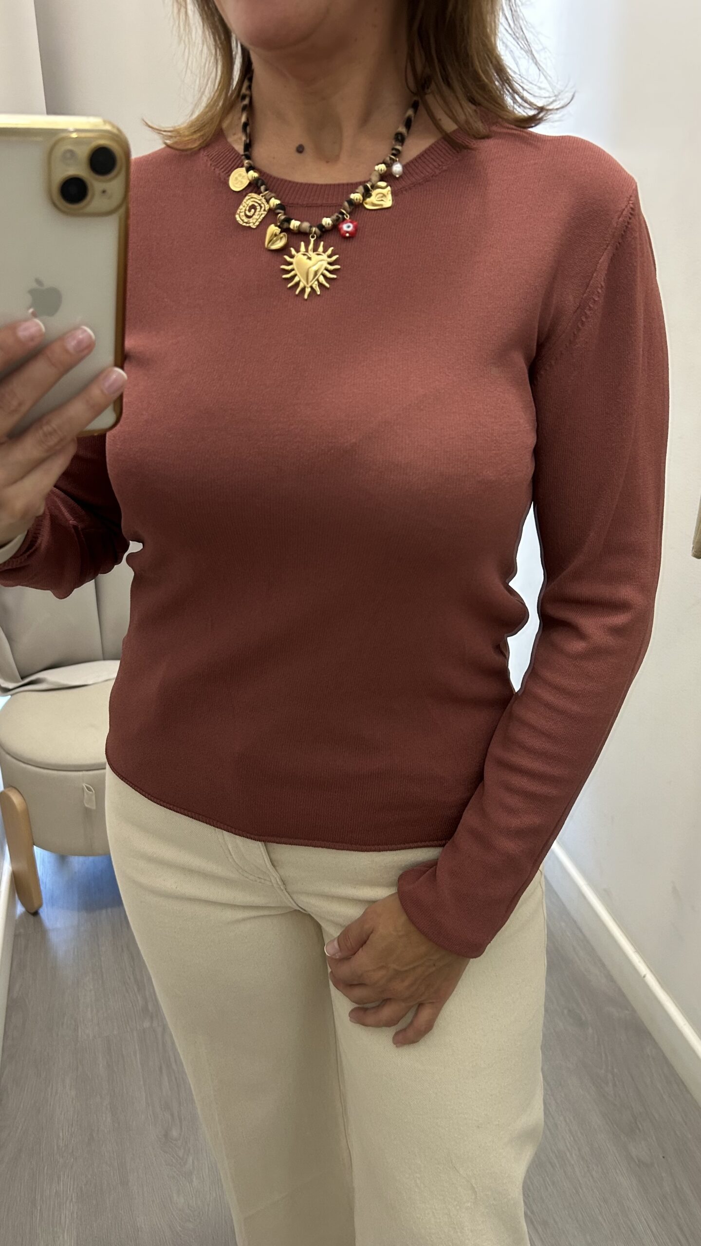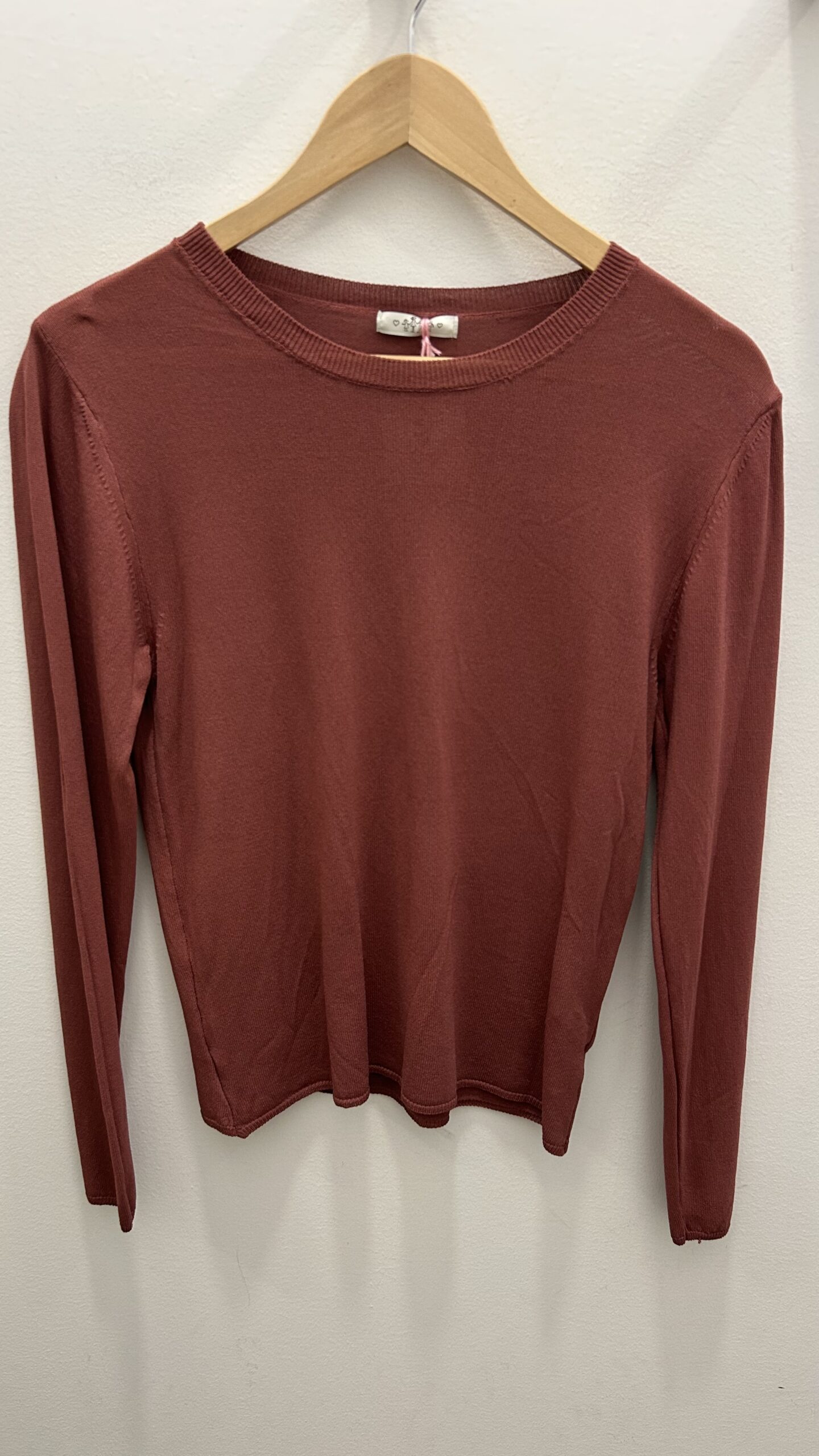 Suéter de manga larga y cuello redondo en punto fino. Corte básico. Costuras en los hombros. Talla única (desde la 34 hasta la 40). Disponible también en Verde y beige