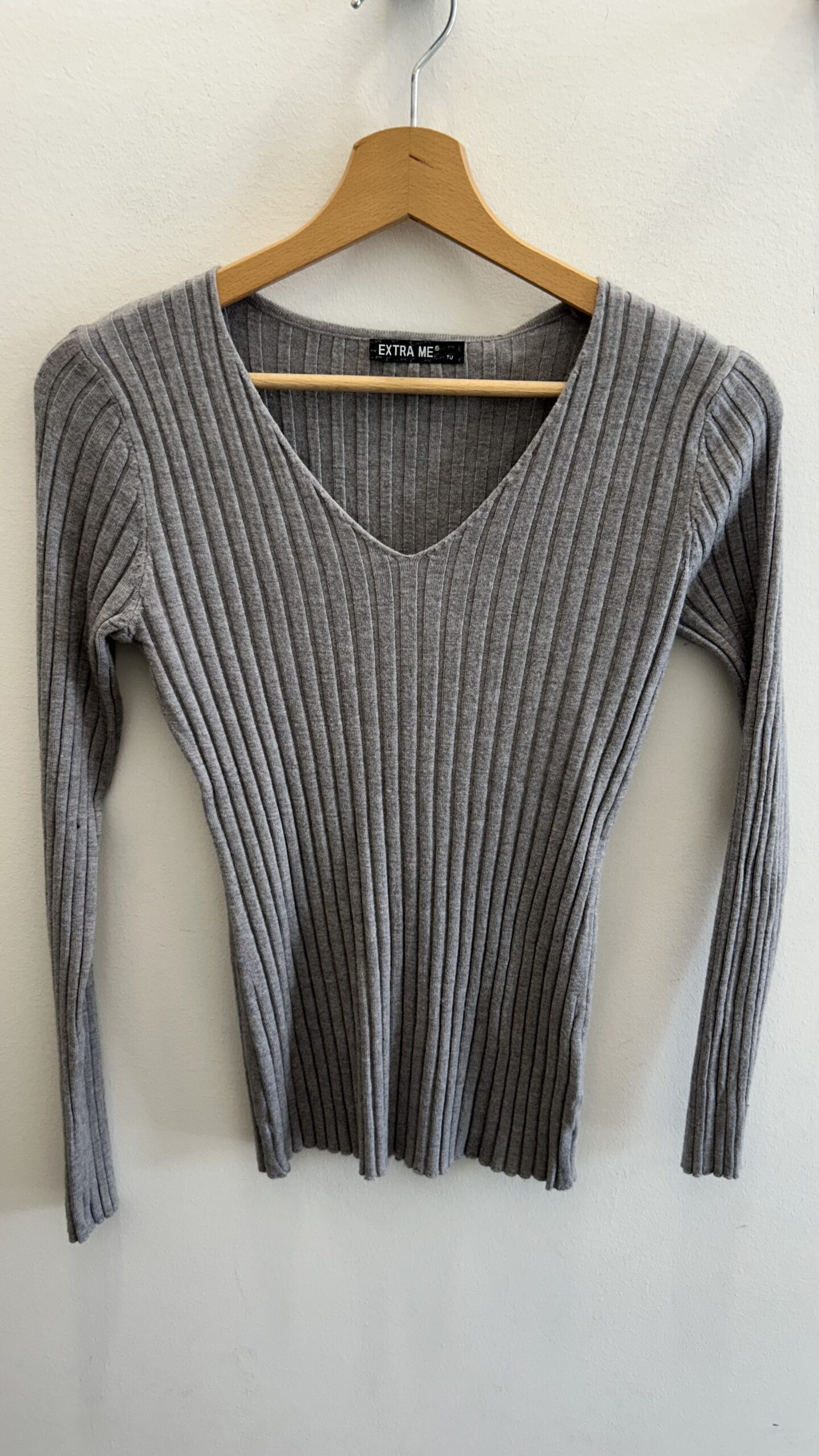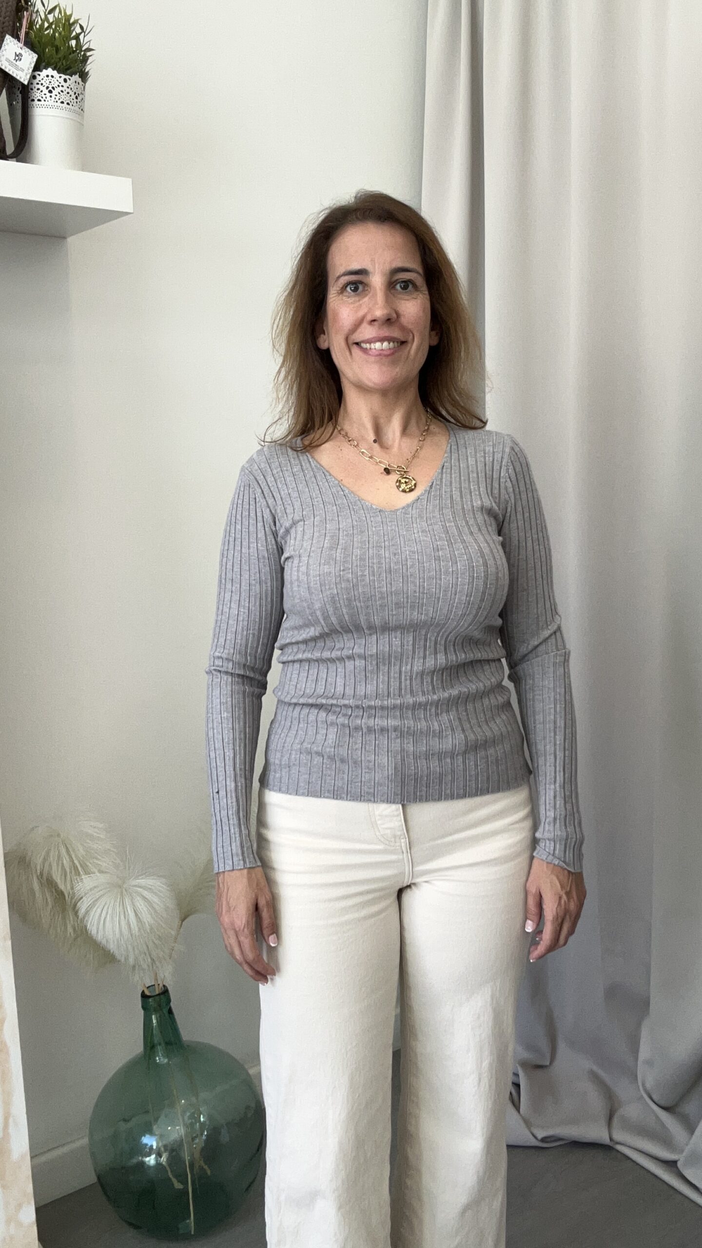 Suéter de punto en canalé y manga larga. Cuello en pico. Queda ajustado. Talla única (desde la 34 hasta la 40). Disponible también en crudo Verde Teja granate Caqui y Negro