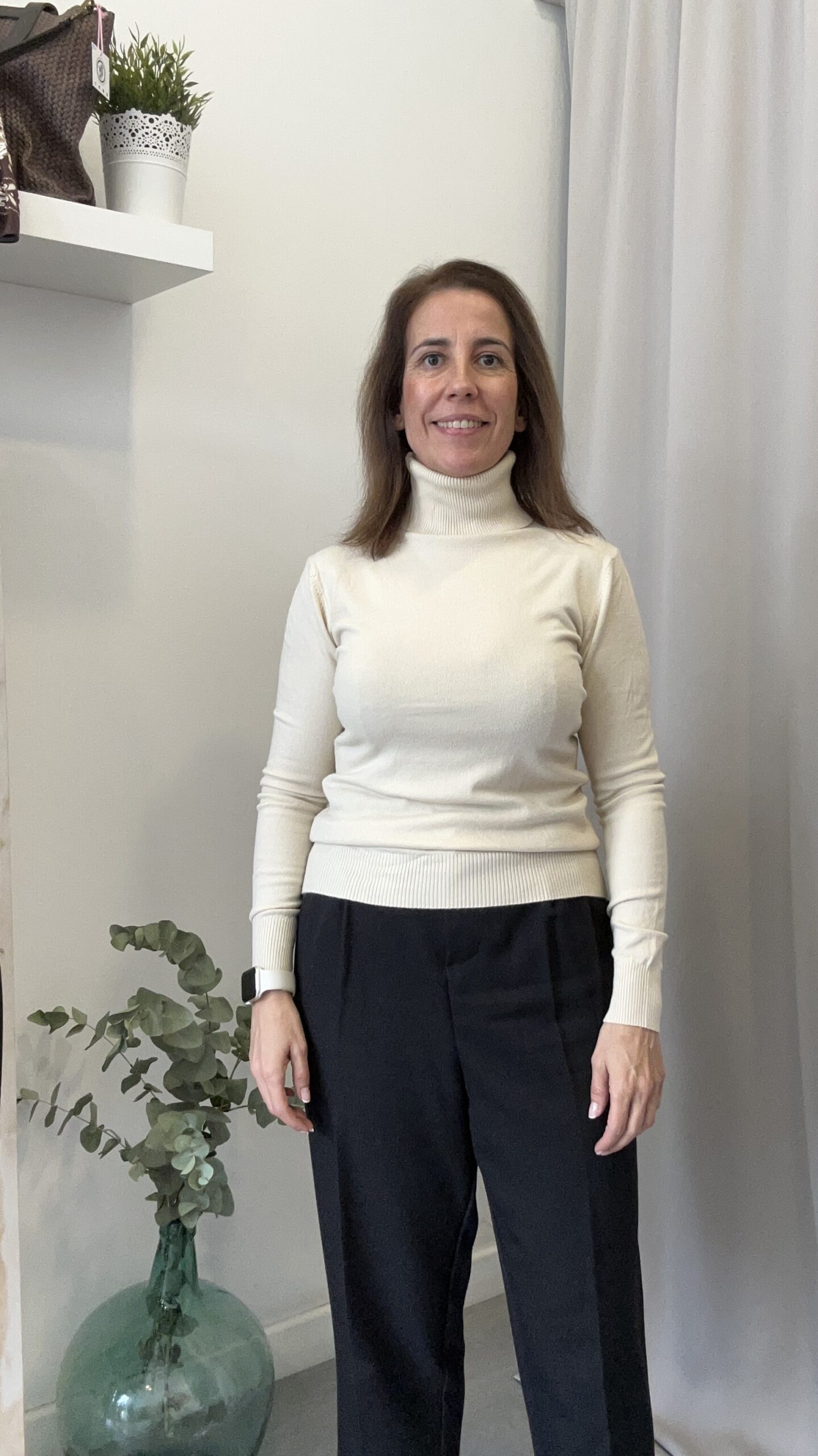 Suéter de manga larga y cuello vuelto. Corte básico. Terminaciones en rib en los puños, cuello y parte inferior. Queda ajustado. Talla única ( desde la 36 hasta la 42). Disponible en Beige Granate Verde y Fucsia