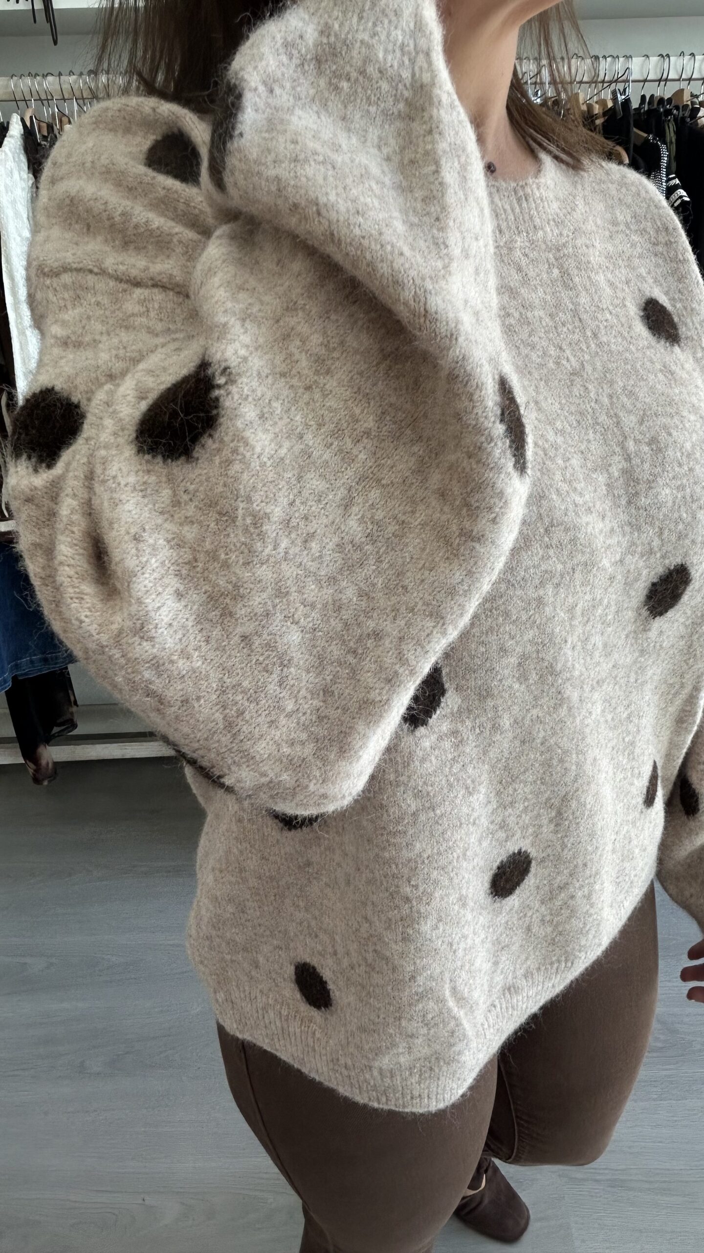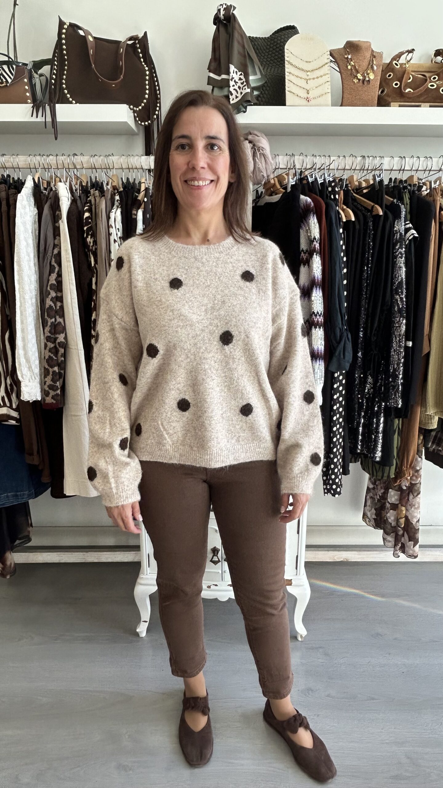 Suéter de manga larga y cuello redondo con lunares en tono marrón. Es gordito y ancho. Talla única (desde la 36 hasta la 42).