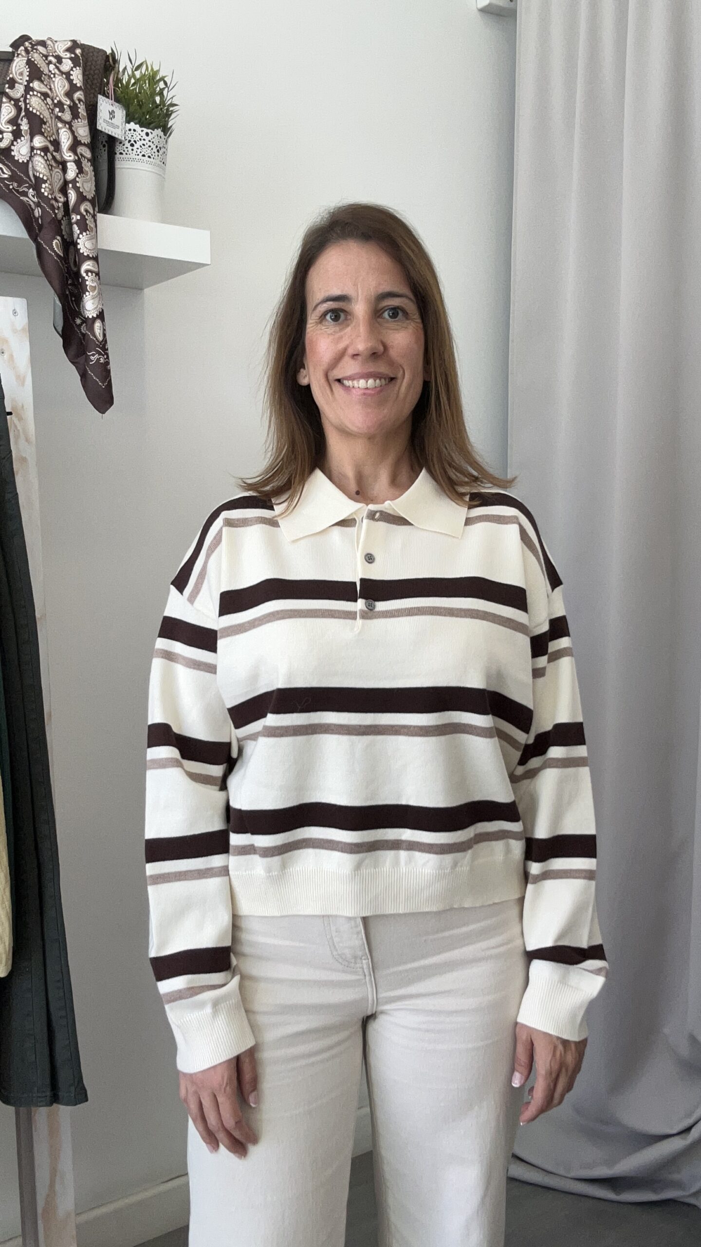 Suéter de manga larga y cuello tipo polo en rayas sobre fondo crudo. Talla única (desde la 36 hasta la 42). También disponible en rosa