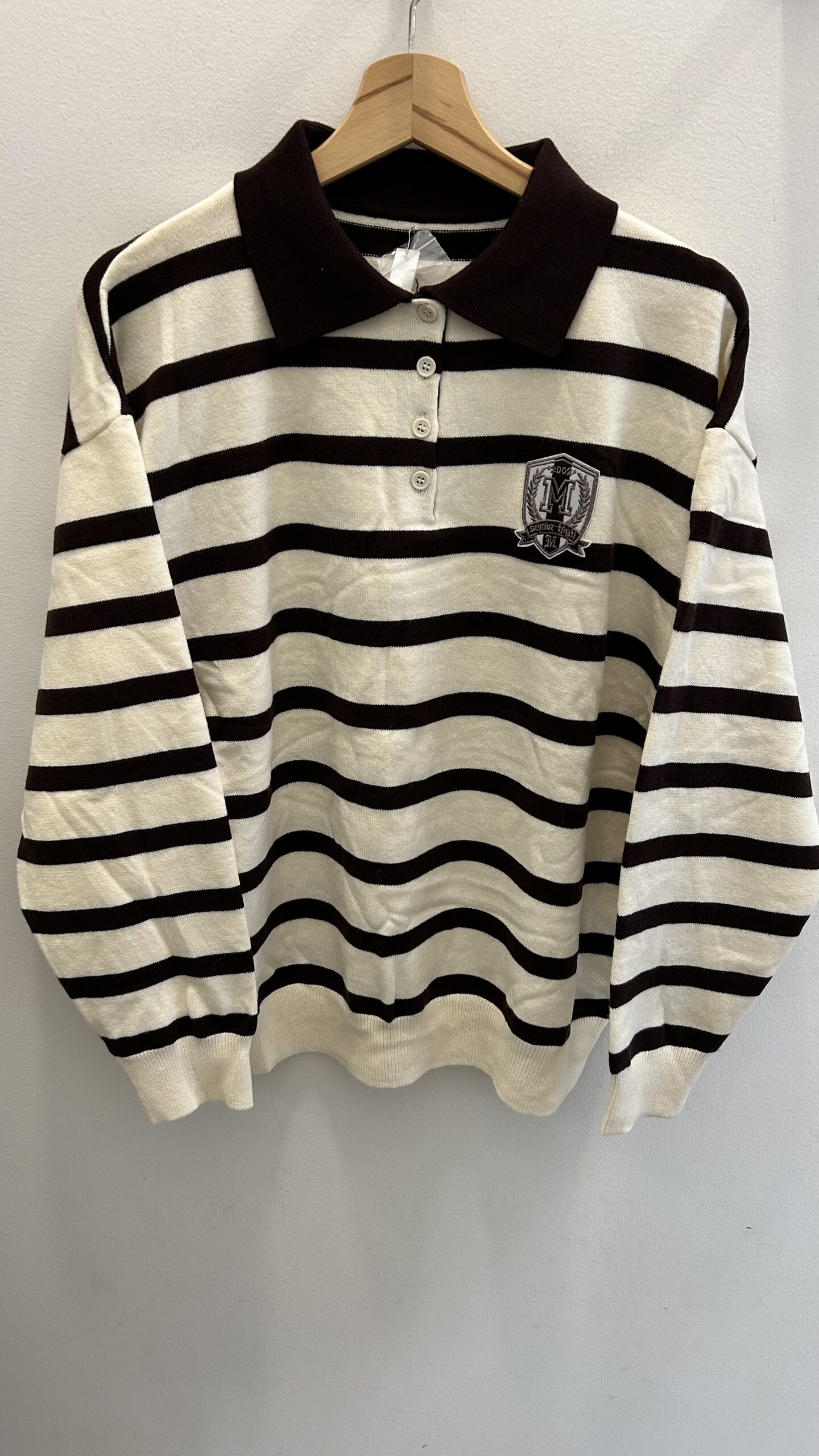 Suéter de manga larga y cuello tipo polo en rayas marrones sobre fondo crudo. Talla única (desde la 36 hasta la 42).