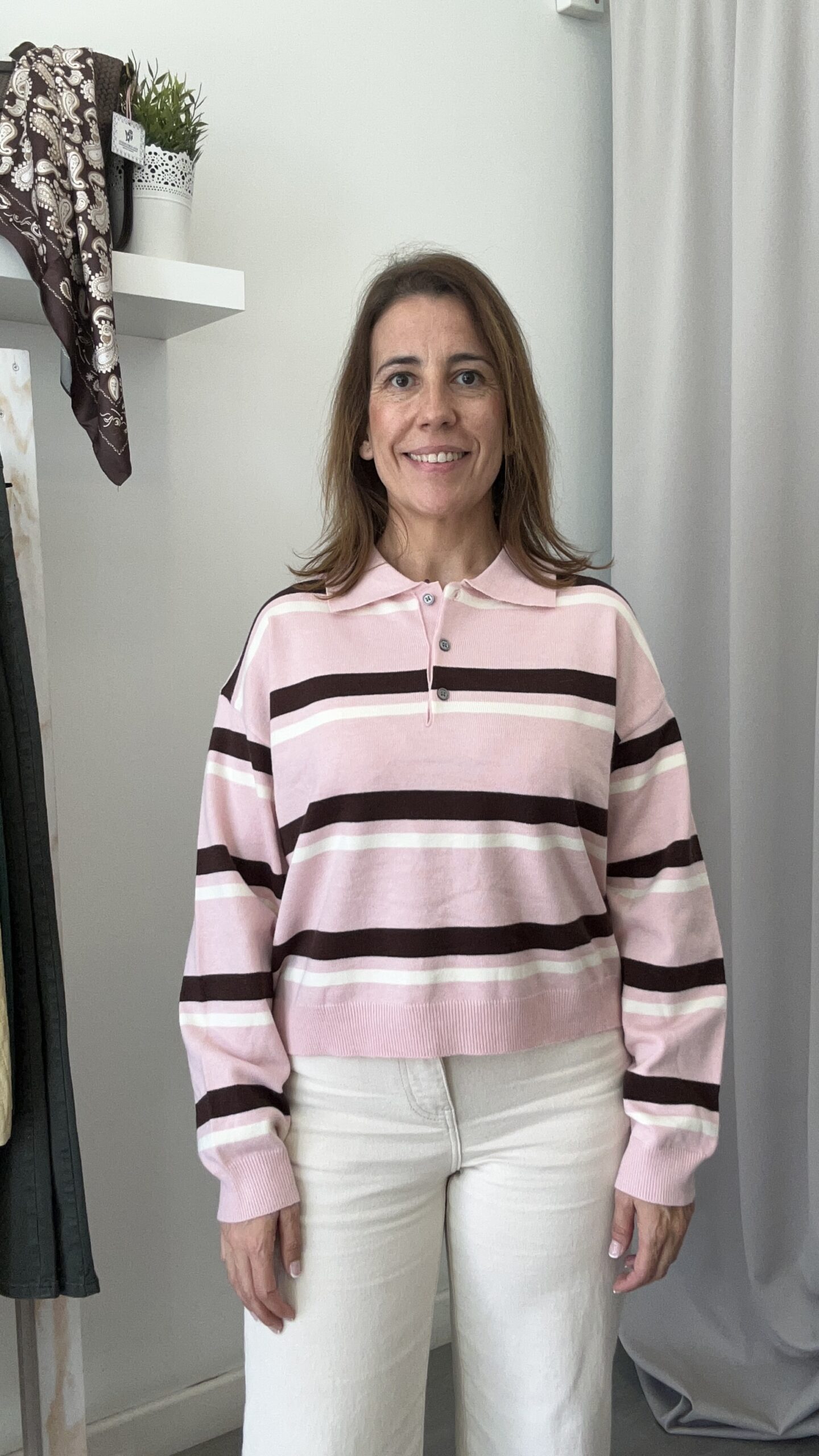 Suéter de manga larga y cuello tipo polo en rayas sobre fondo rosa. Talla única (desde la 36 hasta la 42). También disponible en Beige