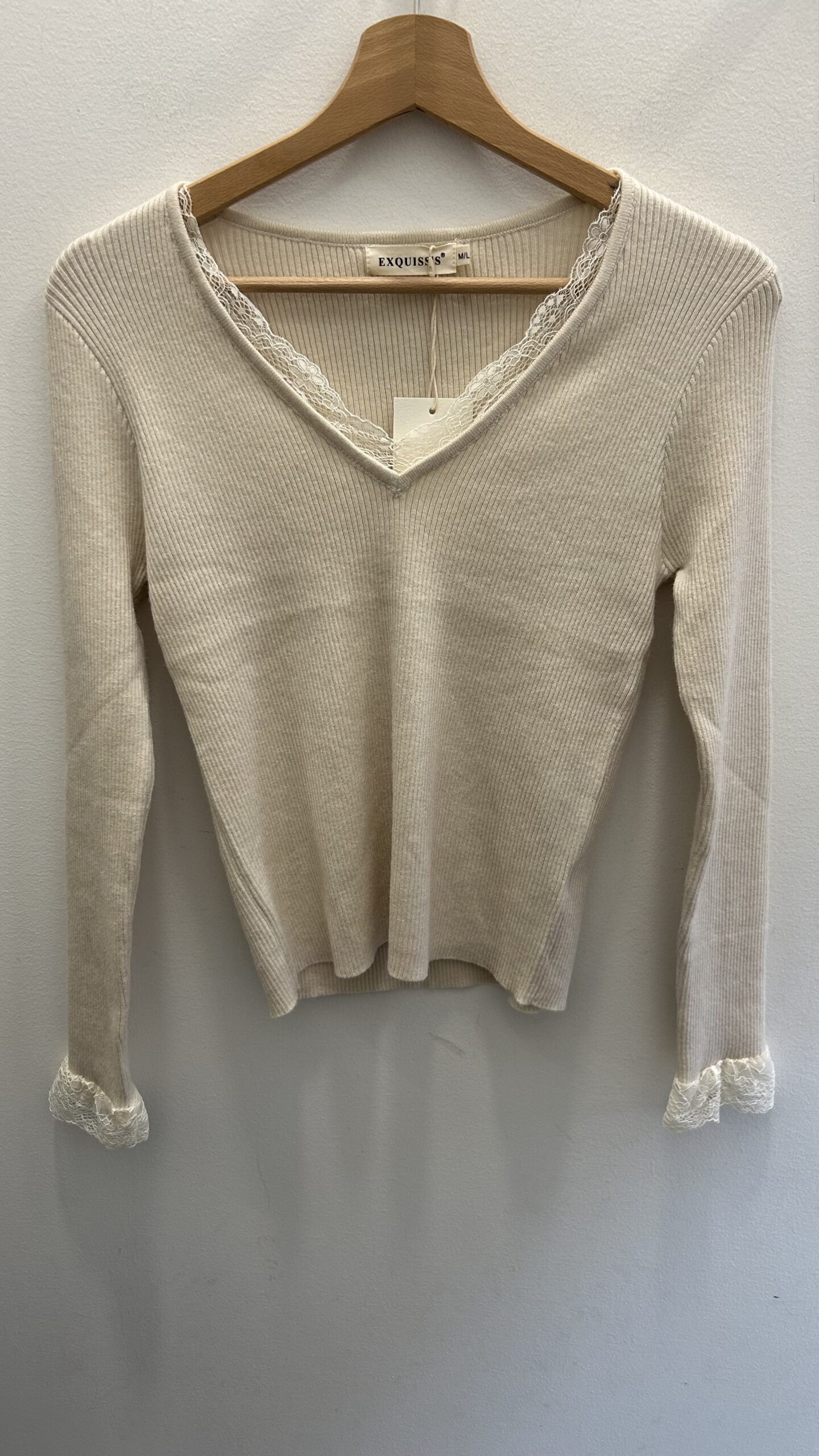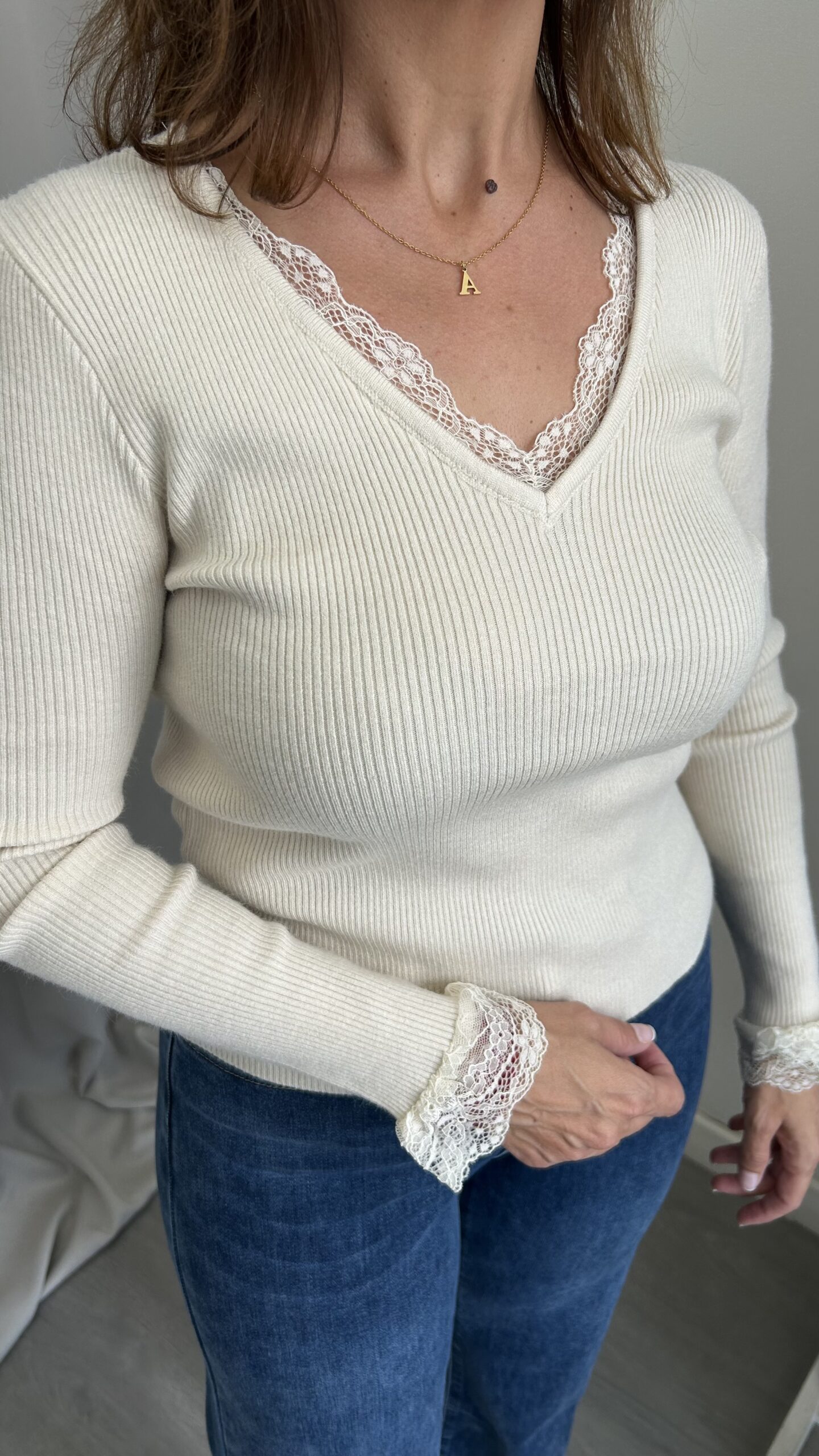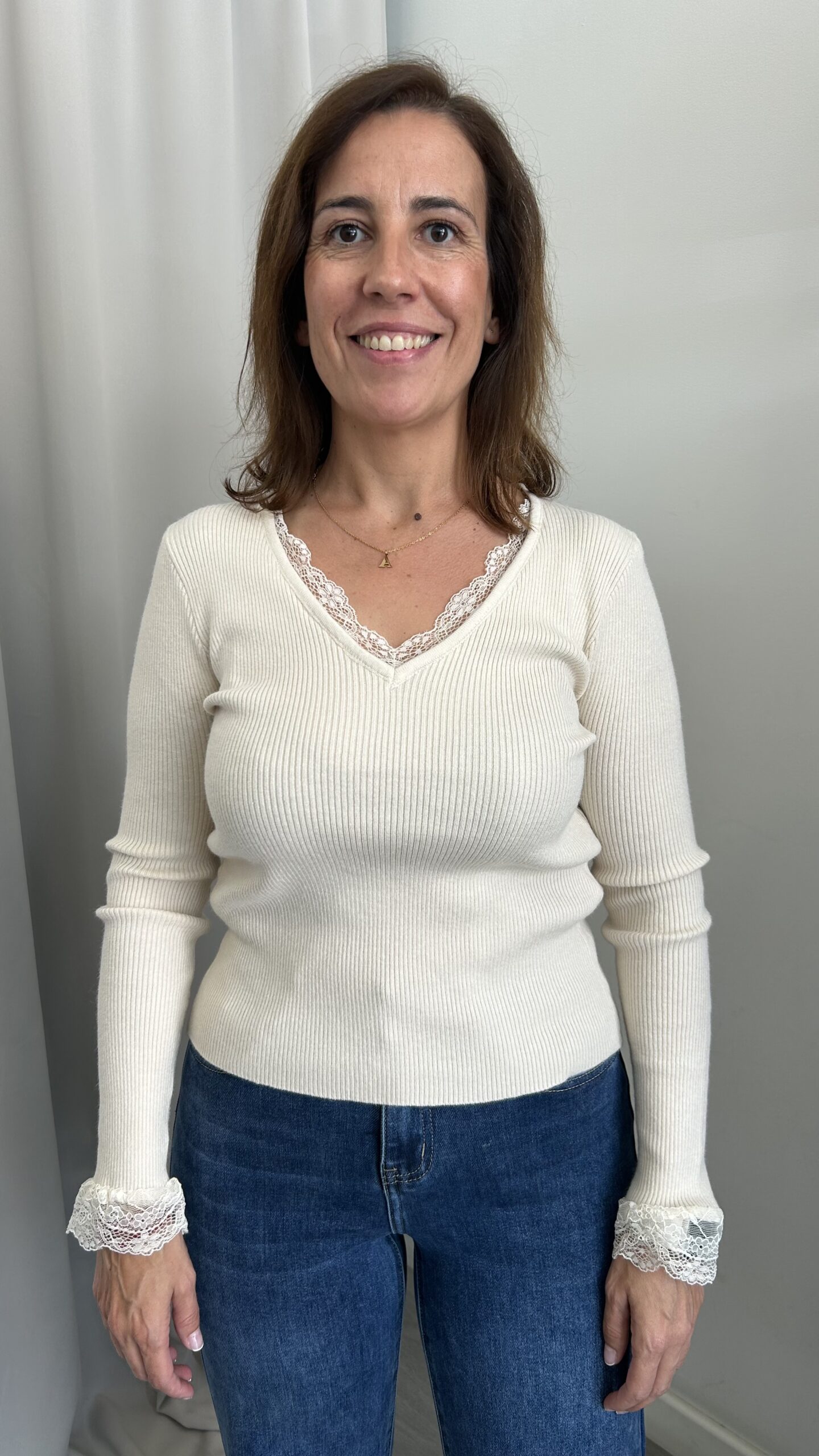 Suéter de punto en canalé con escote en pico. Puntilla en el borde del cuello y en los puños. Queda ajustado. Disponible también en Marrón