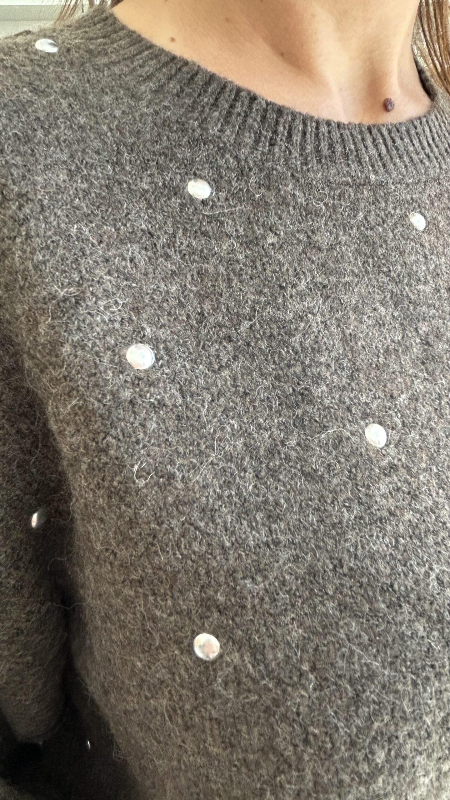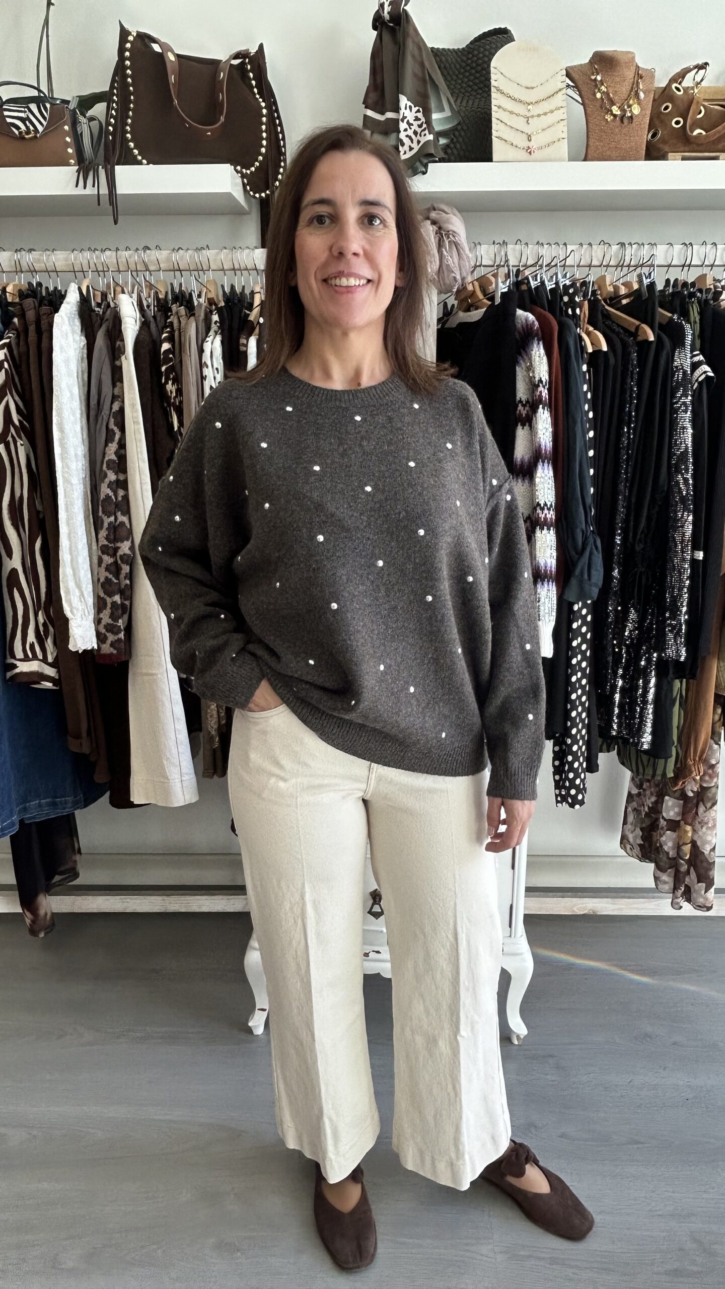 Suéter de manga larga y cuello redondo con tachas plateadas. Es gordito y ancho. Talla única (desde la 36 hasta la 44).