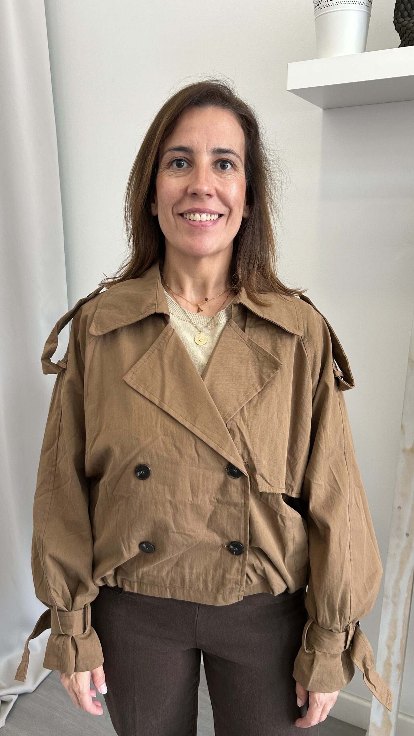 Trench corto cruzado con doble botonadura. Trabillas en los hombros y puños. La parte inferior queda bombacha. Bolsillos a los lados. Talla única (desde la 36 hasta la 40). Disponible también en Camel