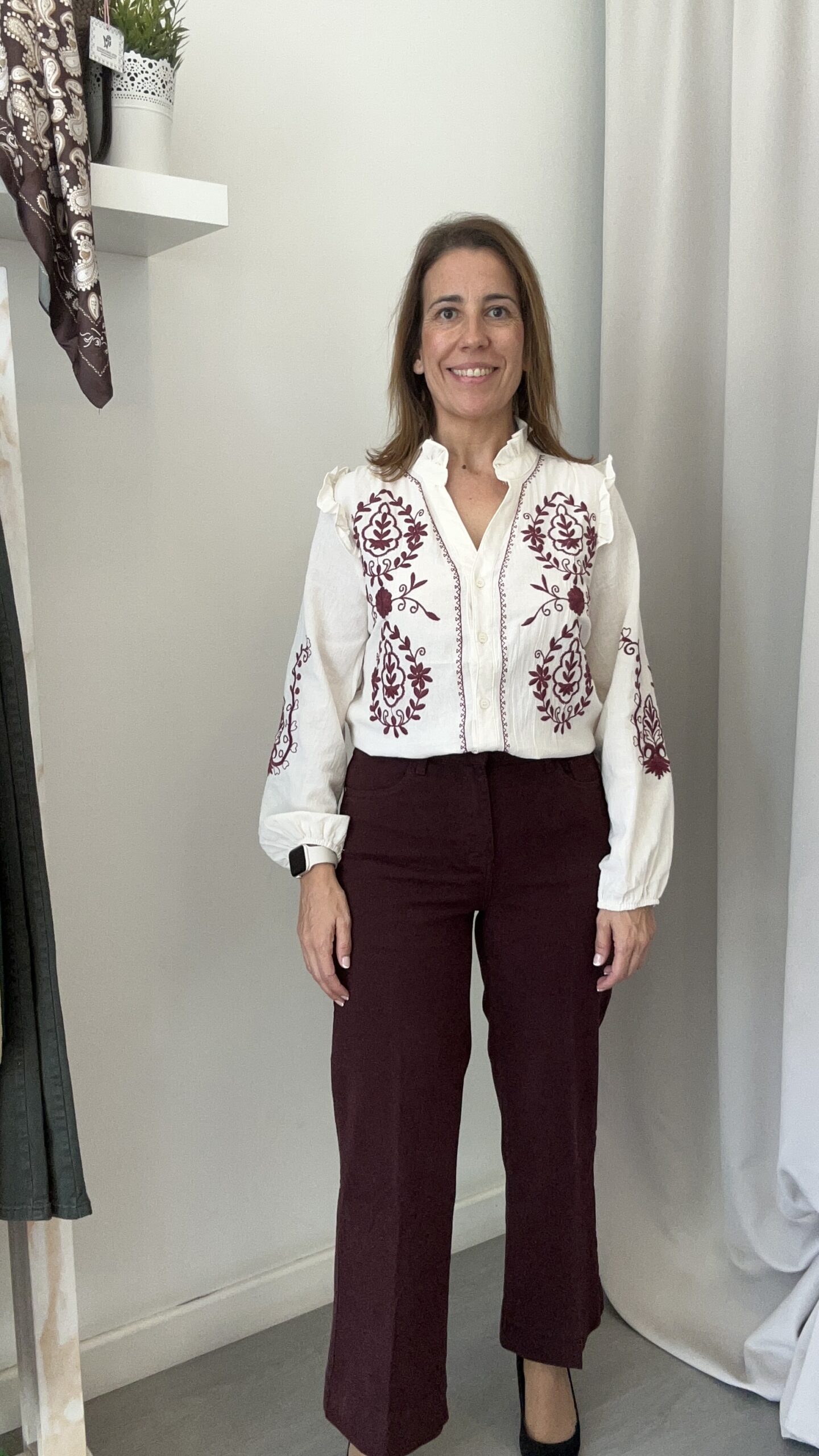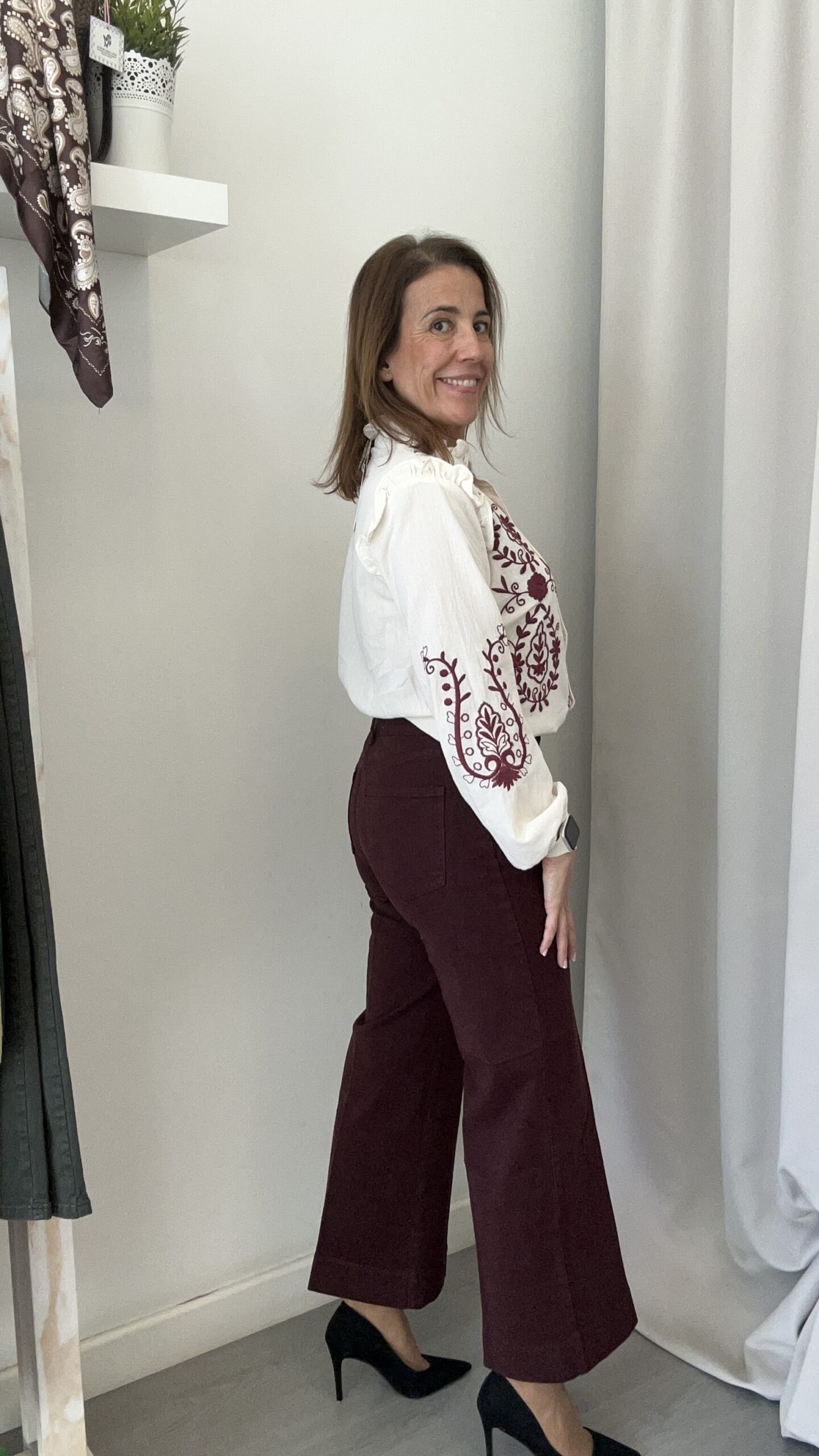 Pantalón vaquero con cinco bolsillos de pata ancha. Tiro alto y largo hasta el tobillo. Disponible también en negro Caqui y Crudo